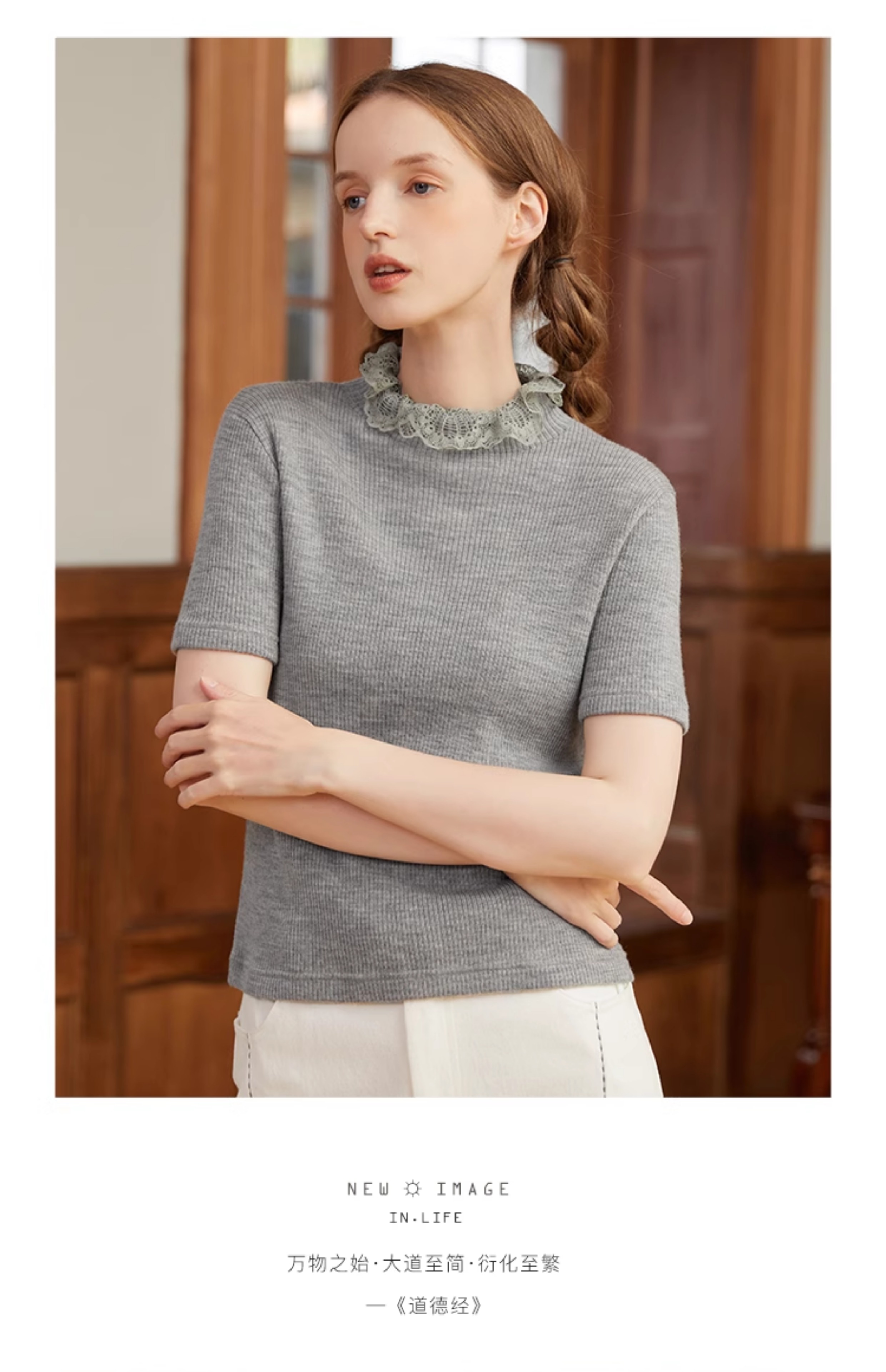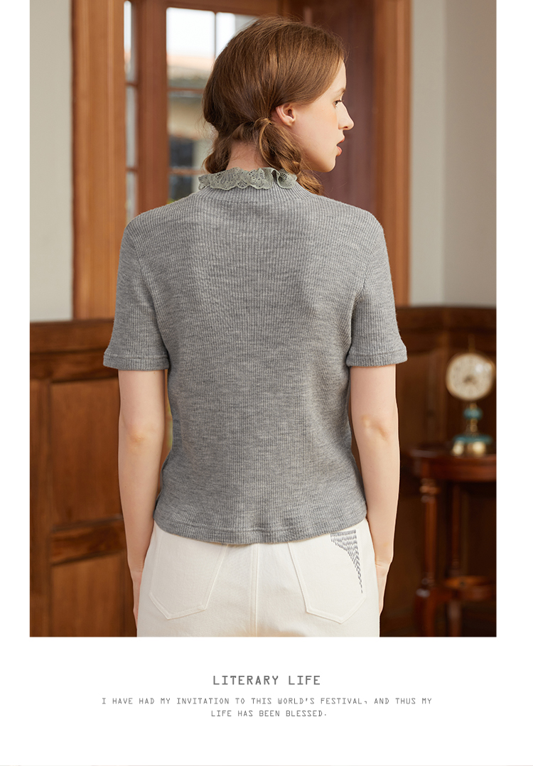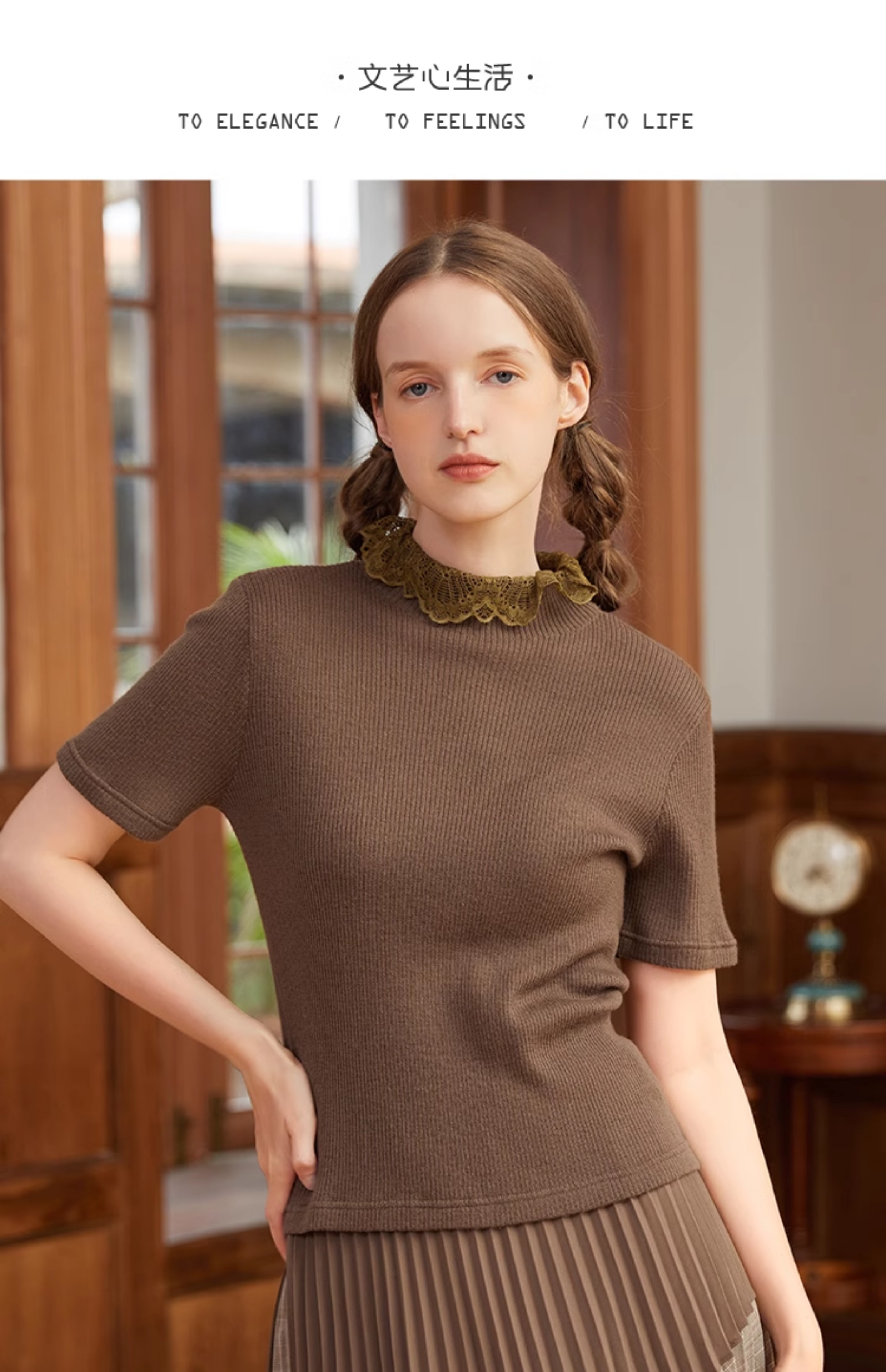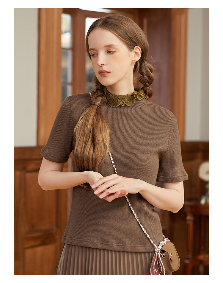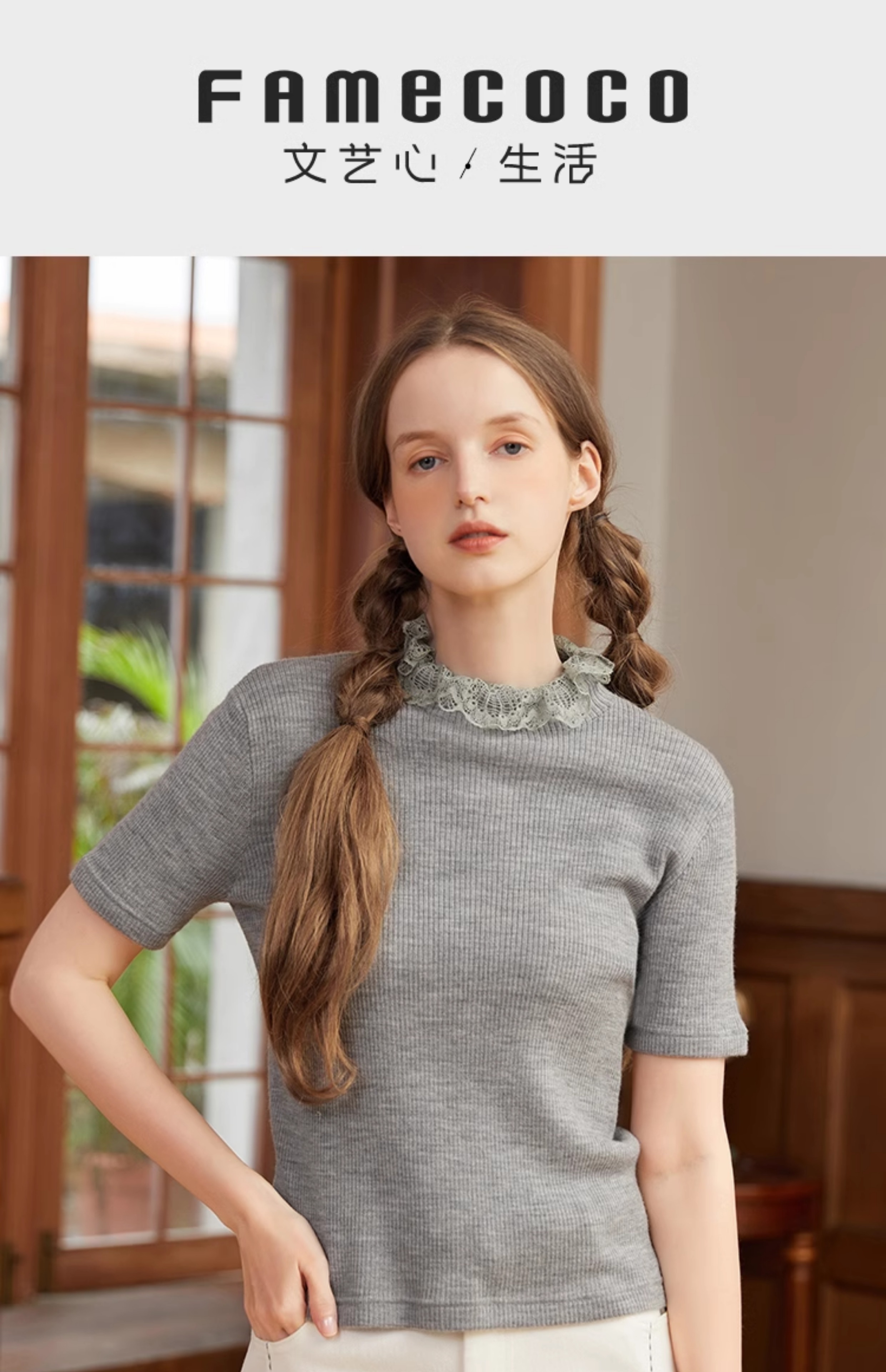 Famecoco范可儿复古蕾丝半高领短袖针织衫绵羊毛上衣D195DB301