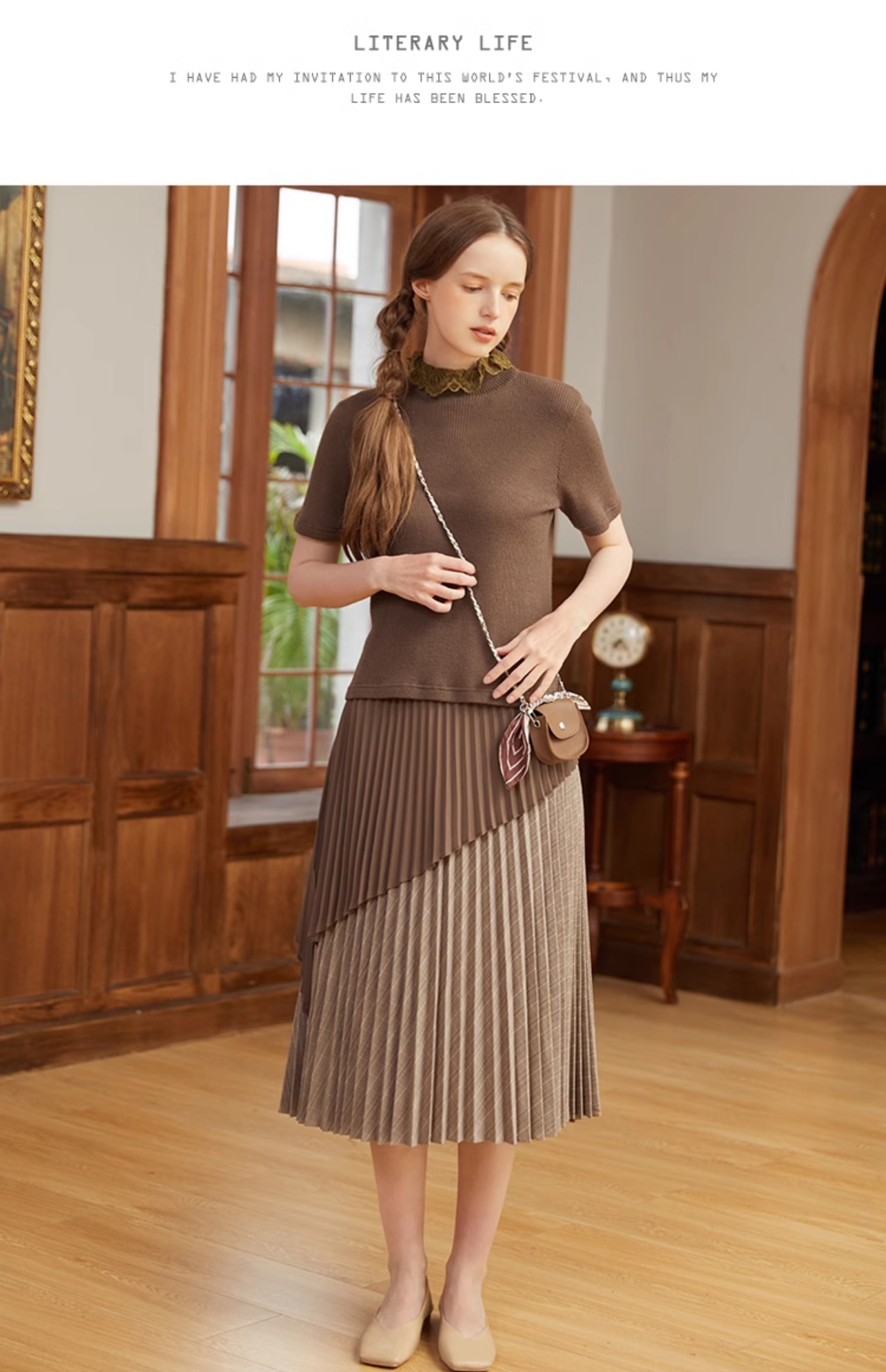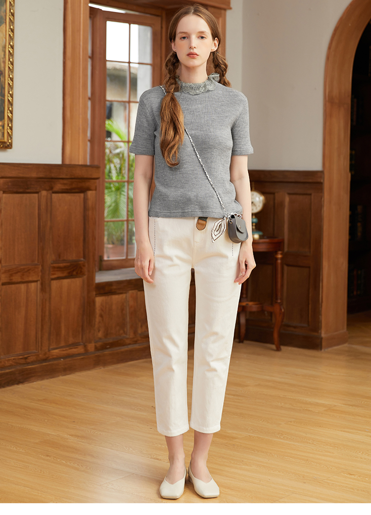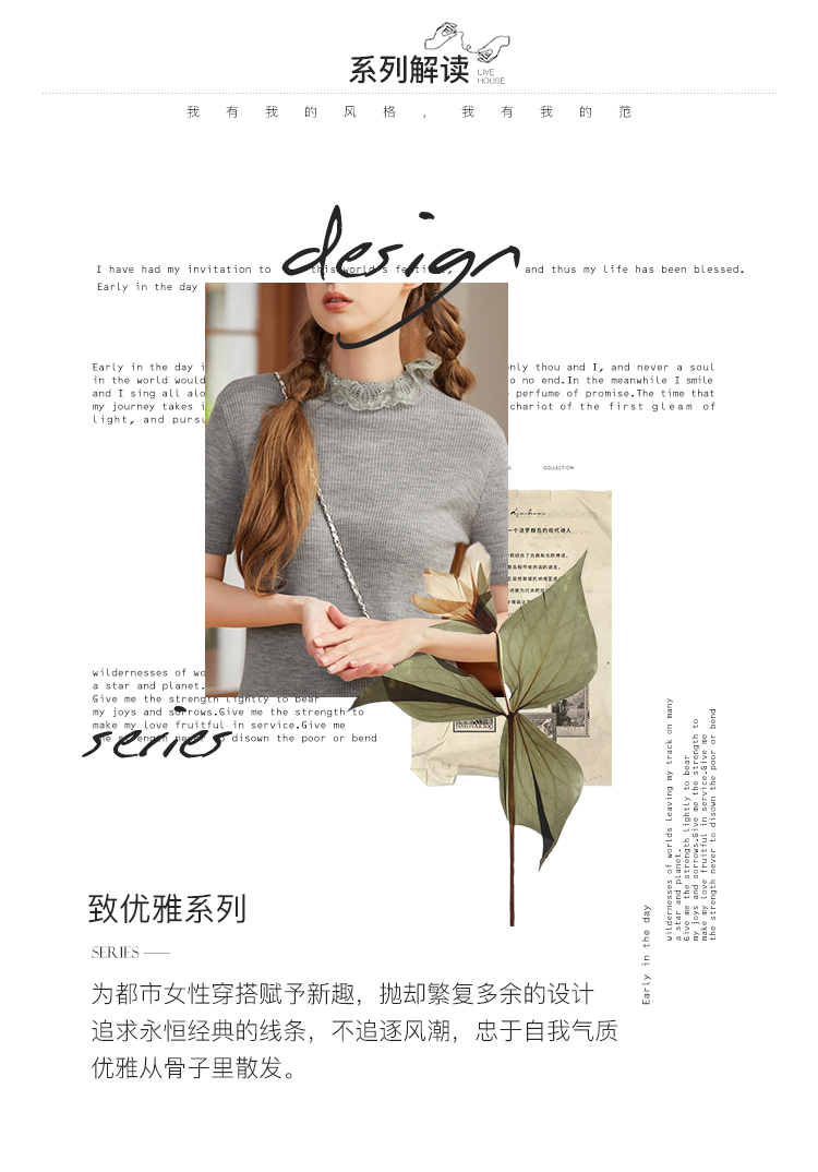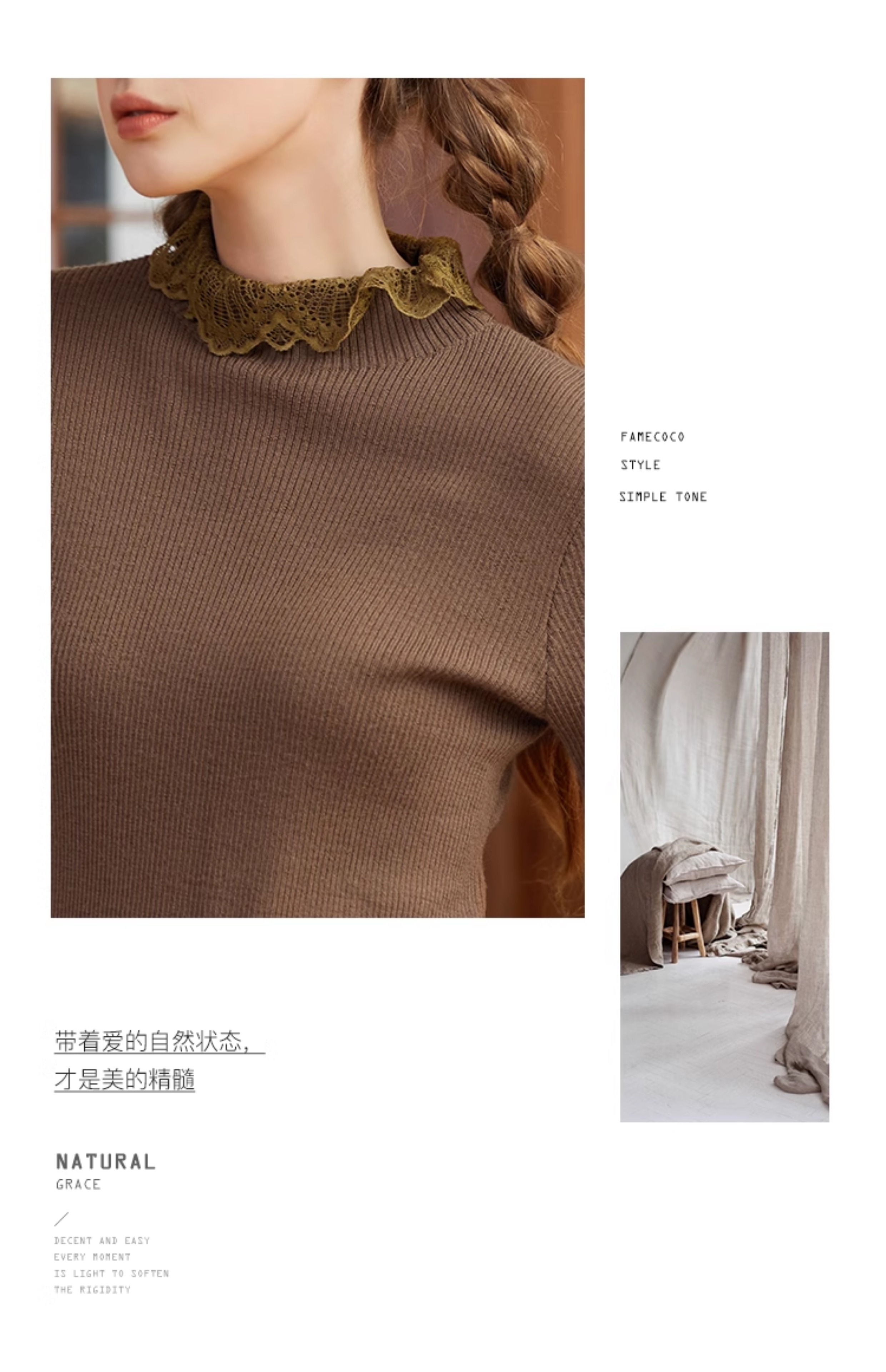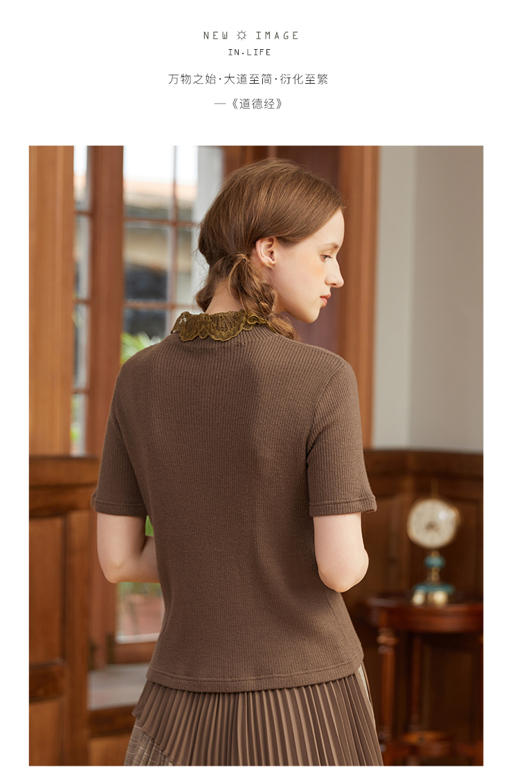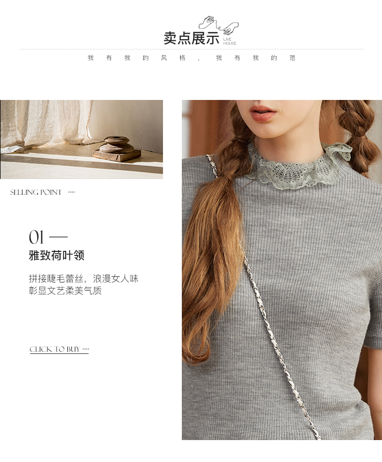 Famecoco范可儿复古蕾丝半高领短袖针织衫绵羊毛上衣D195DB301