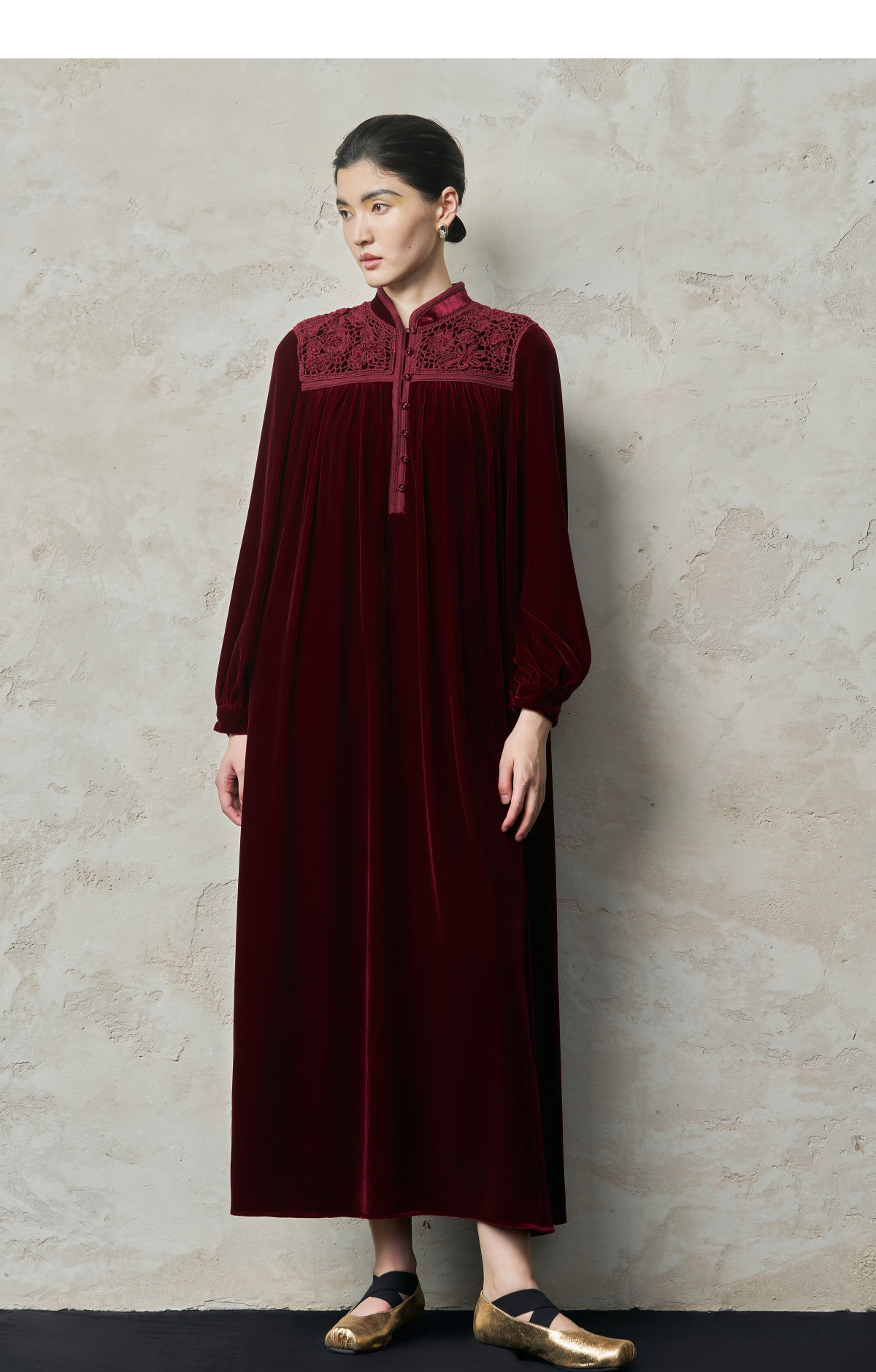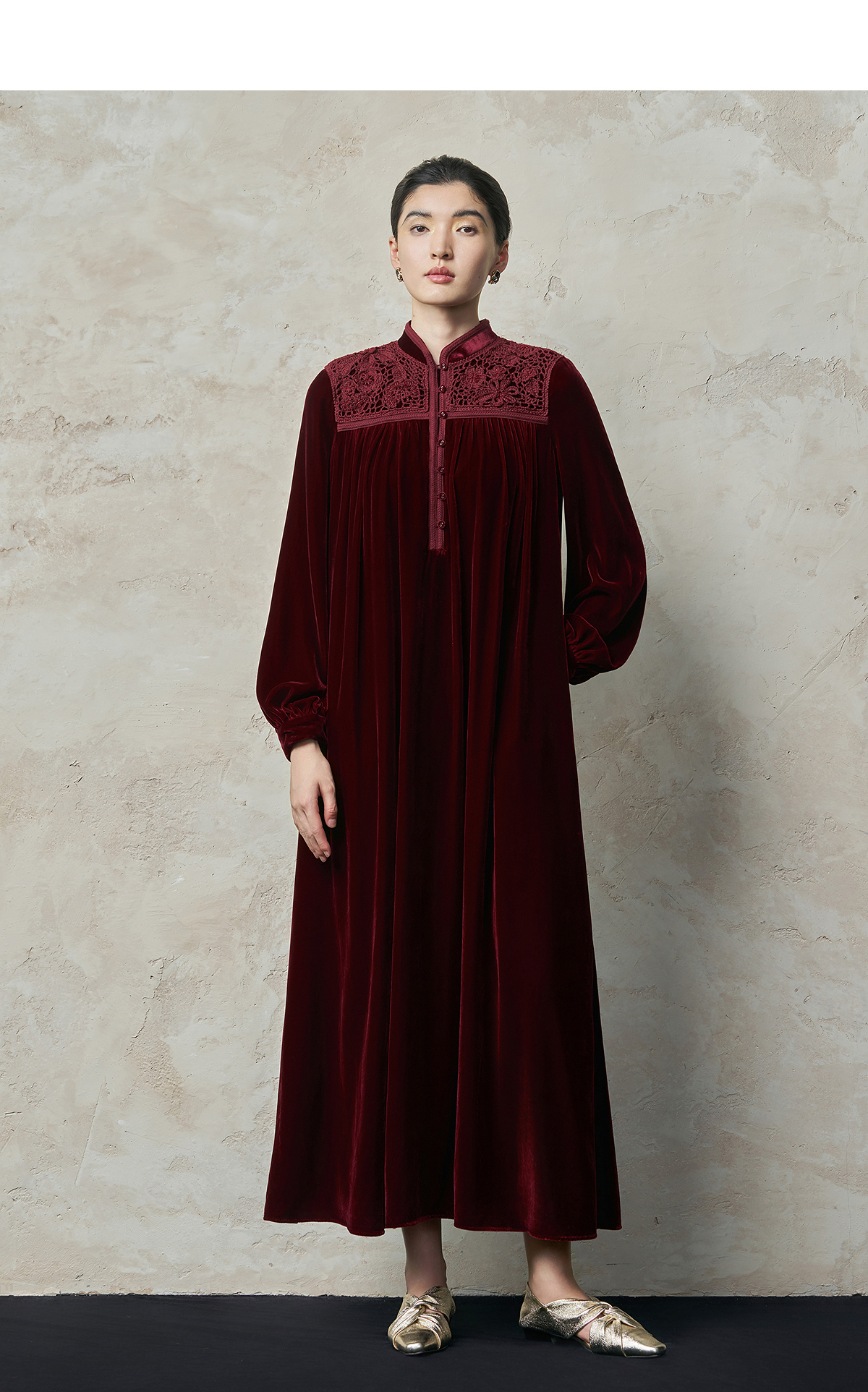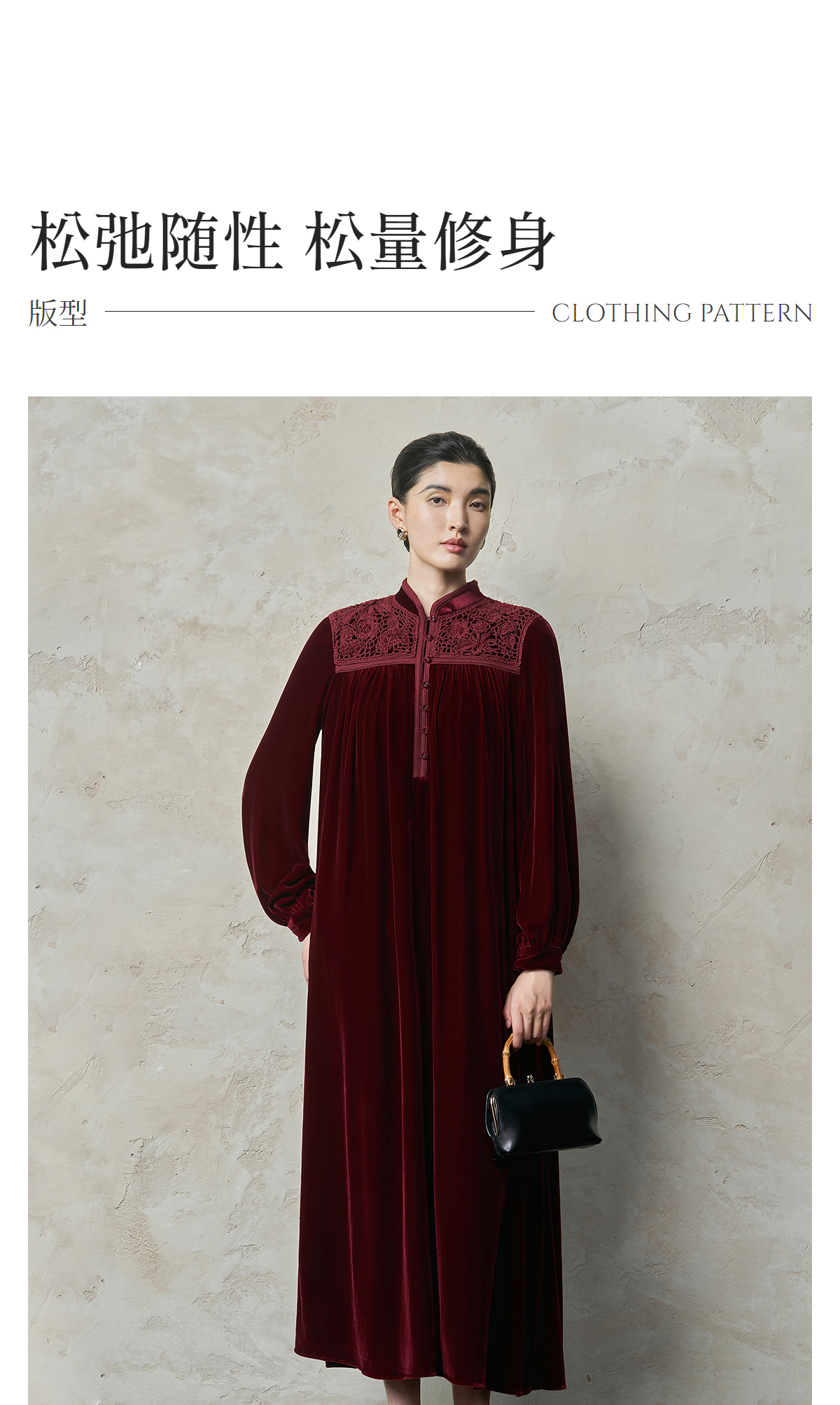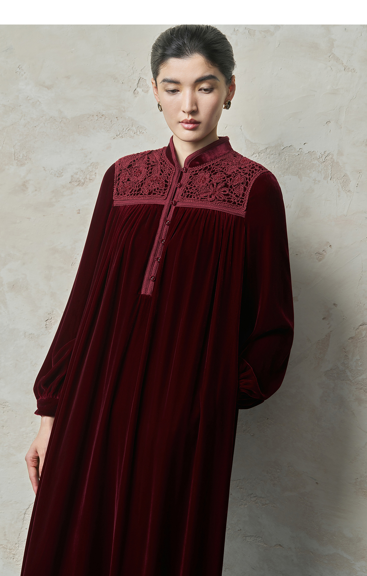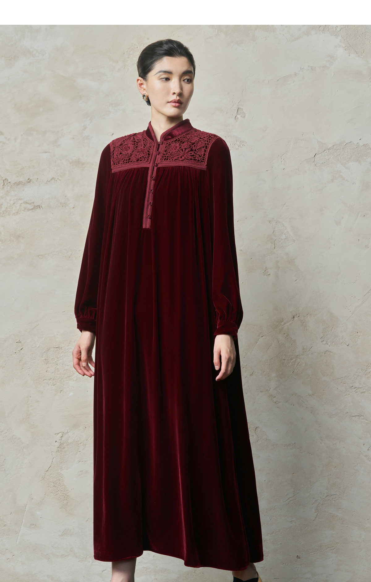 【林栖设计小店】(现货)【手工钩花】酒红连衣裙手工串珠2025秋冬新款宽松长裙女1954024B