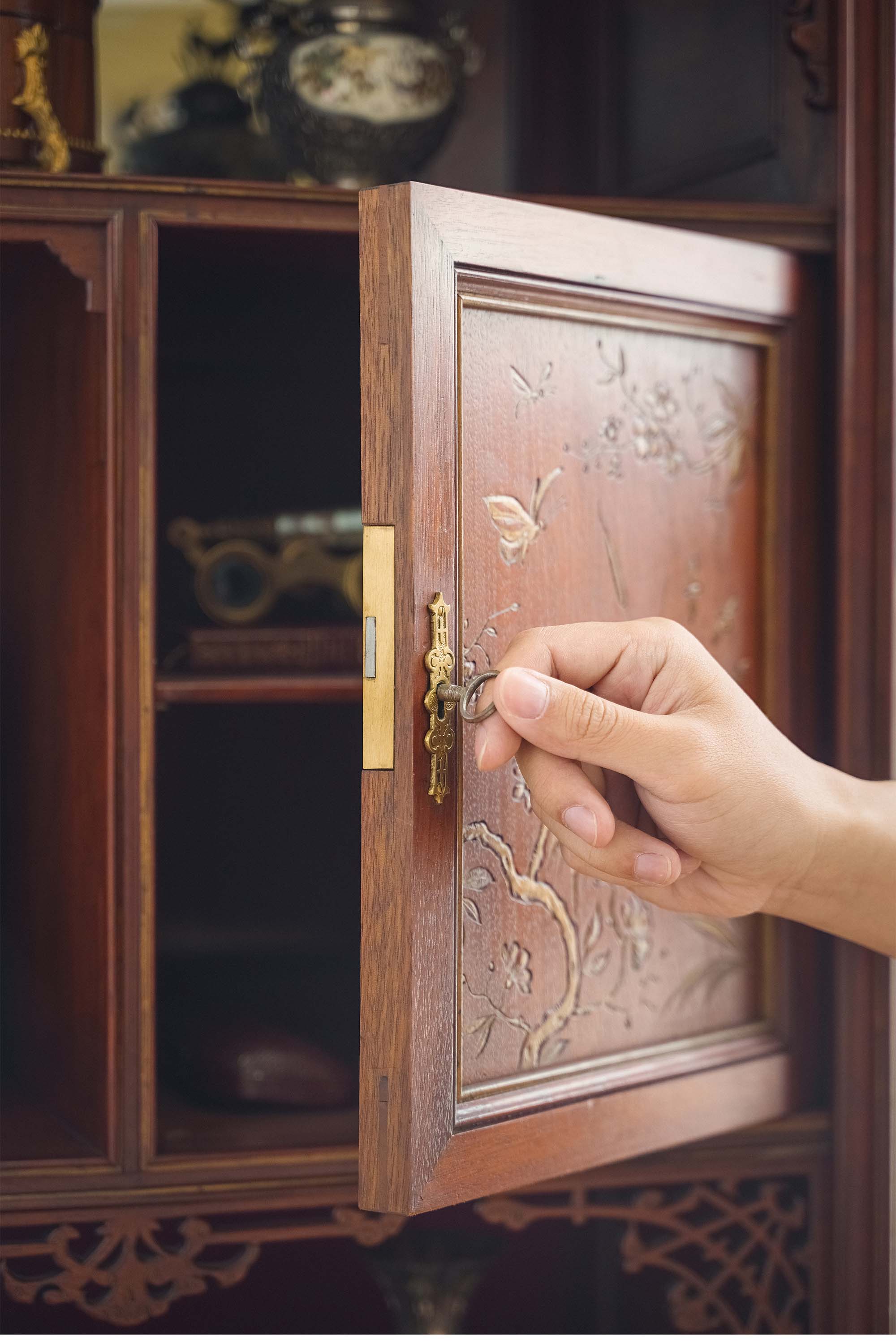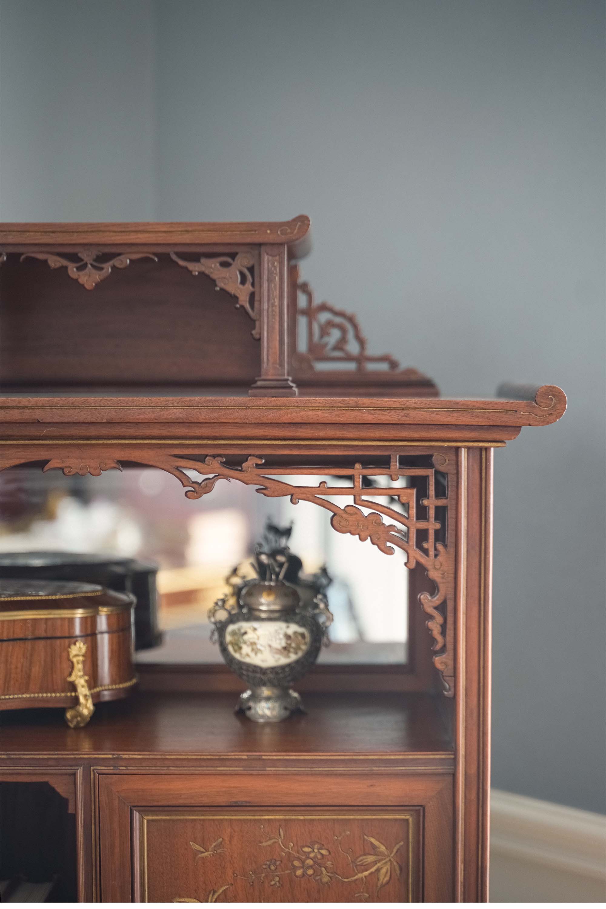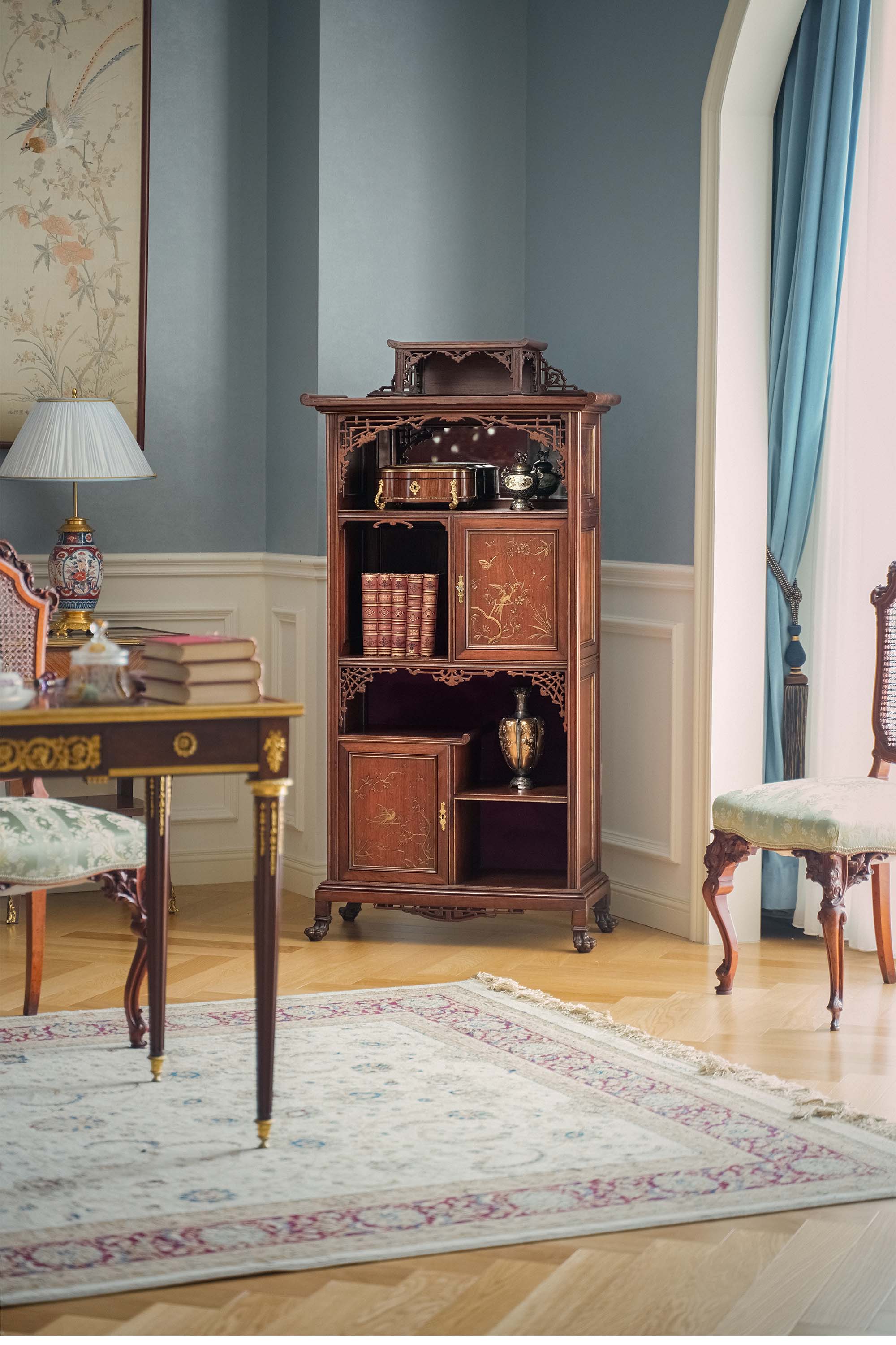 独角鹿西洋古董 19世纪末法国出品VIARDOT东方风格花鸟飞蝶主题梧桐木精雕多宝阁式展柜