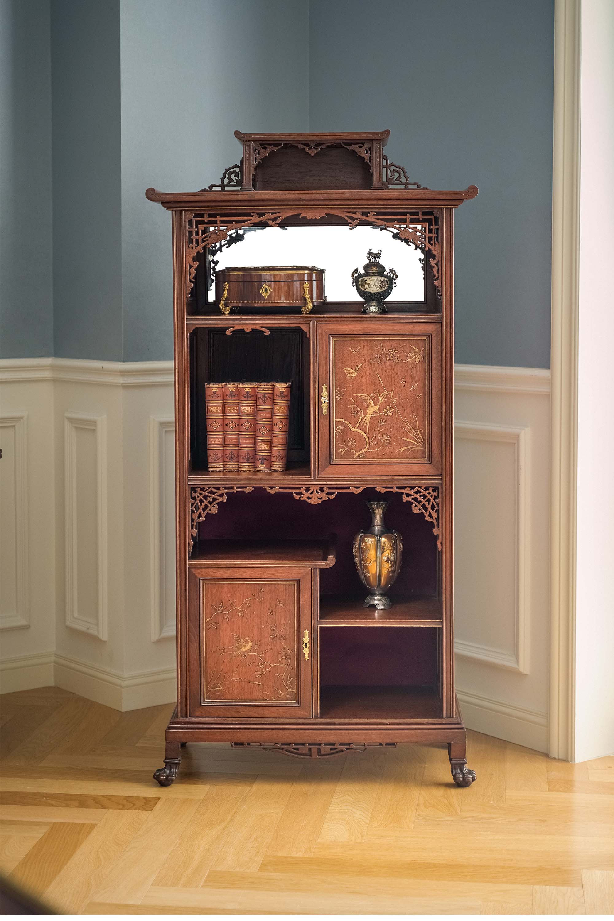 19世纪末法国出品VIARDOT东方风格花鸟飞蝶主题梧桐木精雕多宝阁式展柜