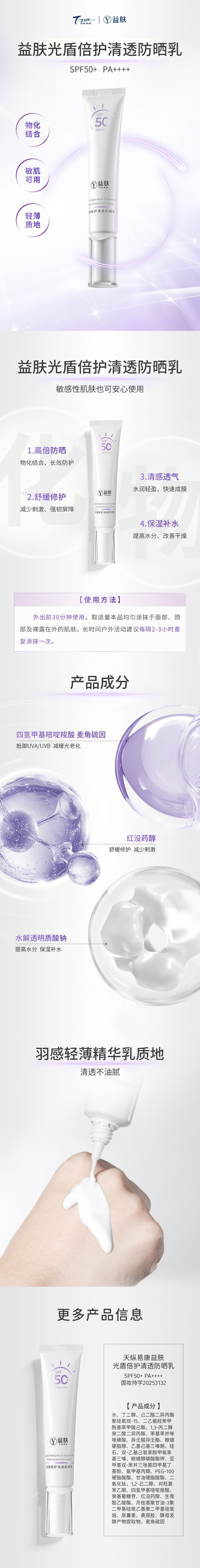 益肤光盾倍护清透防晒乳防晒霜SPF50+ PA++++高倍防晒
