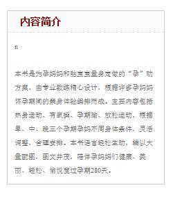 Part 1 做个阳光“孕”动的准妈妈 01一.准妈妈运动新知 02【一 孕期运动的理由 】 02【二 孕期身体变化对运动的影响】 03【三 孕妈妈运动,将健康进行到底 】 05 n二、安全理性地运动 08【一 孕期三阶段运动指导】 08【二 孕妈妈“孕”动准备】 12 nPart 2 快乐健身堂——美丽孕期,动起来! 15一、“孕” 动妈妈热身篇 16二、保胎安产活力有氧健身操 281.怀孕的阶段:周——3周 28 2.怀孕的第二阶段:4周——第28周 343.怀孕的第三阶段:第28周以后 48三、孕妈妈十月瑜伽生活馆 591.怀孕的阶段:周~3周 592.怀孕的第二阶段:4周~第28周 703.怀孕的第三阶段:第28周以后 78四、“孕”动休息室——孕妈妈放松操 91 nPart 3 安心怀孕,关注母体健康 97一、孕期疼痛知多少 98二、职业孕妈妈孕期对策 100三、孕妈妈温馨交流 1011.饮食习惯上 1012.日常行为上 1023.身体状态上 103 nn |