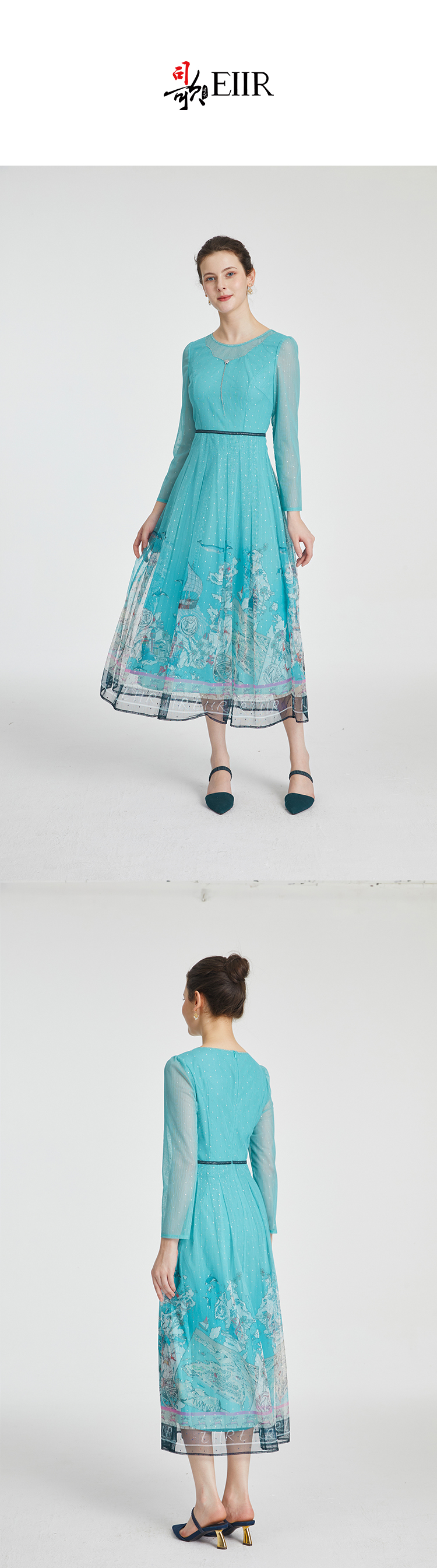 司歌飘逸网纱印花长袖连衣裙收腰A881067
