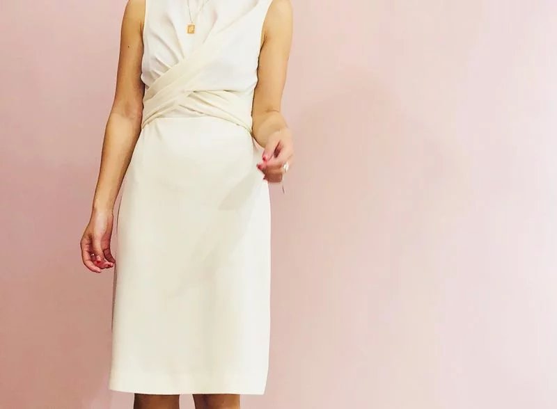 以纯白修身设计完美诠释了女性的优雅高贵。别具巧思地由胸前延展出系带,交叉系于身后,于腰间形成褶皱,展现迷人腰肢,特别适合在干练优雅的职场或宴会场合间随意切换。