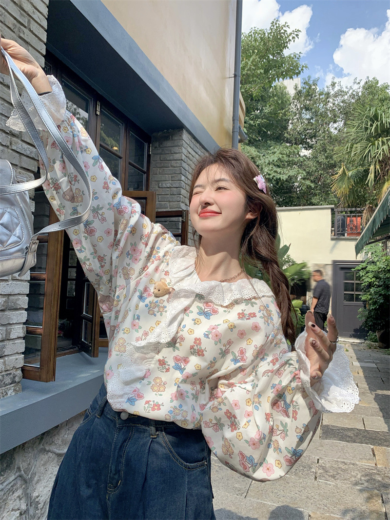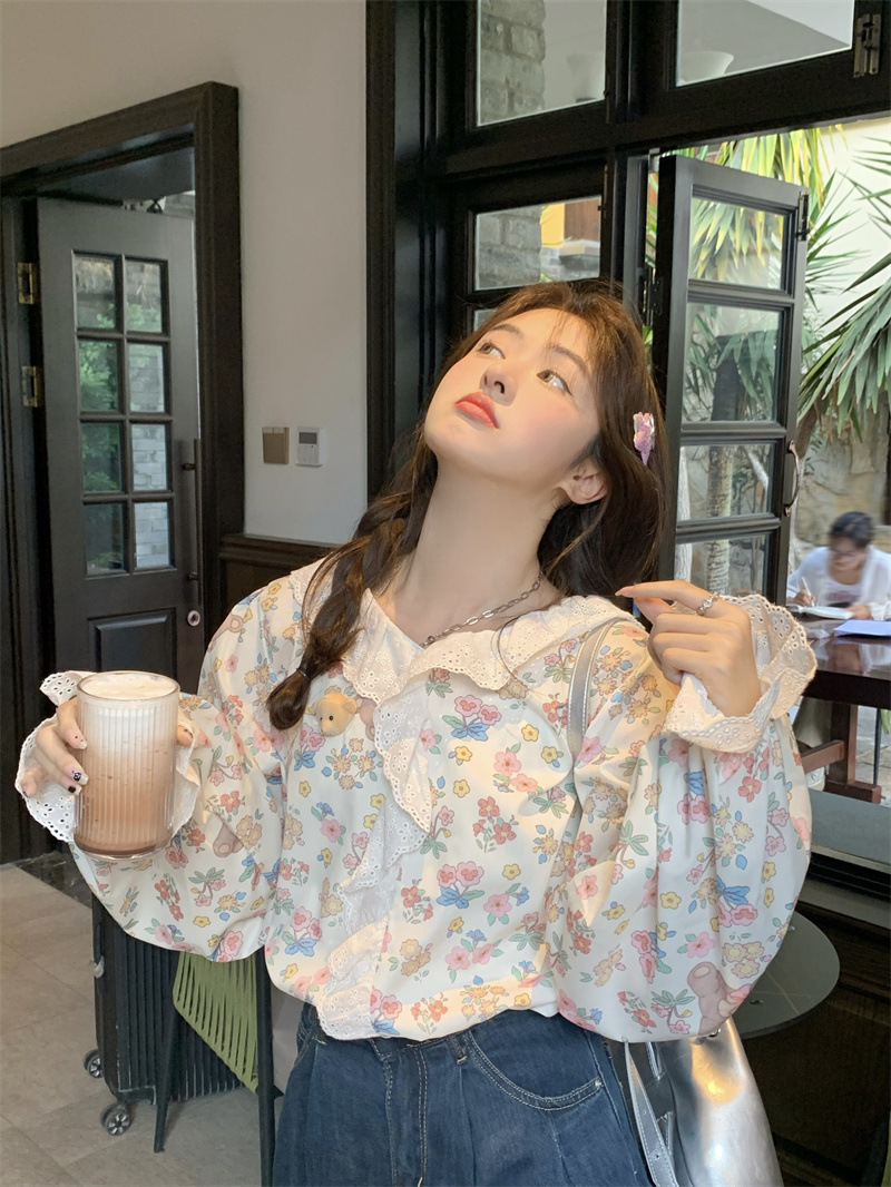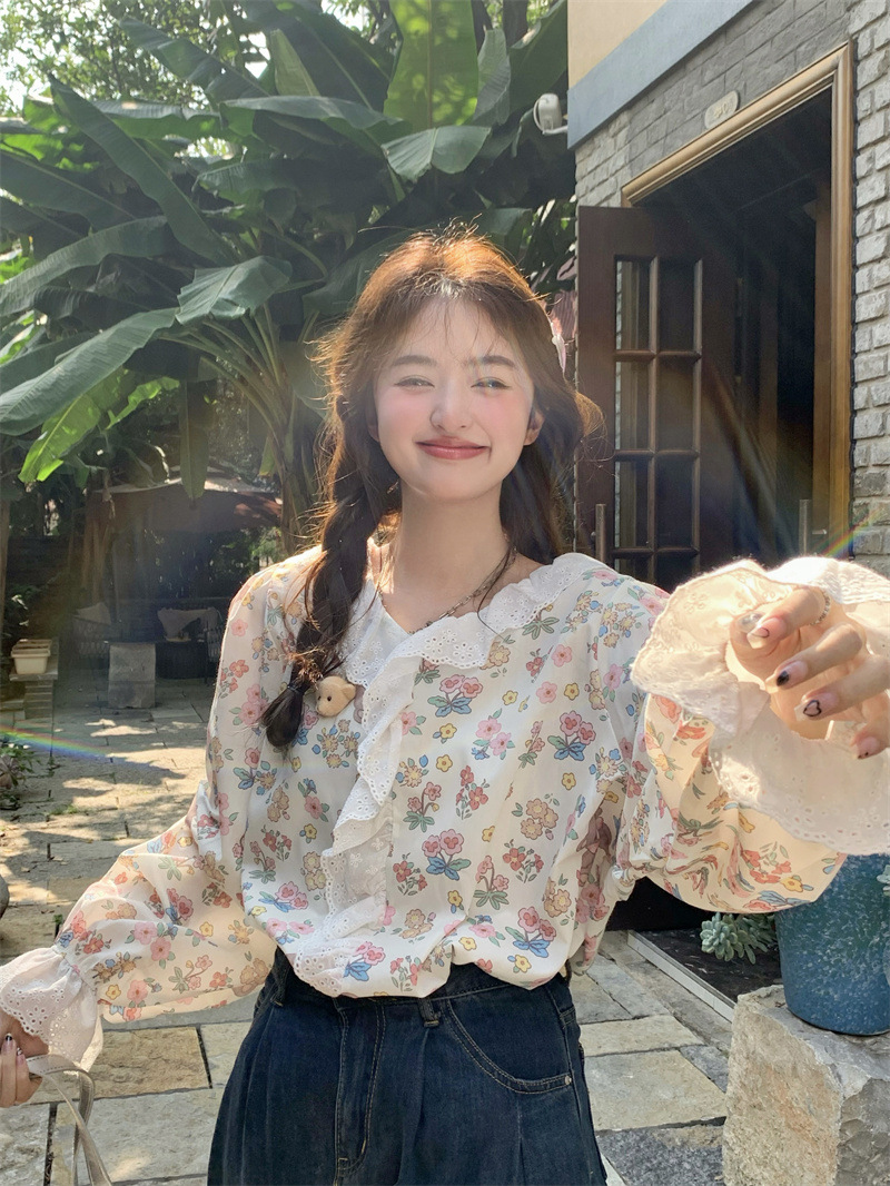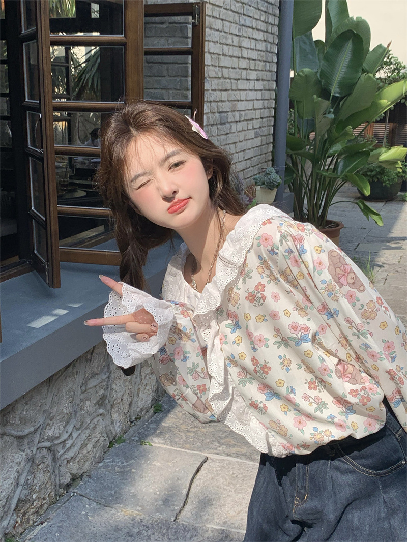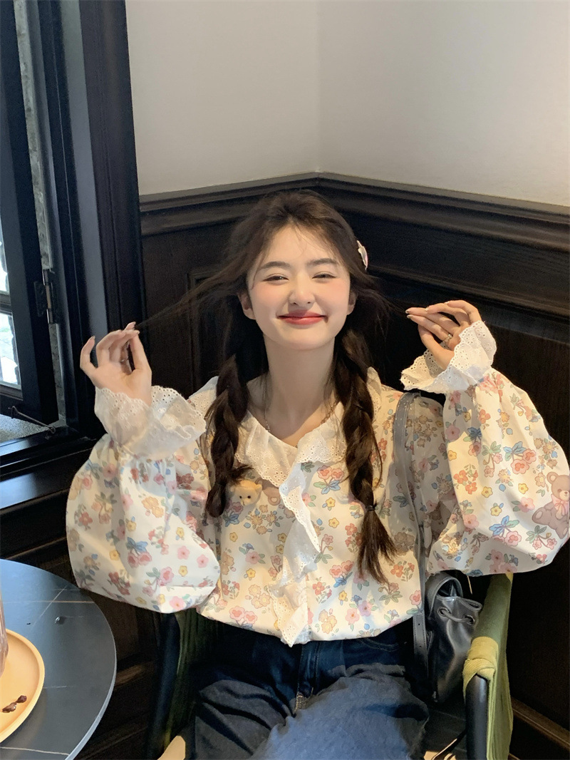 春秋季【花边拼接 木耳边碎花 长袖衬衫女】宽松立体 可爱小熊 甜美减龄花边上衣