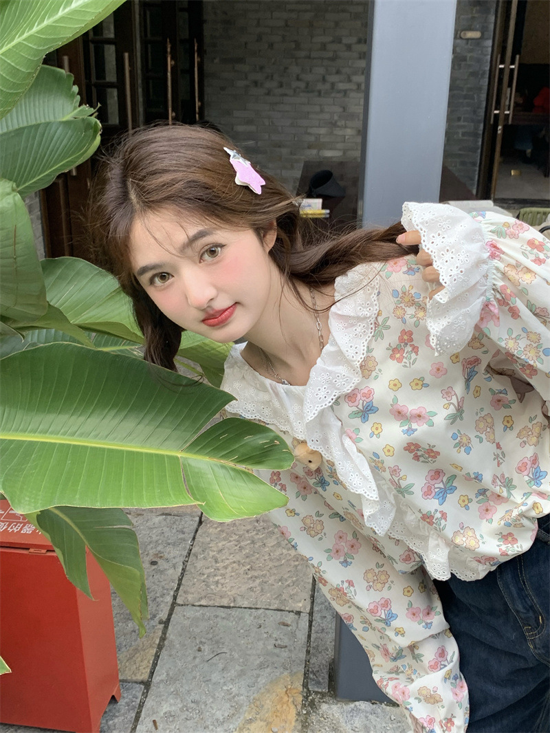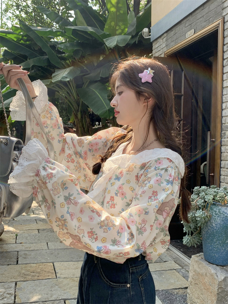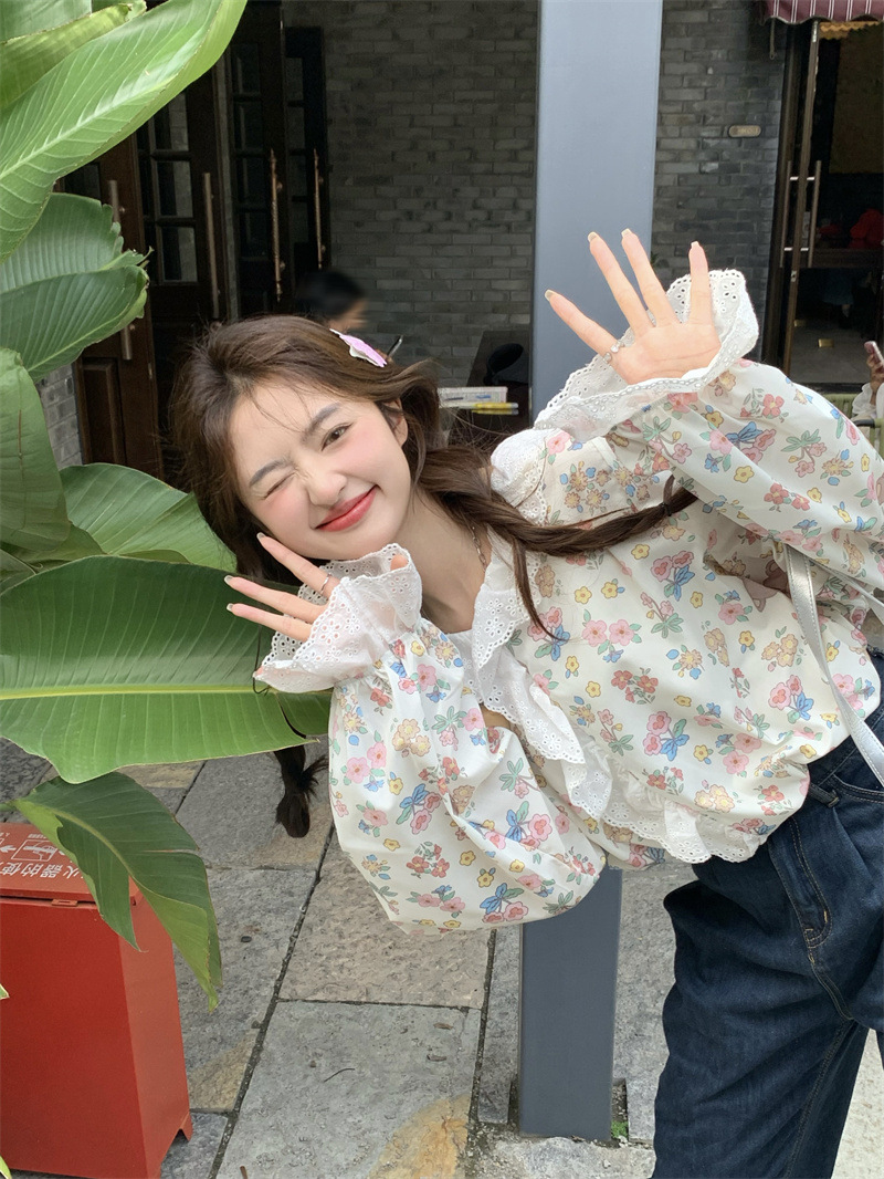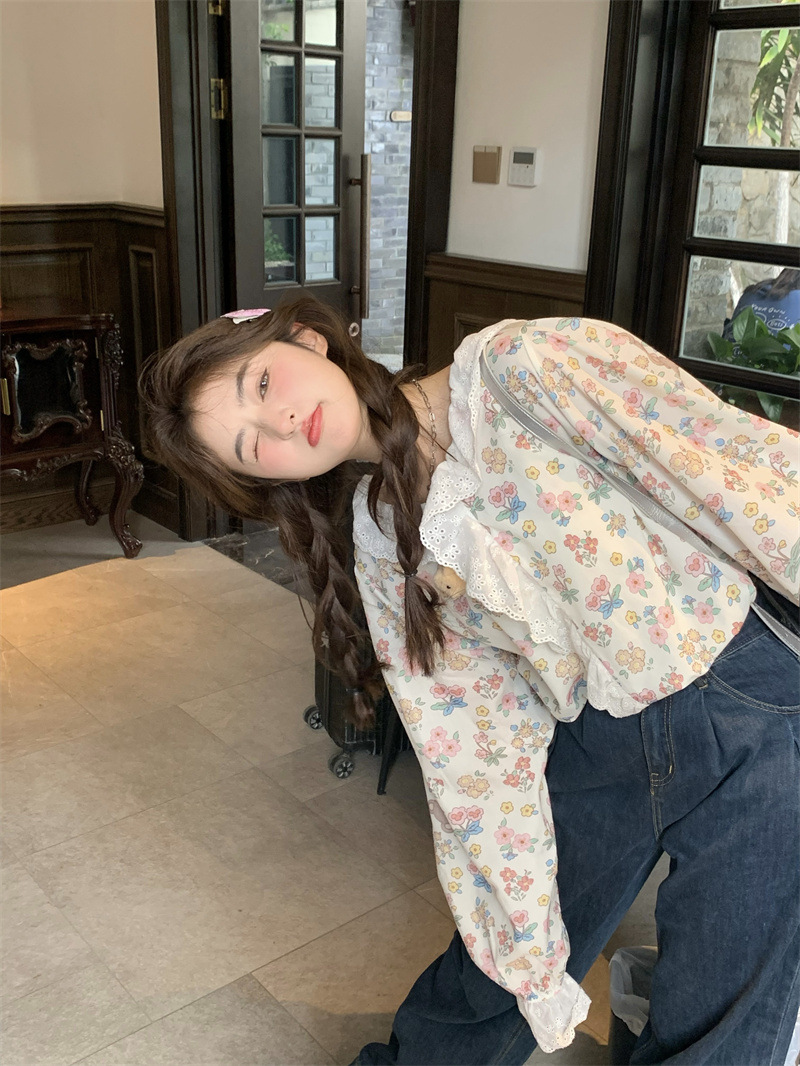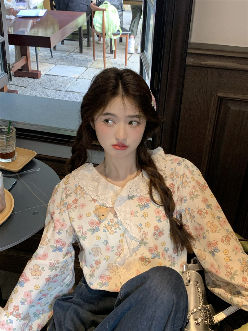 春秋季【花边拼接 木耳边碎花 长袖衬衫女】宽松立体 可爱小熊 甜美减龄花边上衣