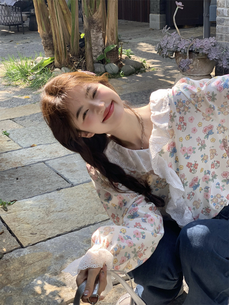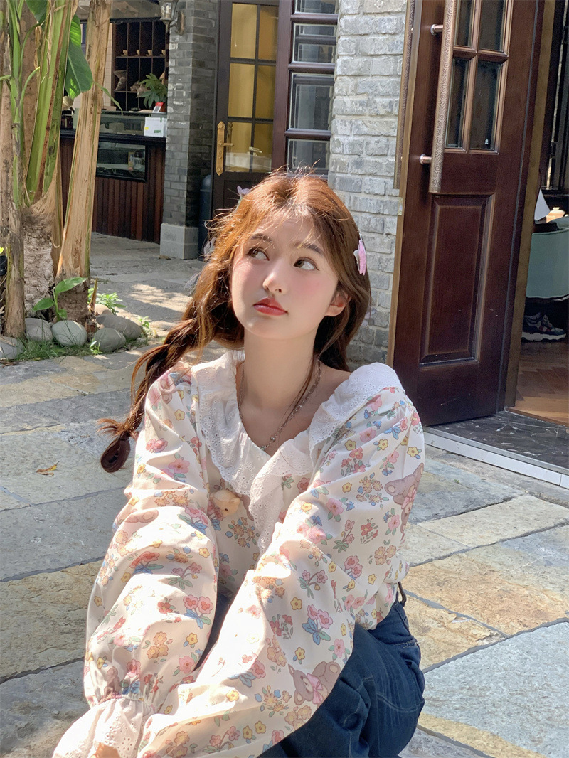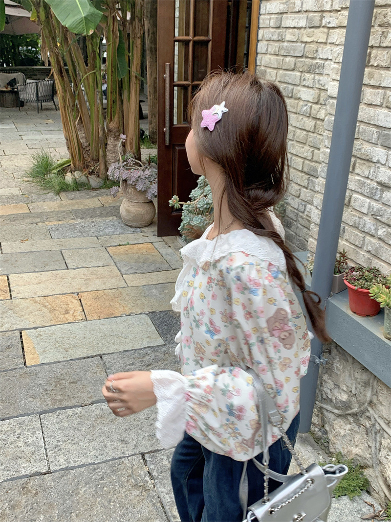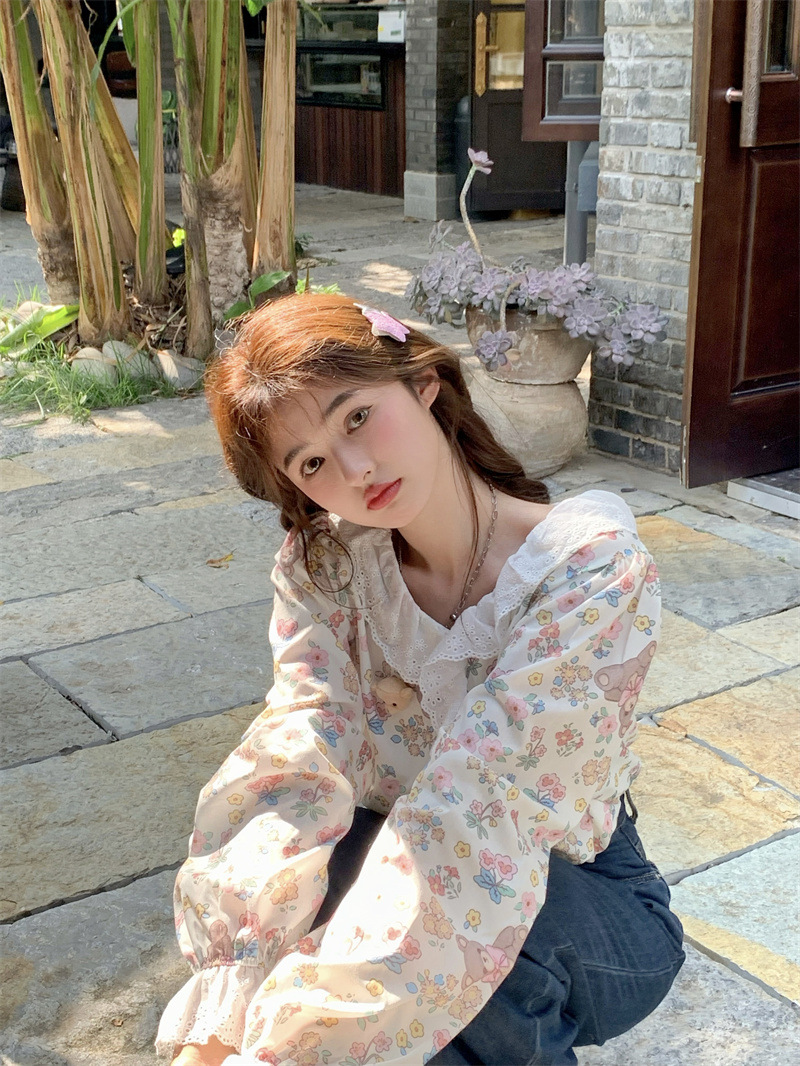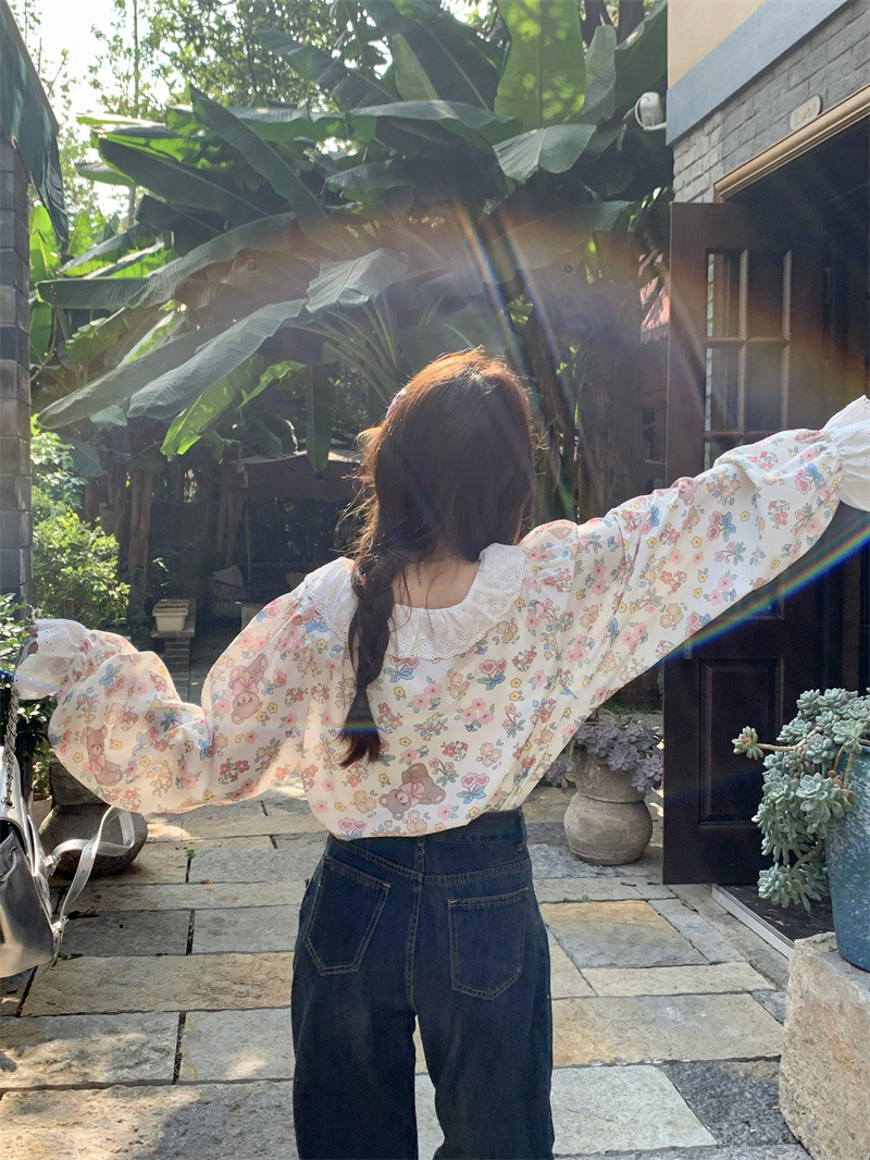 春秋季【花边拼接 木耳边碎花 长袖衬衫女】宽松立体 可爱小熊 甜美减龄花边上衣