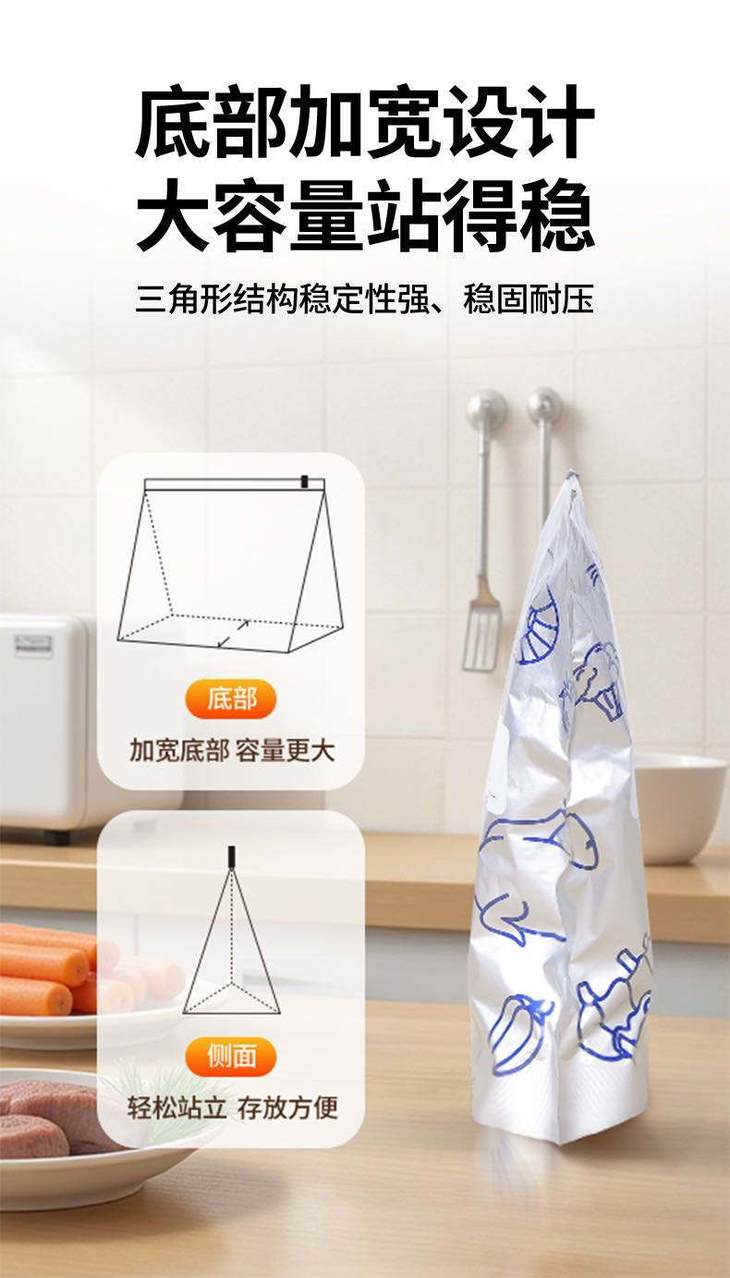 底部加宽,稳稳站立: 袋子底部特意加宽 放在冰箱里稳稳当当 不占空间还规整 再也不用担心翻找东西时袋子倒下 “雪崩” 了