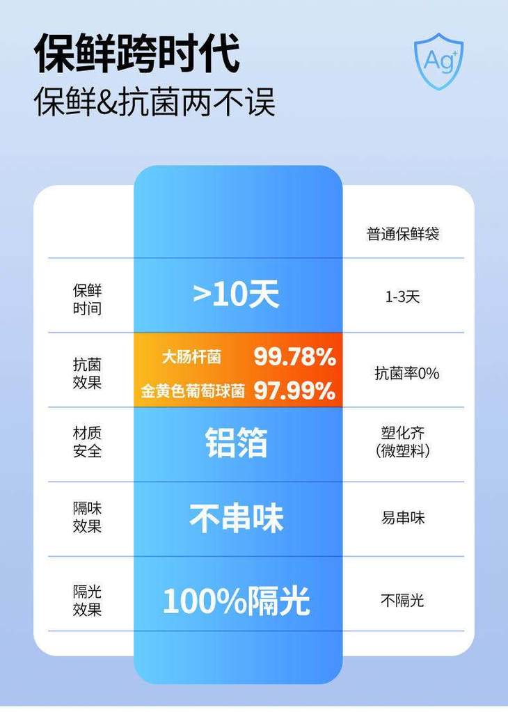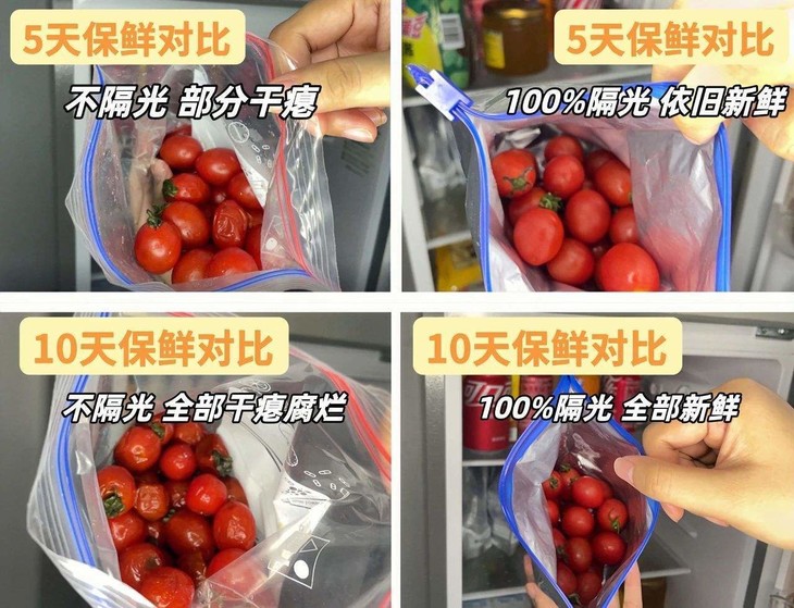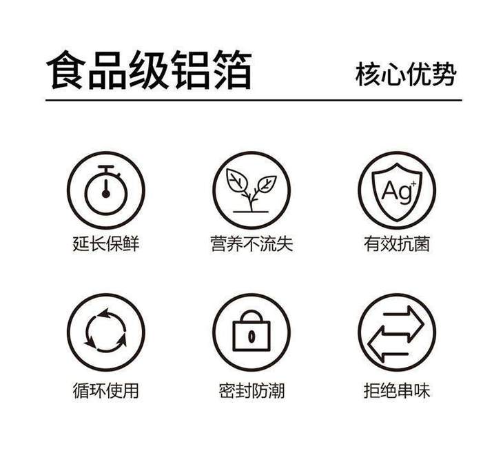 非常适合家庭日用 铝箔——为食品新鲜加把锁 对水、气、光、菌具有超强阻隔能力 装生肉、海鲜也不怕,杜绝变质风险 立体滑锁,100% 隔光隔空气 可锁鲜延长7-10天 水果放一周还水灵灵 蔬菜也不发黄发蔫!