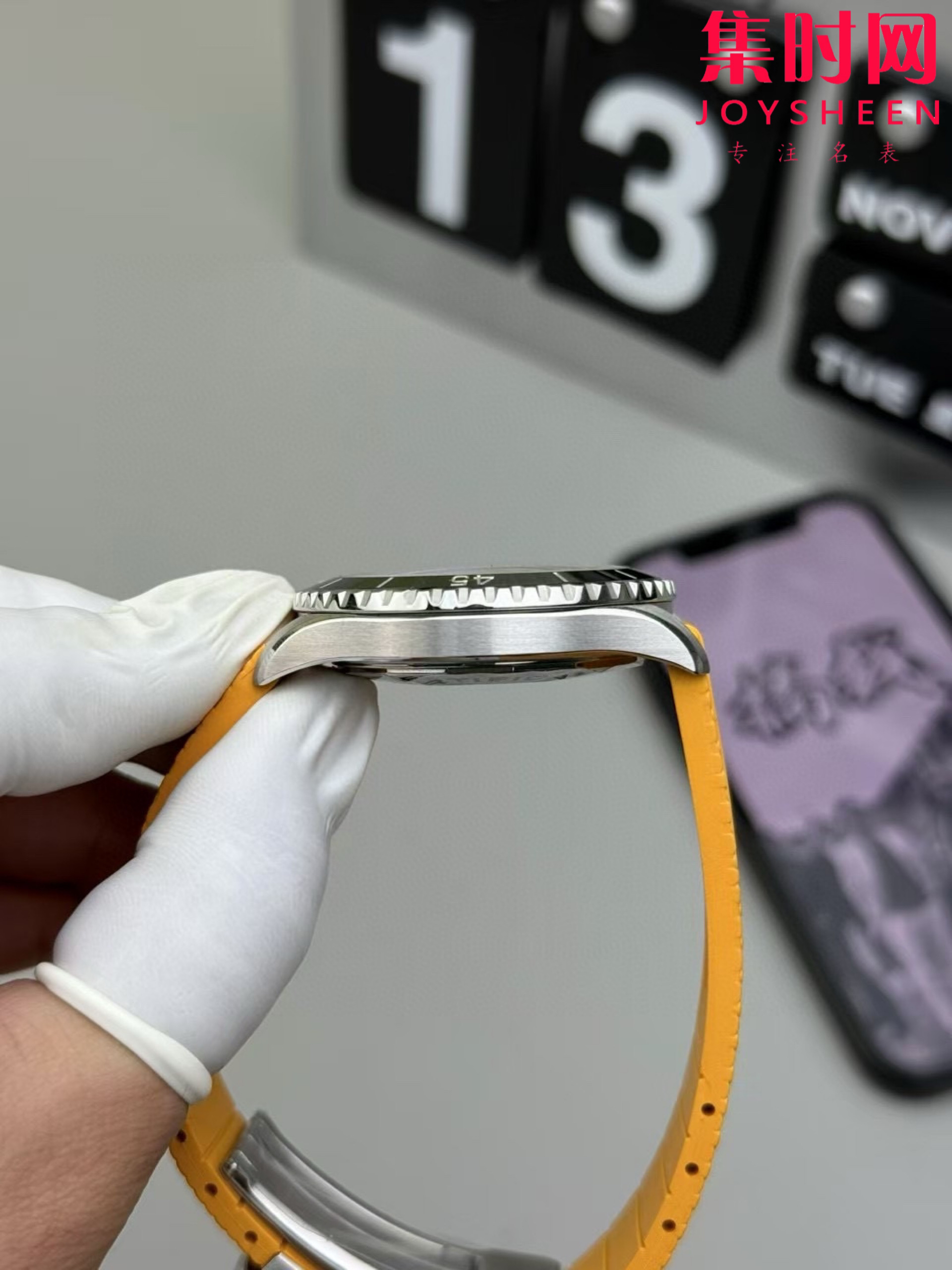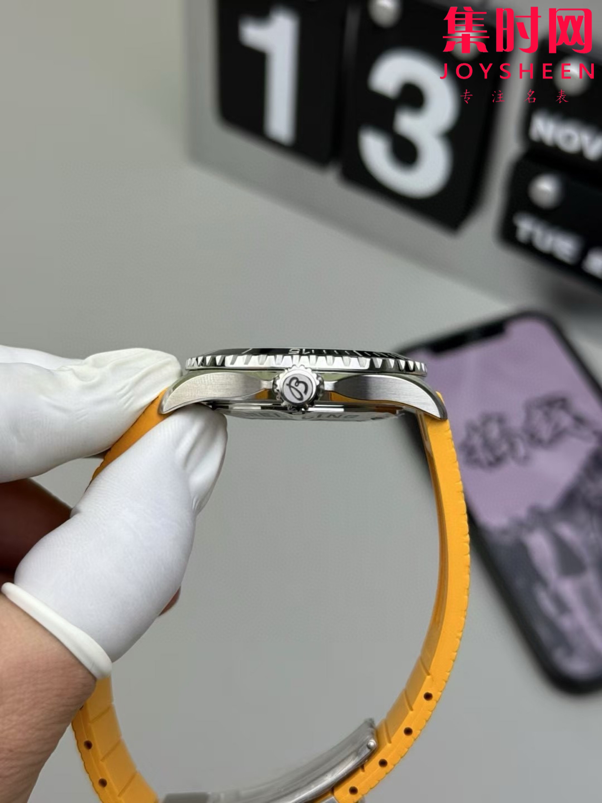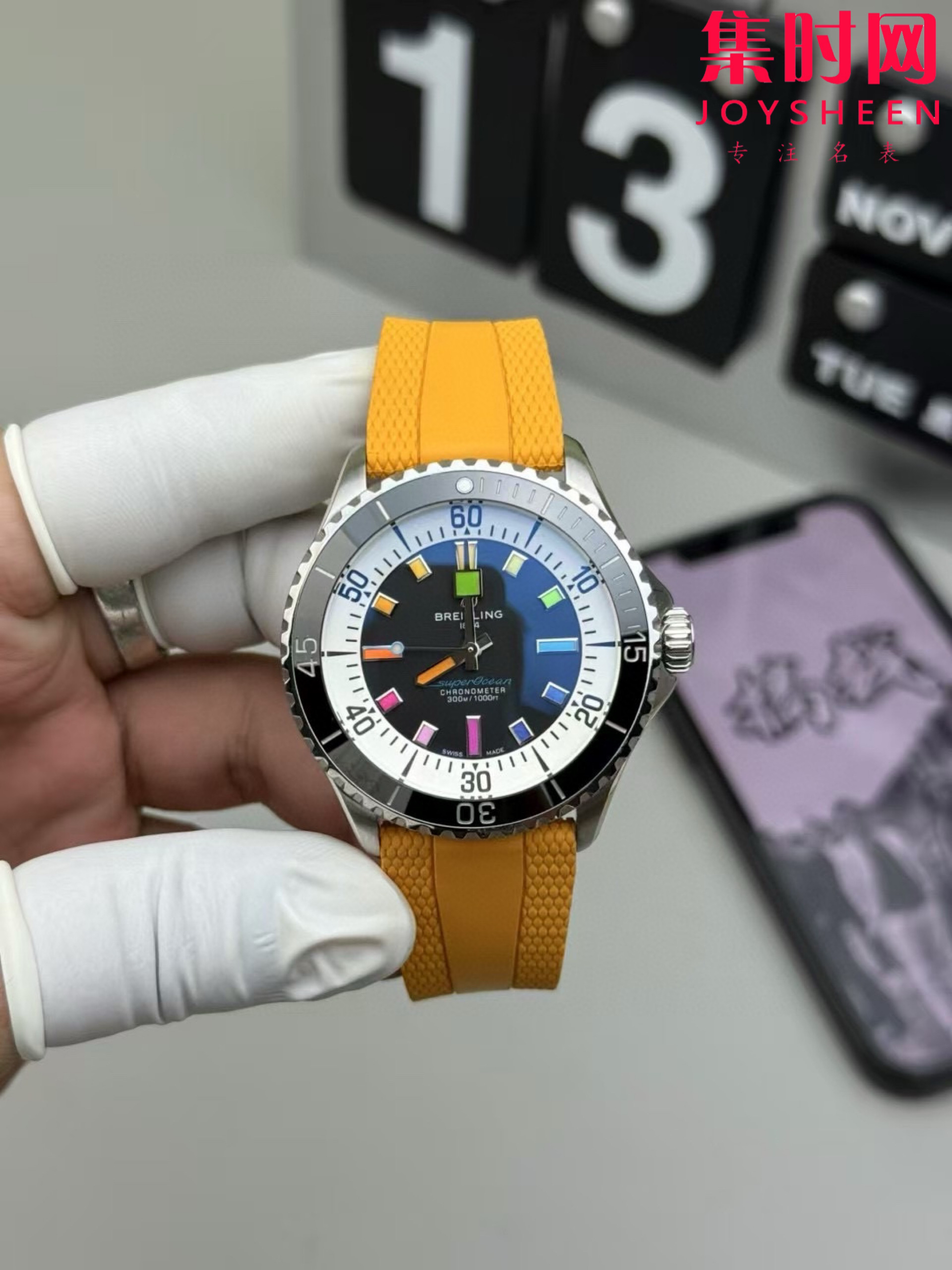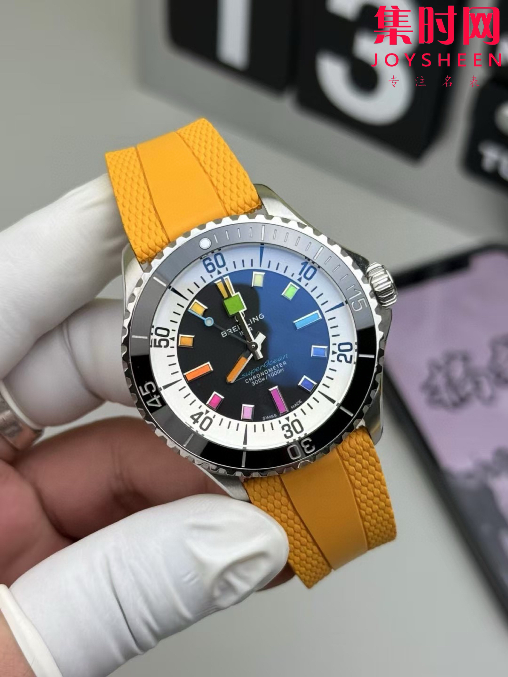 新款到货 BLS百年灵超级海洋彩虹盘男士腕表,外观方面更具时尚新潮魅力,表现出极致的美感和霸气 !搭载2824-2全自动机械机芯,316L精钢表壳,蓝宝石水晶镜面,表径42mm,标志性的棘轮式单向旋转表圈,镶嵌式陶瓷圈,表盘上设有黑白分明的读时分区,其中时标和指针覆以super-LumiNova夜光涂层,呈黄绿蓝靛紫红橙彩虹渐变效果,非常鲜艳。表带方面,百年灵提供绿松石、海蓝色、橙色和黄色橡胶表带可选,表带搭配精钢折叠式表扣
