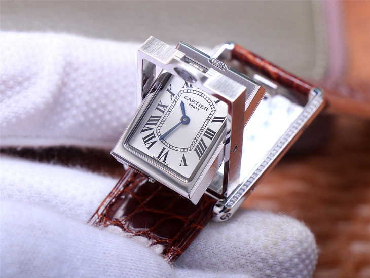 实拍 AW厂最新卡地亚翻转坦克卡地亚 Cartier的Tank Reversible系列诞生于1932年,也就是今日Tank Basculante的前身,是以其著名的长方形坦克为基础造型,再加上表身可以翻转的功能,此功能称为Cabriolet,法文的意思是有篷的马车,取其翻转过程形式篷顶收放,表壳电白金品质,搭配美州鳄鱼皮表带尺寸长31m宽26厚6.5。