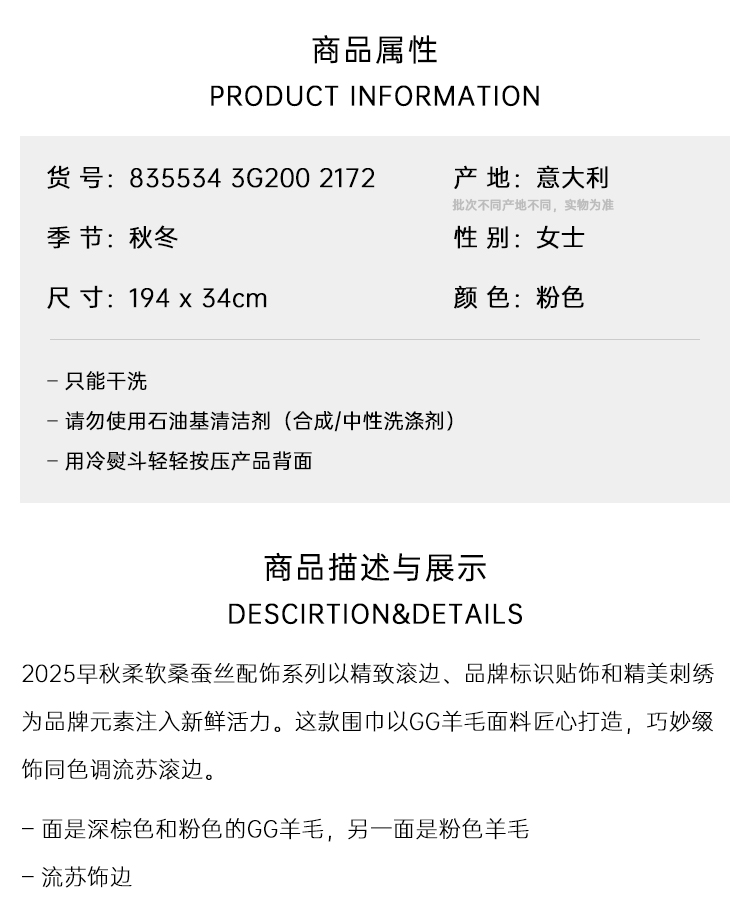 GUCCI 古驰 女士GG羊毛围巾 粉色 835534 3G200 2172
