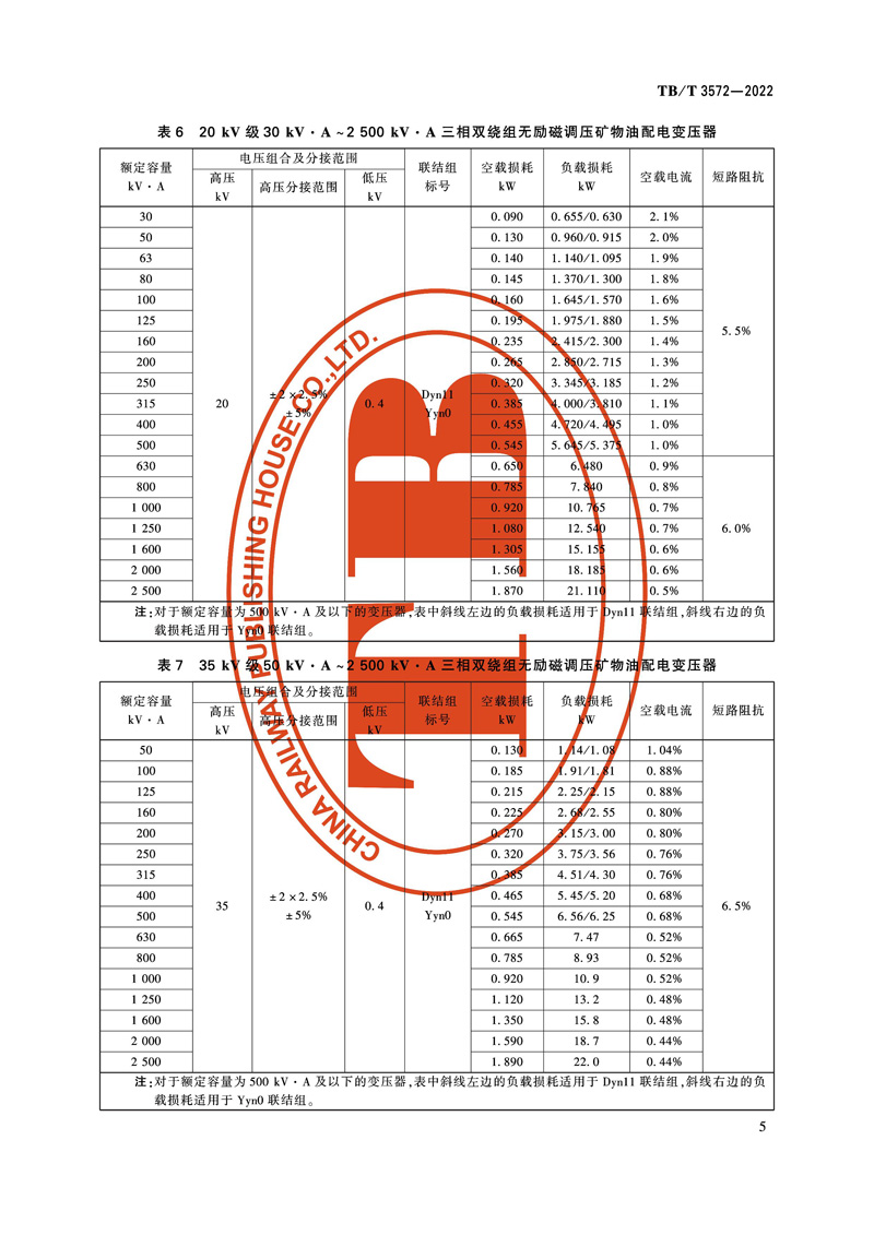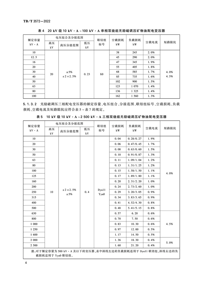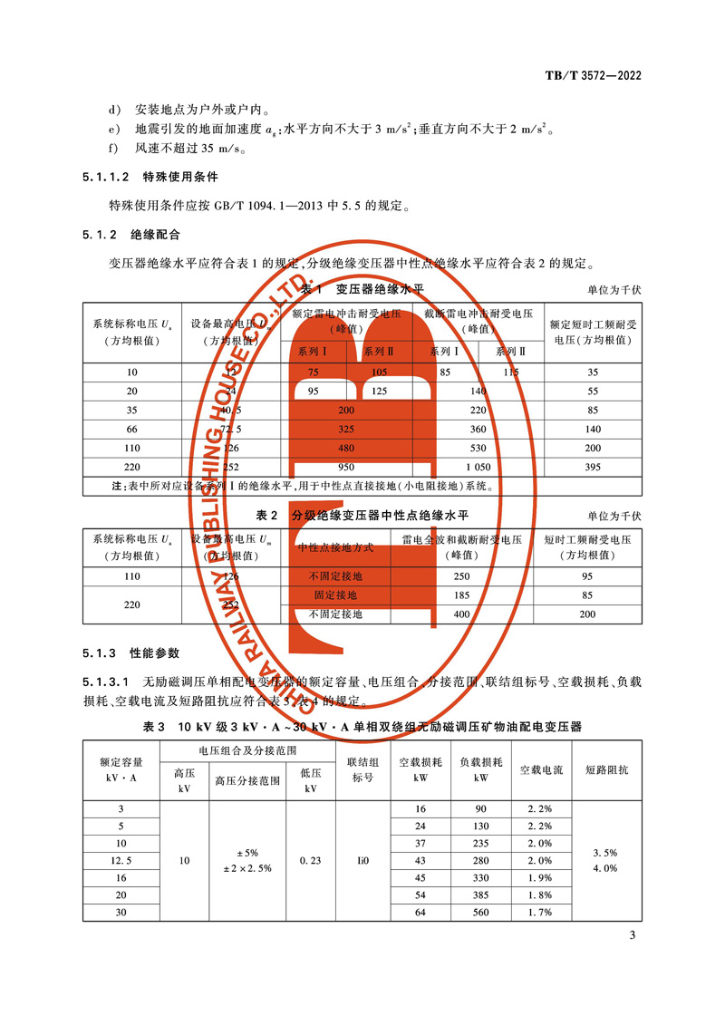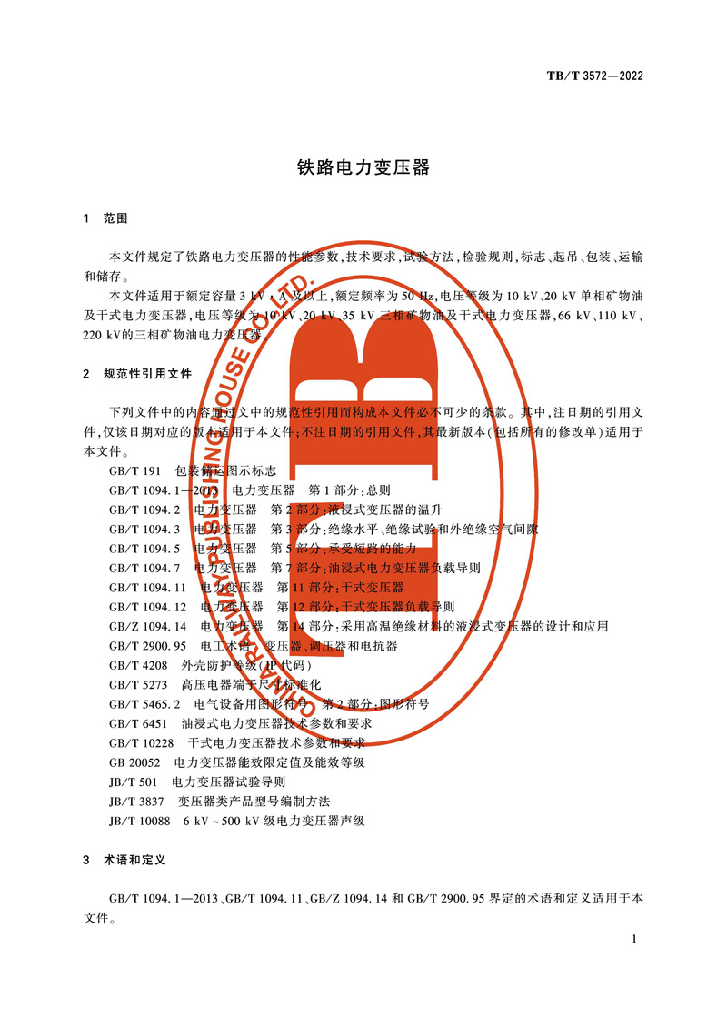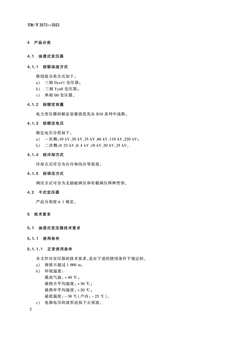 本标准为国家铁路局发布的中华人民共和国铁道行业标准,铁路电力变压器 TB/T 3572-2022。本文件按照 GB/T 1.1-2020《标准化工作导则 第1部分:标准化文件的结构和起草规则》的规定起草。本文件规定了铁路电力变压器的性能参数,技术要求,试验方法,检验规则,标志、起吊、包装、运输和储存。本文件适用于额定容量3kV·A及以上,额定频率为50Hz,电压等级为10kV、20kV单相矿物油及干式电力变压器,电压等级为10kV、20kV、35kV三相矿物油及干式电力变压器,66kV、110kV、220kV的三相矿物油电力变压器。