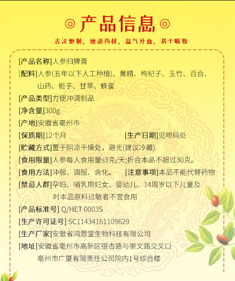 [配料]人参(五年以下人工种植)、黄精、枸杞子、玉竹、百合、山药、栀子、甘草、蜂蜜