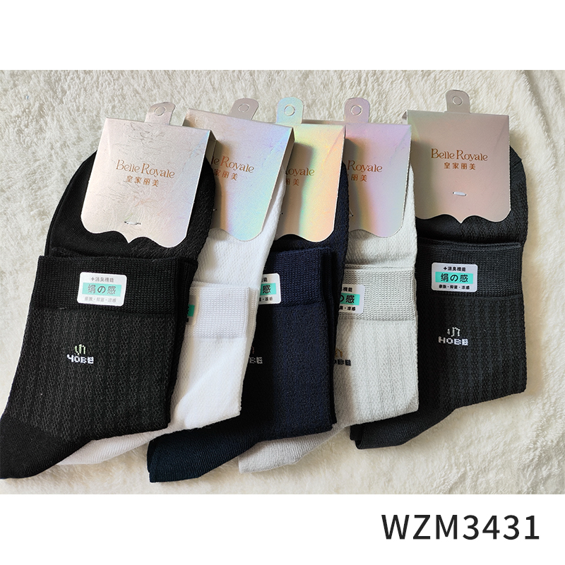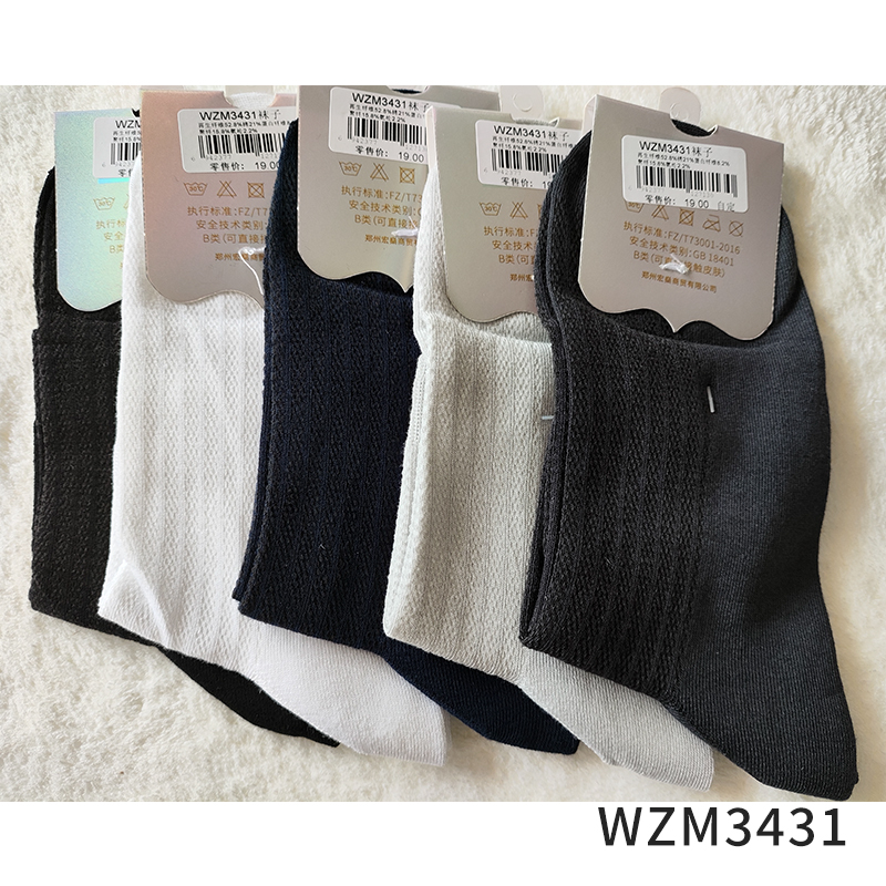 男袜3431 面料:再生纤维52.8%;棉21%;蛋白纤维8.2%,聚纤15.8%;氨纶2.2%