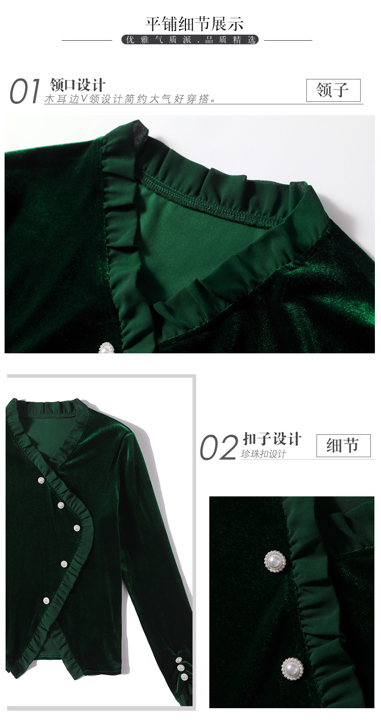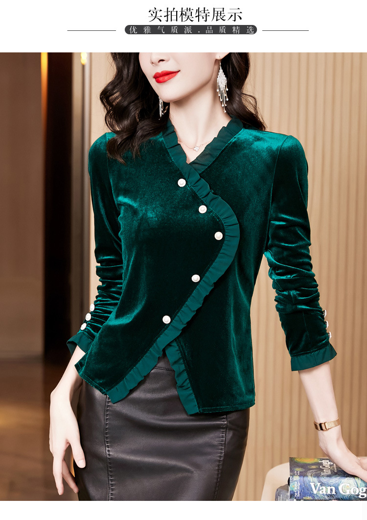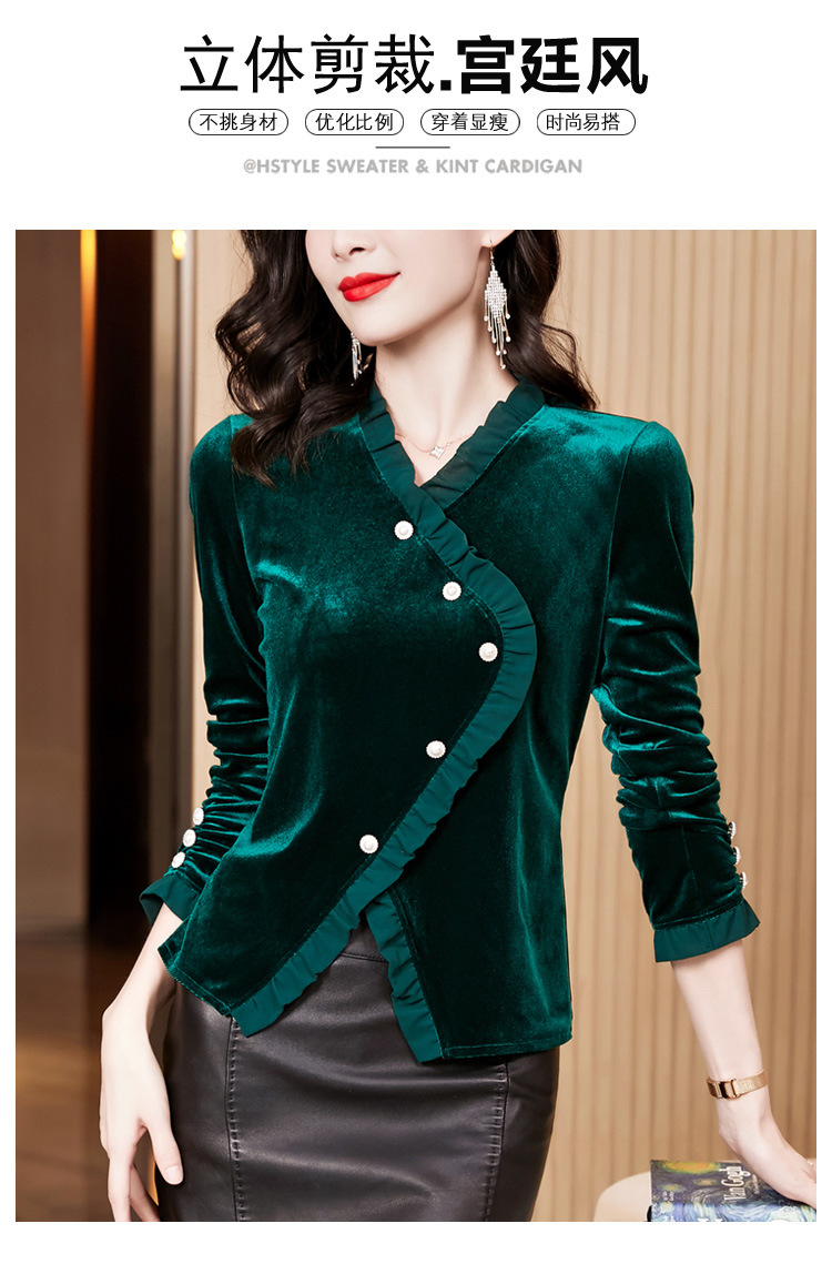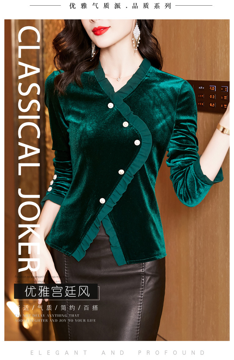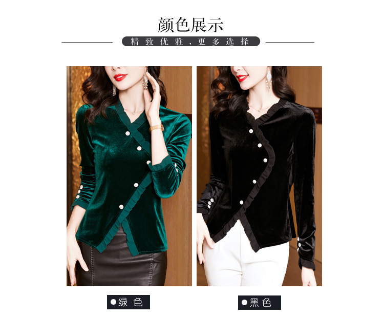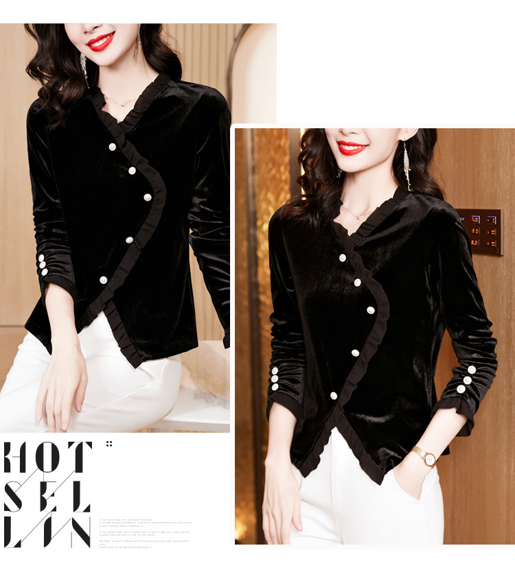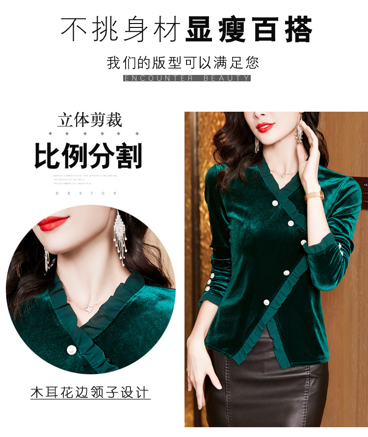 气质百搭,丝绒洋气V领纽扣长袖T恤修身显瘦打底上衣KQL-M2368