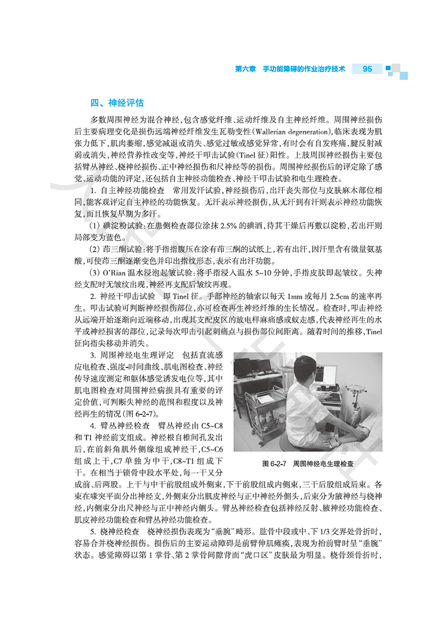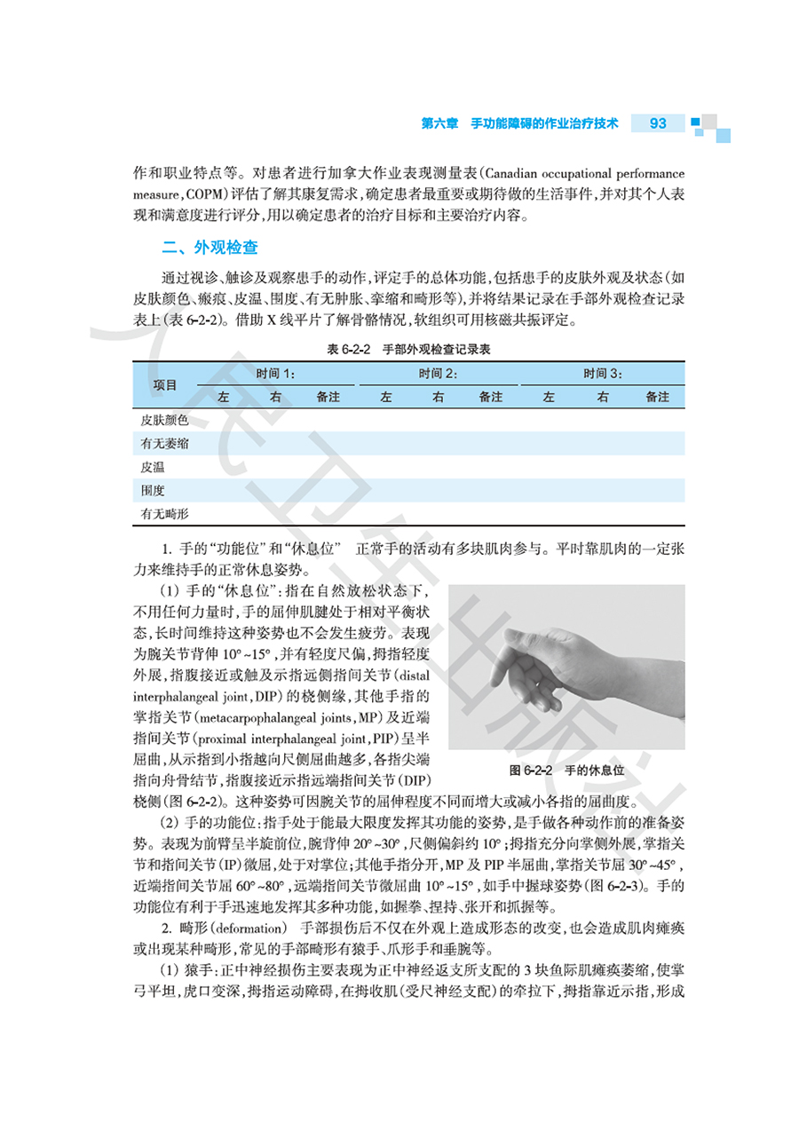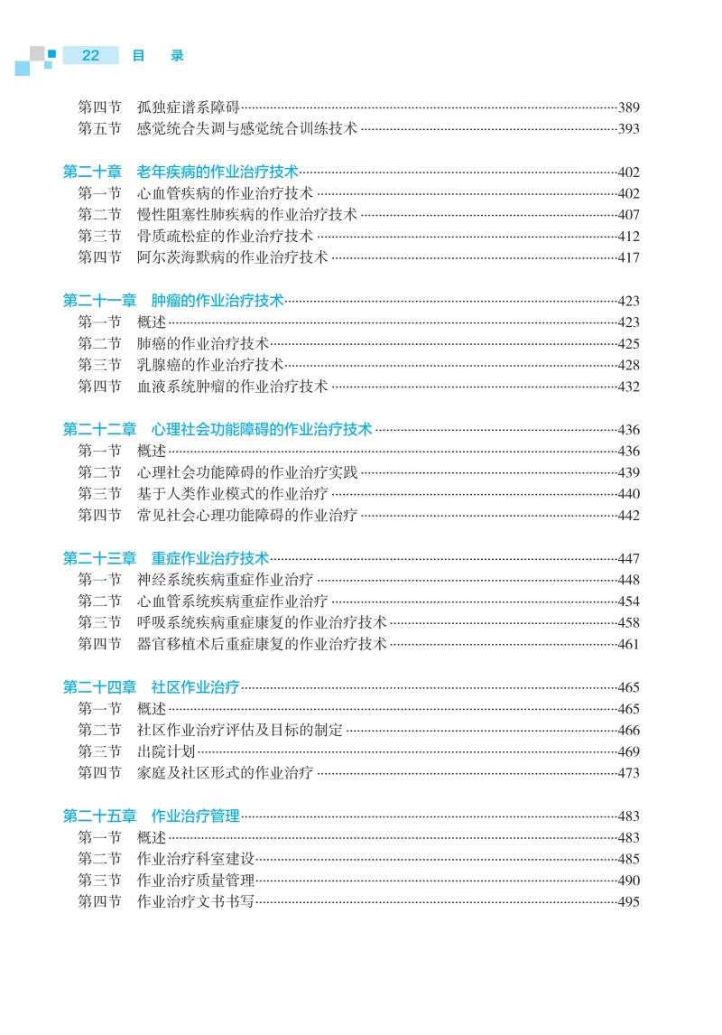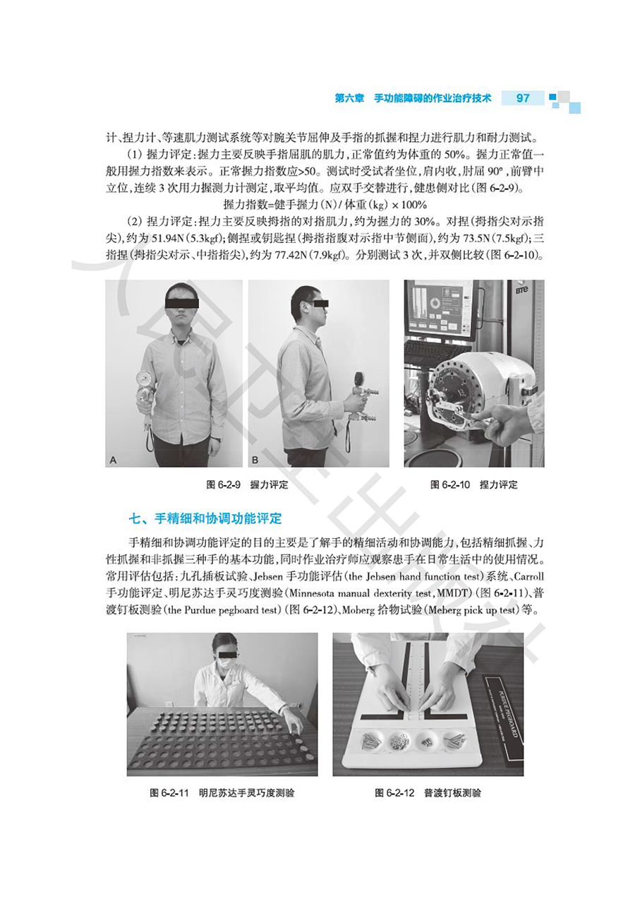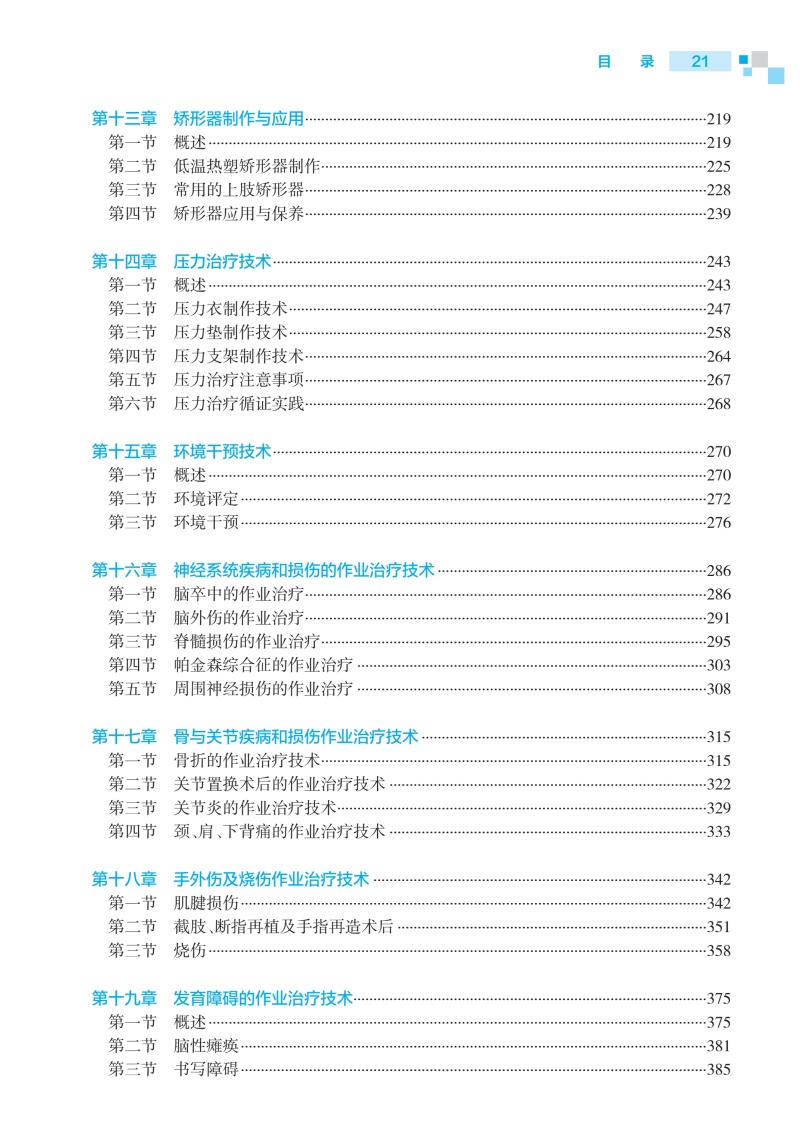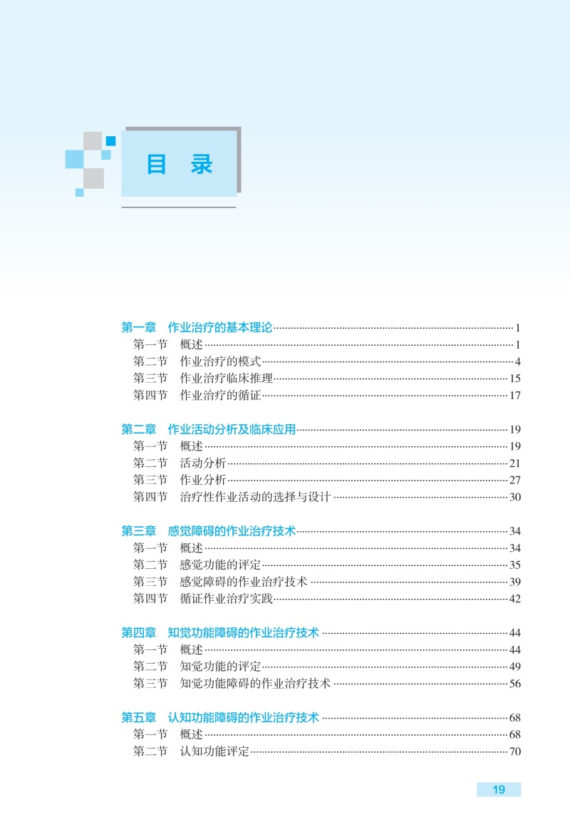 第一章作业治疗的基本理论/1 第一节概述/1 第二节作业治疗的模式/4 第三节作业治疗临床推理/15 第四节作业治疗的循证/17 第二章作业活动分析及临床应用/19 第一节概述/19 第二节活动分析/21 第三节作业分析/27 第四节治疗性作业活动的选择与设计/30 第三章感觉障碍的作业治疗技术/34 第一节概述/34 第二节感觉功能的评定/35 第三节感觉障碍的作业治疗技术/39 第四节循证作业治疗实践/42 第四章知觉功能障碍的作业治疗技术/44 第一节概述/44 第二节知觉功能的评定/49 第三节知觉功能障碍的作业治疗技术/56 第五章认知功能障碍的作业治疗技术/68 第一节概述/68 第二节认知功能评定/70 第三节认知功能障碍的作业治疗技术/78 第四节循证作业治疗实践/87 第六章手功能障碍的作业治疗技术/90 第一节概述/90 第二节手和上肢功能评定/91 第三节上肢和手功能障碍的作业治疗技术/98 第四节循证作业治疗实践/105 第七章日常生活活动能力训练技术/108 第一节概述/108 第二节日常生活活动能力评估/109 第三节日常生活活动训练/116 第四节循证作业治疗实践/134 第八章职业评定与职业训练技术/138 第一节概述/138 第二节职业评定/140 第三节职业训练/145 第四节循证作业治疗实践/148 第九章休闲活动评定与训练技术/150 第一节概述/150 第二节休闲活动能力评定/151 第三节休闲活动训练/153 第四节休闲活动作业治疗循证实践/156 第十章辅助器具的选择和使用技术/158 第一节概述/158 第二节辅助器具的选择/160 第三节生活辅助器具的使用技术/175 第十一章轮椅的选择和使用技术/182 第一节概述/182 第二节轮椅的评估与适配/186 第三节轮椅的使用技术/191 第十二章助行器具的选择和使用技术/199 第一节概述/199 第二节助行器具的选择与适配/201 第三节助行器具的使用技术/209 第十三章矫形器制作与应用/219 第一节概述/219 第二节低温热塑矫形器制作/225 第三节常用的上肢矫形器/228 第四节矫形器应用与保养/239 第十四章压力治疗技术/243 第一节概述/243 第二节压力衣制作技术/247 第三节压力垫制作技术/258 第四节压力支架制作技术/264 第五节压力治疗注意事项/267 第六节压力治疗循证实践/268 第十五章环境干预技术/270 第一节概述/270 第二节环境评定/272 第三节环境干预/276 第十六章神经系统疾病和损伤的作业治疗技术/286 第一节脑卒中的作业治疗/286 第二节脑外伤的作业治疗/291 第三节脊髓损伤的作业治疗/295 第四节帕金森综合征的作业治疗/303 第五节周围神经损伤的作业治疗/308 第十七章骨与关节疾病和损伤作业治疗技术/315 第一节骨折的作业治疗技术/315 第二节关节置换术后的作业治疗技术/322 第三节关节炎的作业治疗技术/329 第四节颈、肩、下背痛的作业治疗技术/333 第十八章手外伤及烧伤作业治疗技术/342 第一节肌腱损伤/342 第二节截肢、断指再植及手指再造术后/351 第三节烧伤/358 第十九章发育障碍的作业治疗技术/375 第一节概述/375 第二节脑性瘫痪/381 第三节书写障碍/385 第四节孤独症谱系障碍/389 第五节感觉统合失调与感觉统合训练技术/393 第二十章老年疾病的作业治疗技术/402 第一节心血管疾病的作业治疗技术/402 第二节慢性阻塞性肺疾病的作业治疗技术/407 第三节骨质疏松症的作业治疗技术/412 第四节阿尔茨海默病的作业治疗技术/417 第二十一章肿瘤的作业治疗技术/423 第一节概述/423 第二节肺癌的作业治疗技术/425 第三节乳腺癌的作业治疗技术/428 第四节血液系统肿瘤的作业治疗技术/432 第二十二章心理社会功能障碍的作业治疗技术/436 第一节概述/436 第二节心理社会功能障碍的作业治疗实践/439 第三节基于人类作业模式的作业治疗/440 第四节常见社会心理功能障碍的作业治疗/442 第二十三章重症作业治疗技术/447 第一节神经系统疾病重症作业治疗/448 第二节心血管系统疾病重症作业治疗/454 第三节呼吸系统疾病重症康复的作业治疗技术/458 第四节器官移植术后重症康复的作业治疗技术/461 第二十四章社区作业治疗/465 第一节概述/465 第二节社区作业治疗评估及目标的制定/466 第三节出院计划/469 第四节家庭及社区形式的作业治疗/473 第二十五章作业治疗管理/483 第一节概述/483 第二节作业治疗科室建设/485 第三节作业治疗质量管理/490 第四节作业治疗文书书写/495