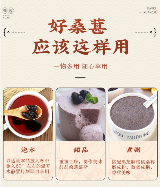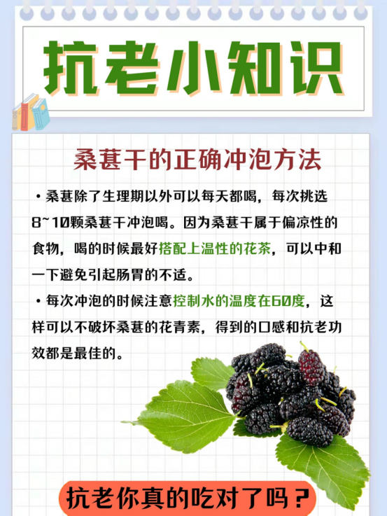 建议水温:60℃左右,以免破坏桑葚干里的花青素成分