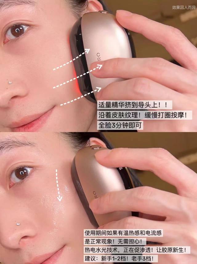 【注意事项】搭配护肤品禁用成分:①含油类护肤品(精华油、植物精油等);②含酸类护肤品(含水杨酸、杏仁酸、果酸等精华);③质地较为粘稠、易拉丝的护肤品;④低电导率护肤品(上脸无明显电流感精华)