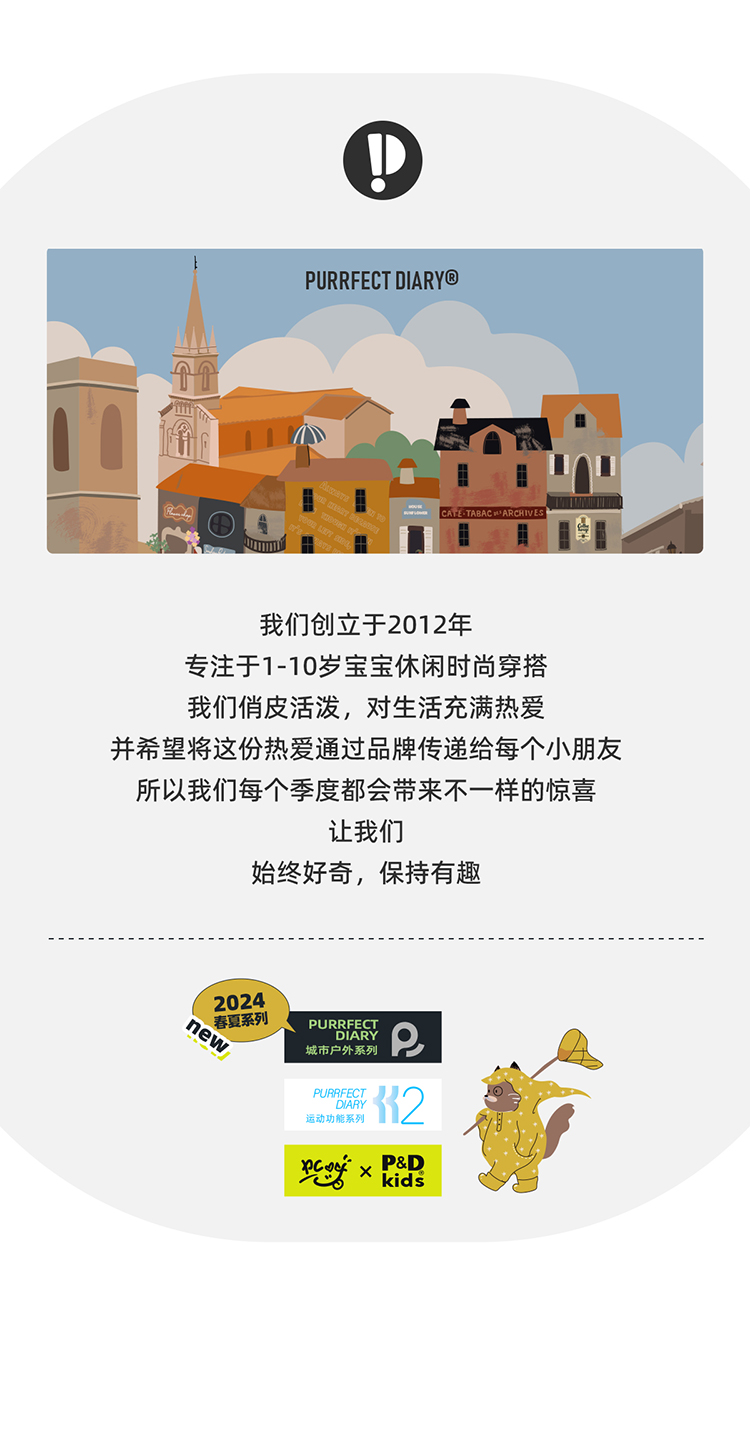 Purrfect-Diary专注于贴近自然随性的穿着概念,轻奢平价的童装文化传播,在产品设计上更加注重婴童穿着的舒适性、安全性、更出众的国际化品牌,将欧美的育婴文化在中国进行深入的传播与推广。