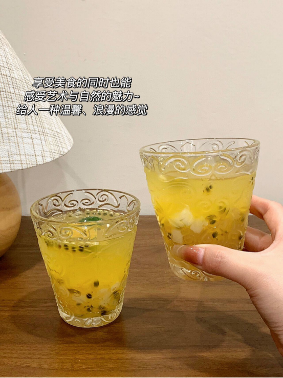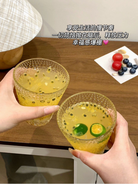 它有着足够宽的厚壁 不似日本硝子那样脆弱易碎,但也绝不笨重 夏天从冰箱里拿出来 到手那刻冰凉,真的让人烦躁没了大半! 就算倒入常温的饮品,也好像刚冷藏过一样 特别清爽!!