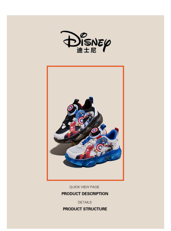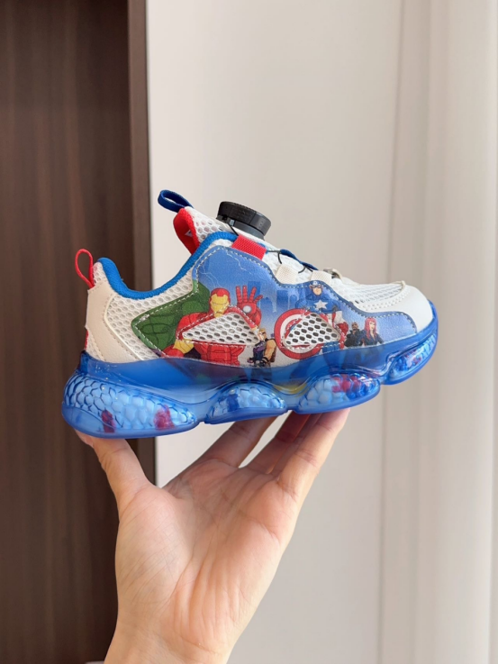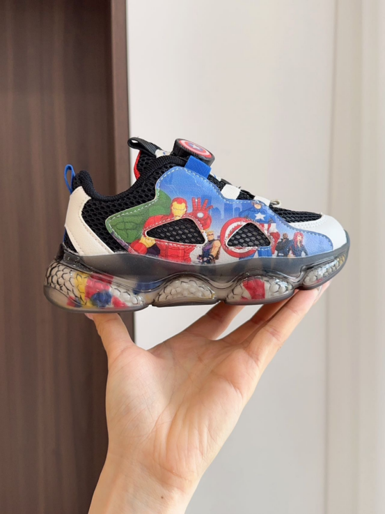 货号:ZY23-006 颜色:黑色B、皇家蓝HJL 尺码:26-37 材质:鞋面 合成革;鞋底 PVC+EVA 款式设计时尚潮流,蜘蛛侠等印花超级酷炫,宝宝肯定超级喜欢~ 鞋子有包头设计防撞耐踢,可以保护宝宝娇嫩的脚趾!! 旋转纽扣设计可以轻松调节松紧,穿脱特别方便对孩子很友好 鞋身又薄又透气,宝宝穿着不闷脚让宝宝在春夏玩得尽兴~~