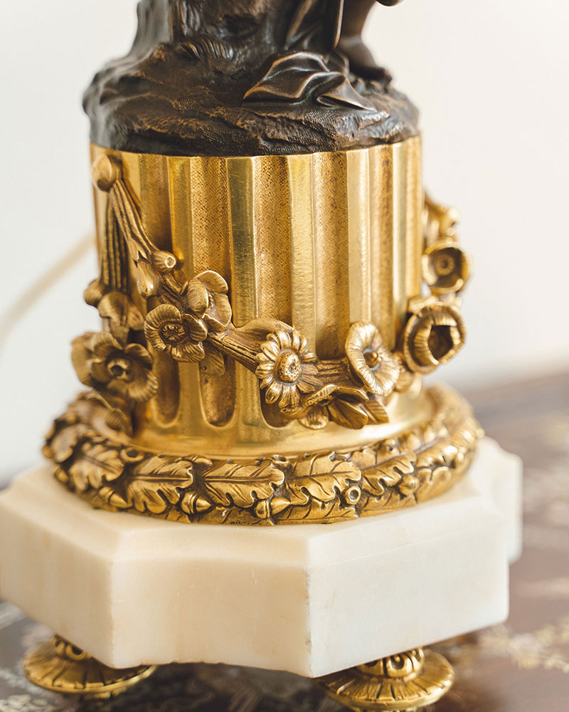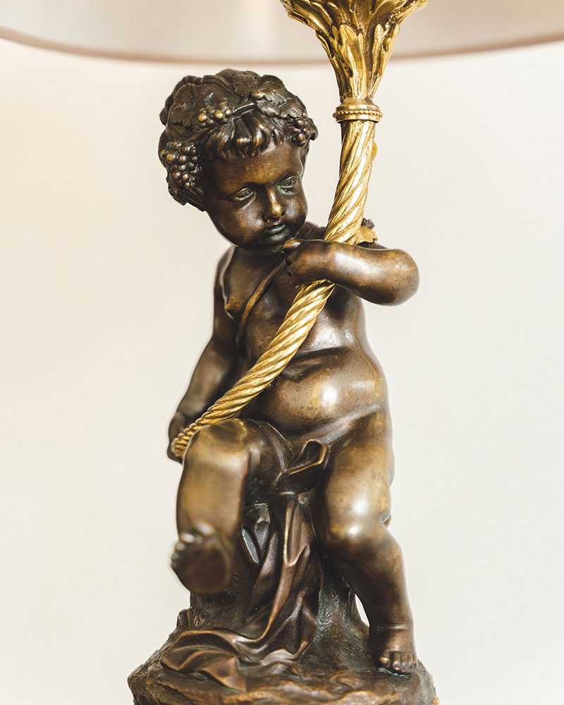 19世纪法国出品上色青铜铜鎏金大理石底座小天使托举台灯一对