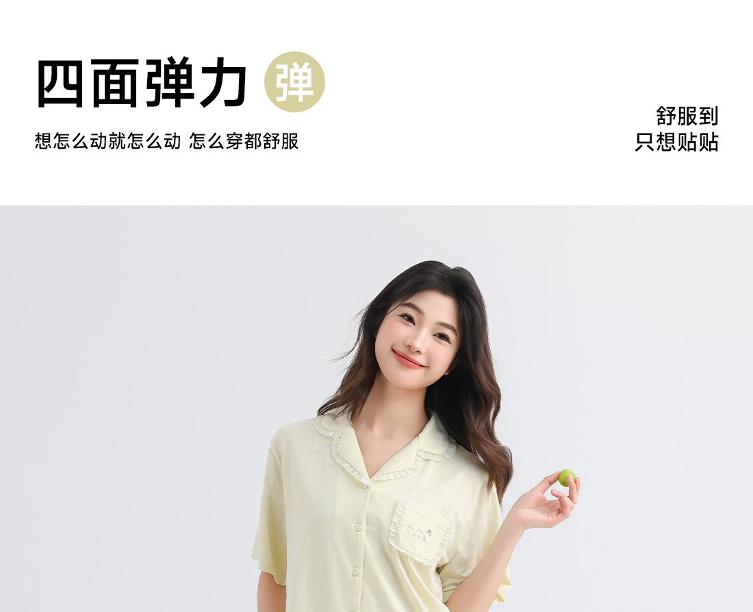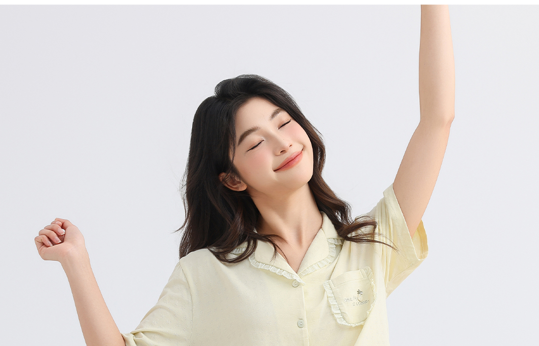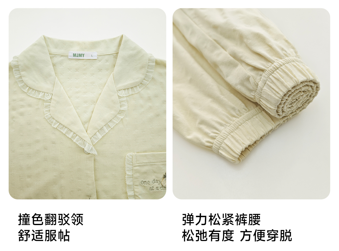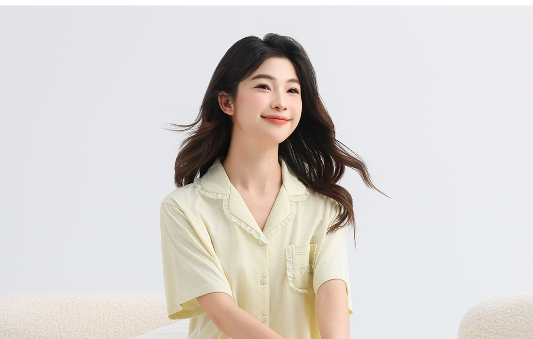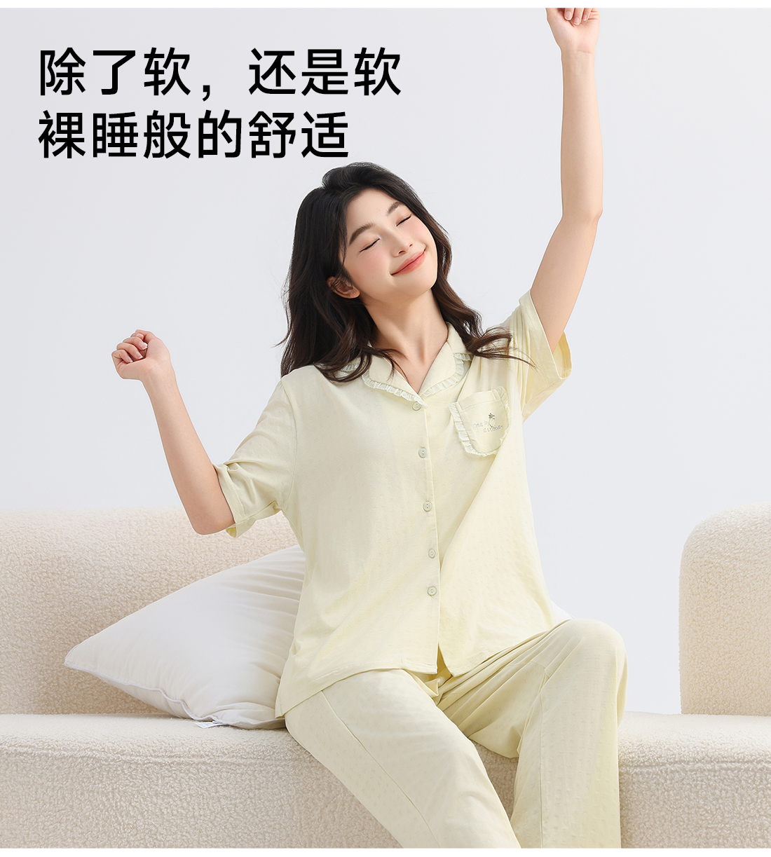 美季美优睡衣女士2025新款纯色棉透气蕾丝花边短袖长裤家居服套装