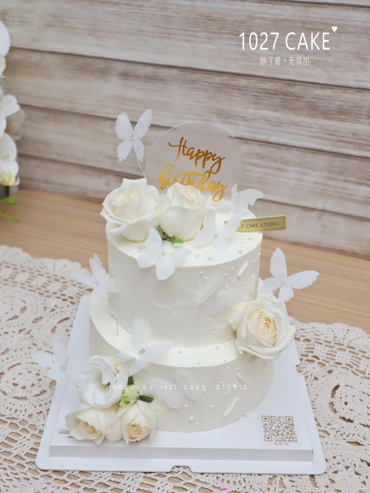 11027CAKE | 双层蝴蝶白玫瑰蛋糕 纯白色系 女神