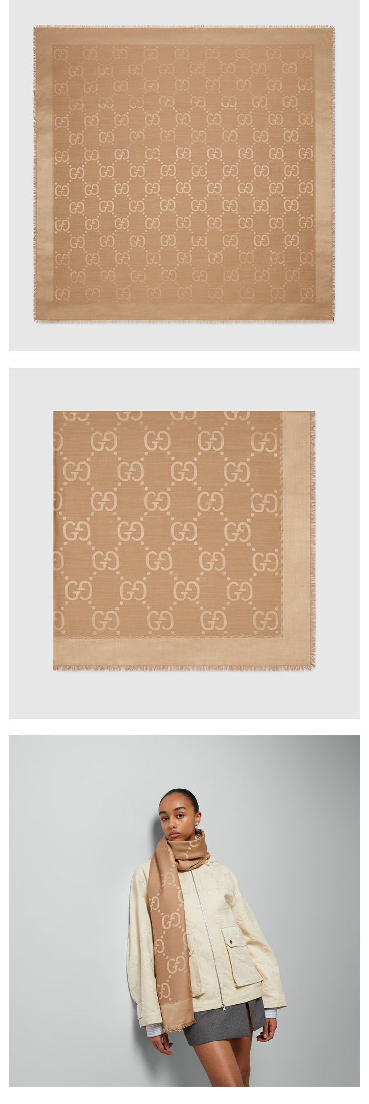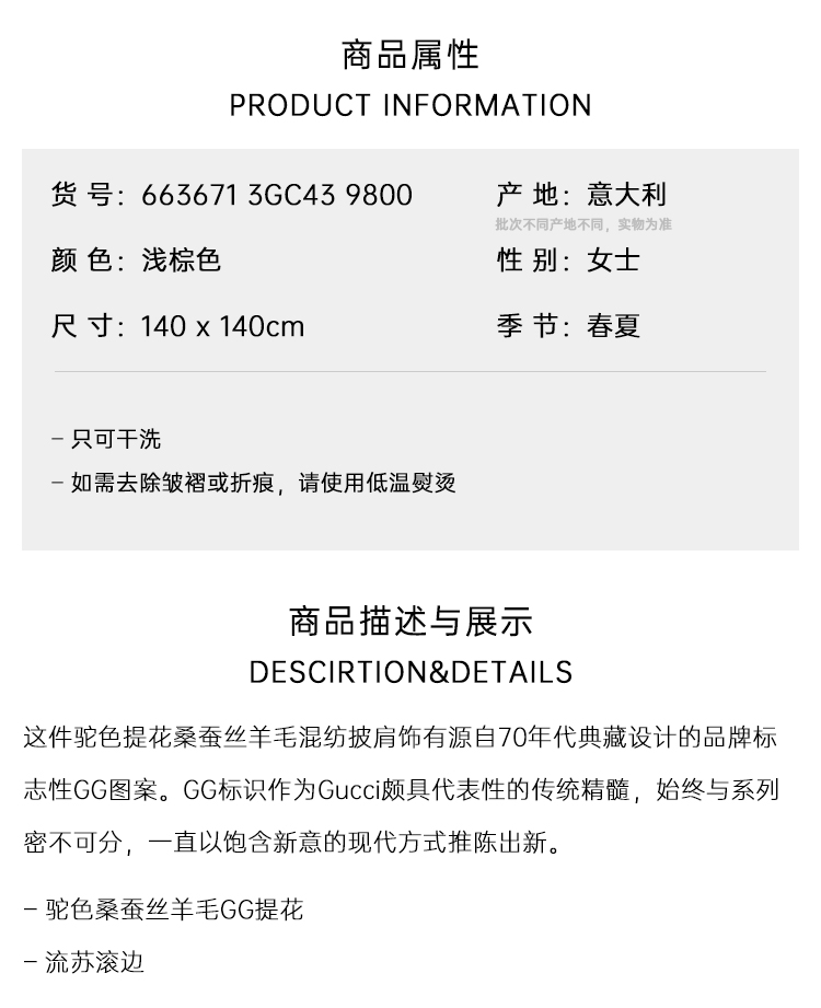 【一】GUCCI 古驰 女士GG提花真丝羊毛披肩 浅棕色 663671 3GC43 9800