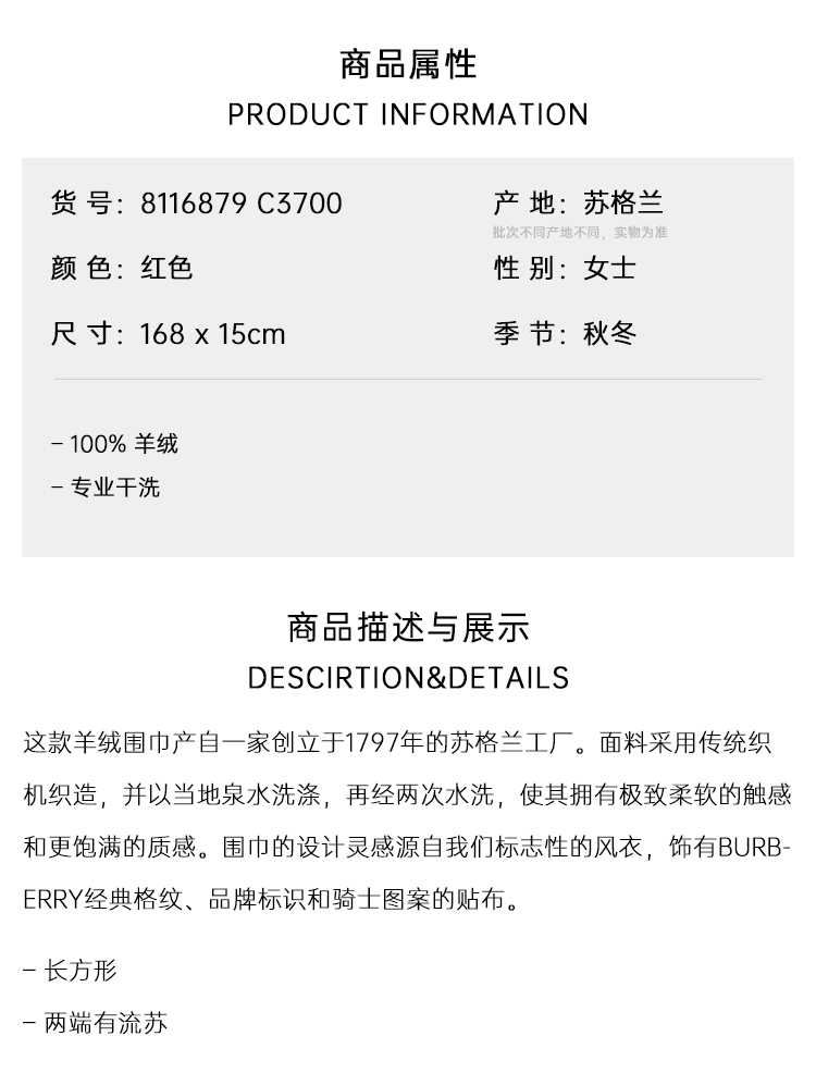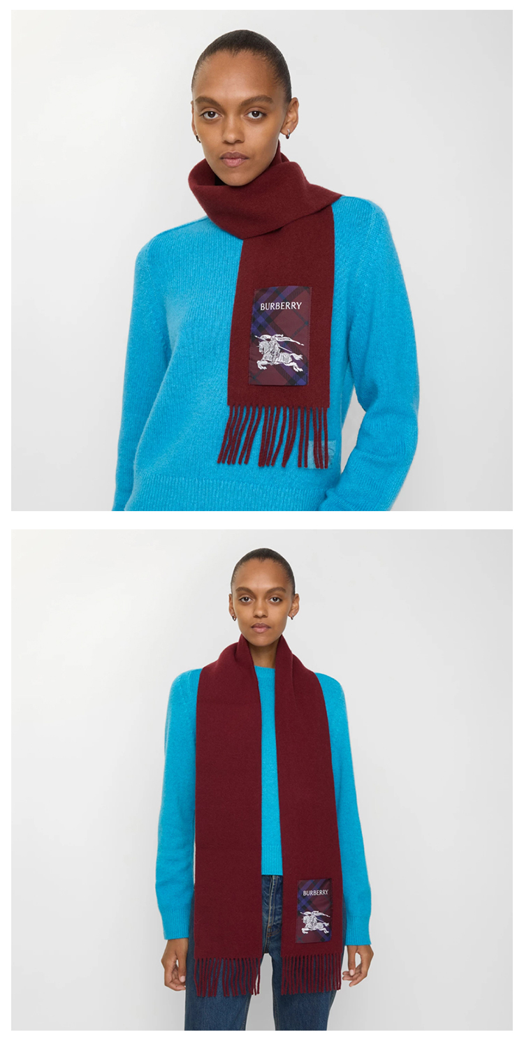 BURBERRY 巴宝莉 女士马术骑士徽标格子标签羊绒围巾 红色 8116879 C3700