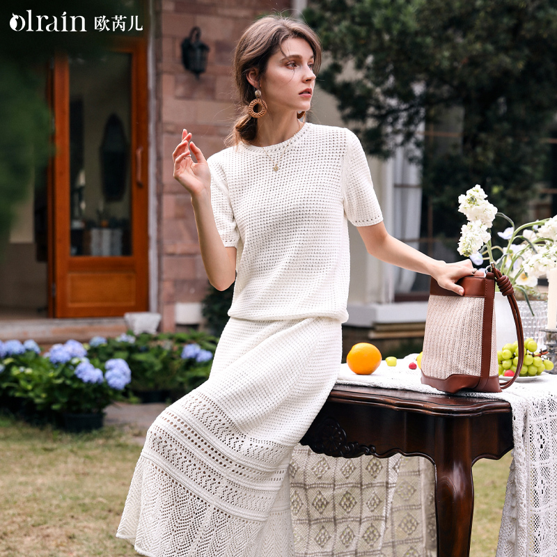 欧芮儿法式杏白色针织套装女夏季2024年新款高级感休闲短袖+半身裙