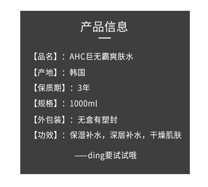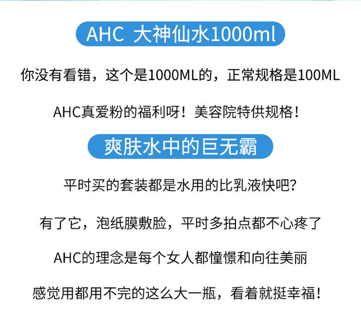 1、产品名称:AHC玻尿酸巨无霸神仙水