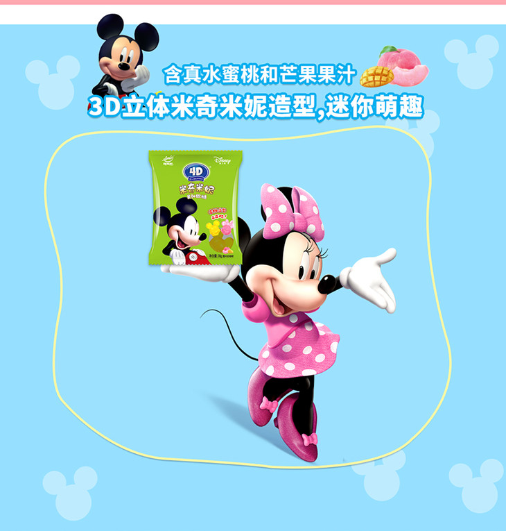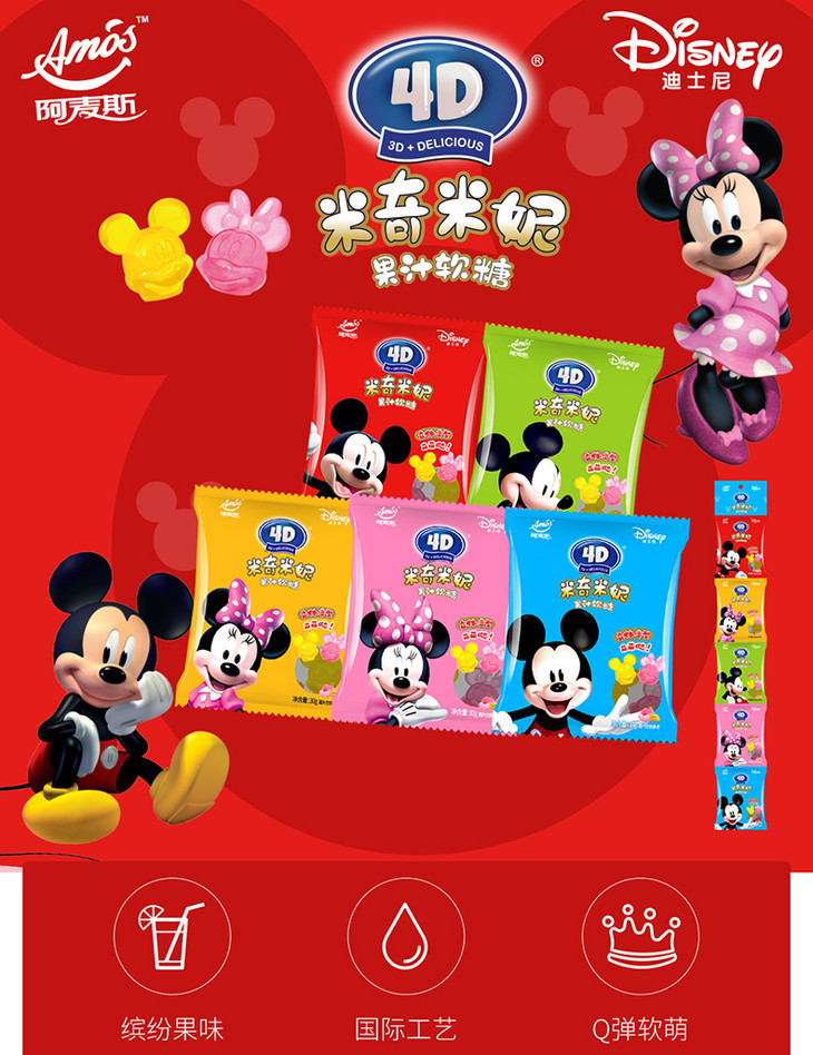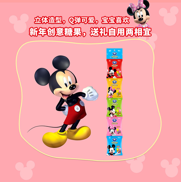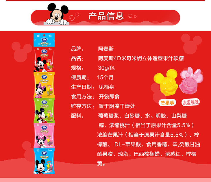 Amos阿麦斯4D迪斯尼联名款米奇米妮30g*5袋橡皮糖 软糖 节庆 糖果 含真水蜜桃和芒果果汁 迷你萌趣