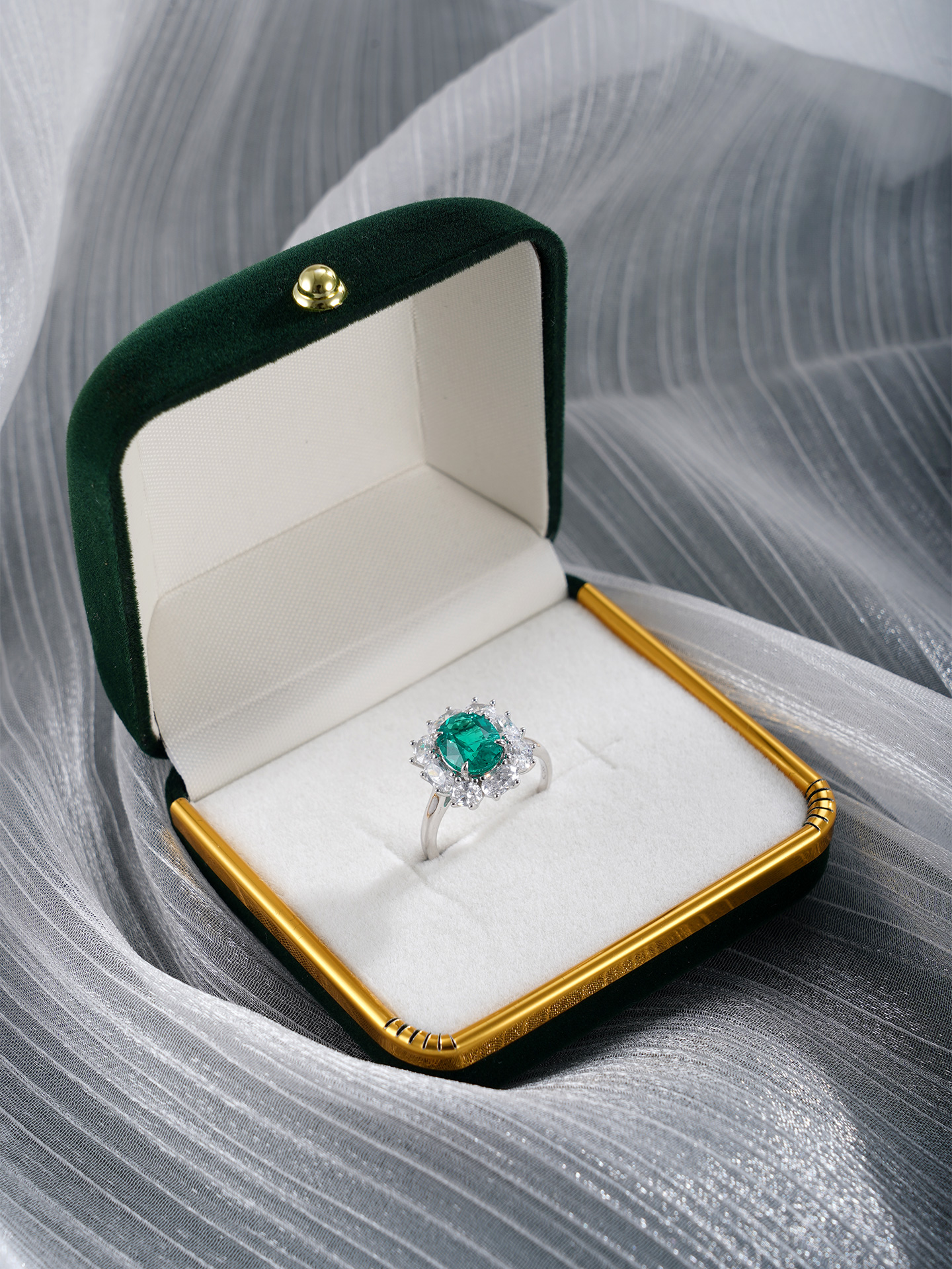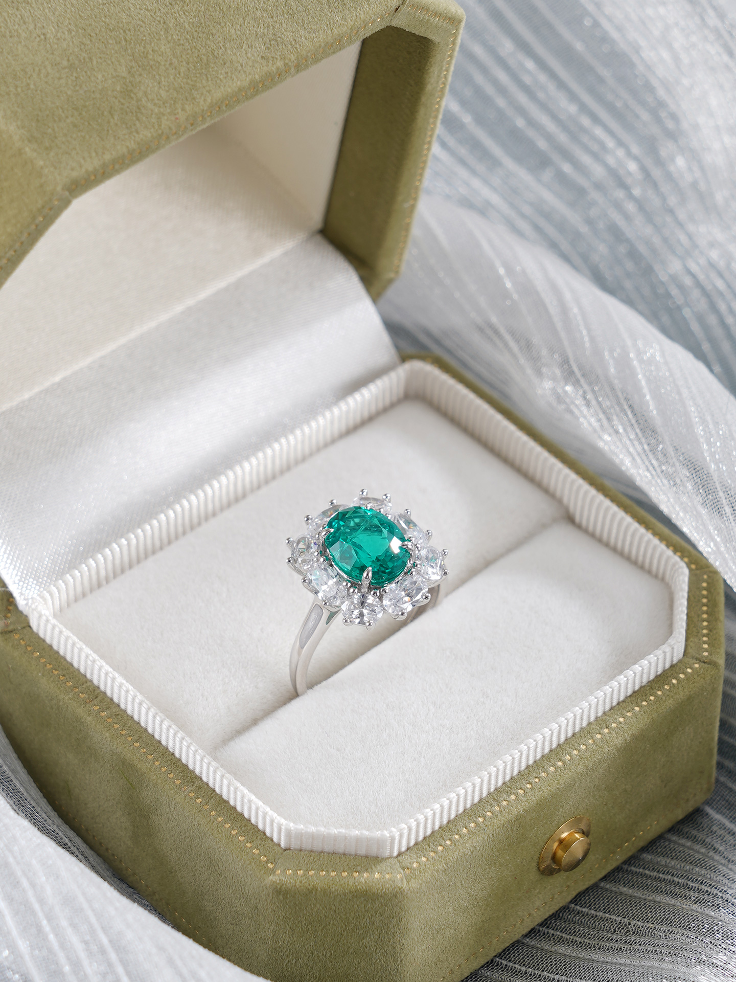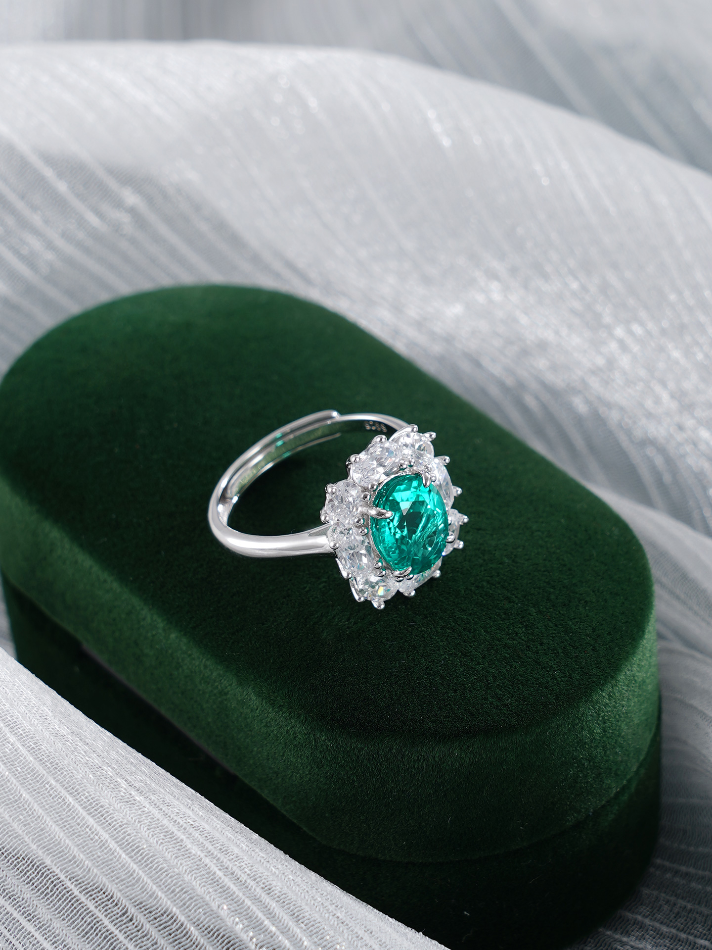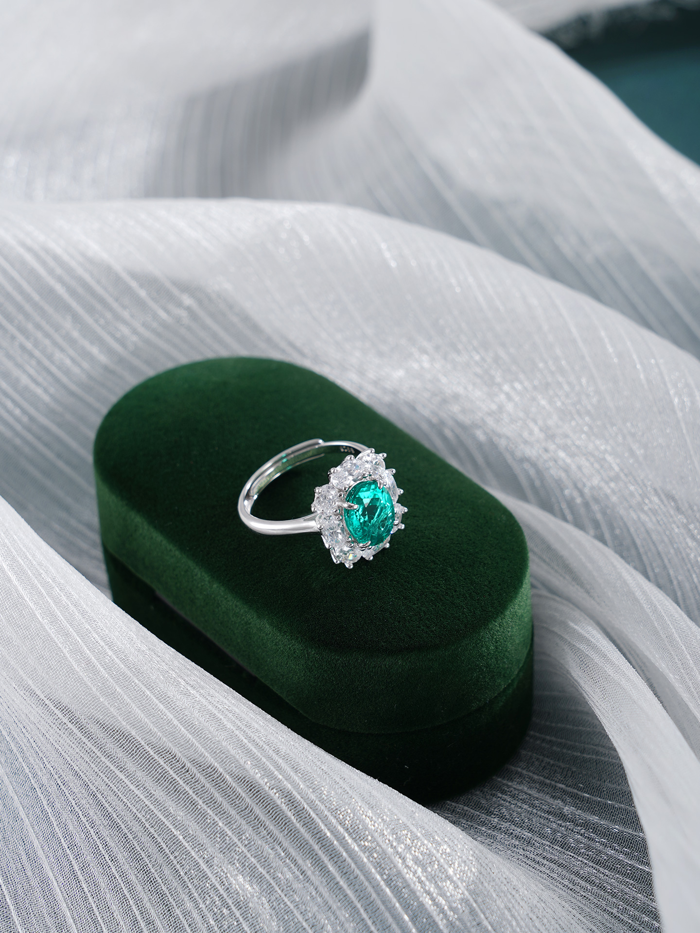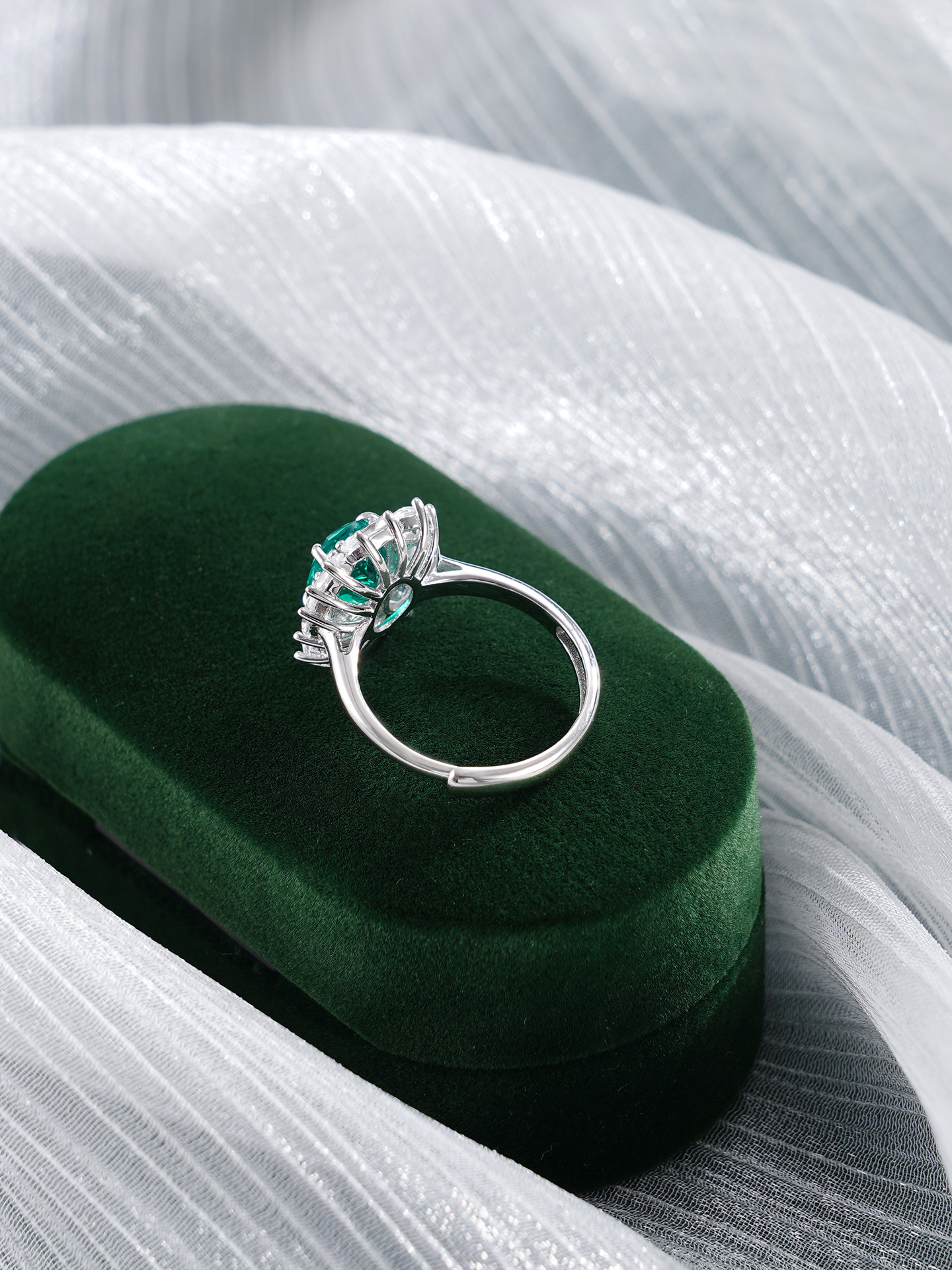 【寓意】:戒指采用极简设计,纯银戒托镶嵌繁花锆石,搭配青翠宝石,光影流转间演绎自然生长的力量感,寓意凝驻时光之韵,绽放永恒芳华。