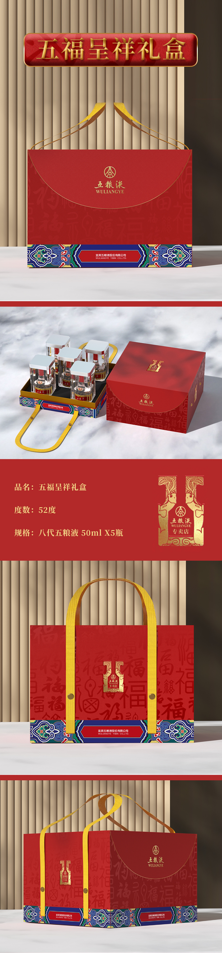第八代五粮液·五福呈祥礼盒(52度 50mL 八代五粮液x5瓶)*1套