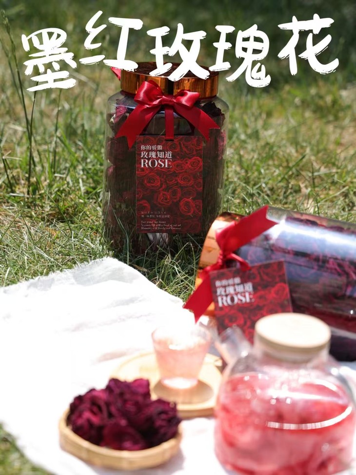 热卖【墨红玫瑰花茶】精选法国进口品种,种植于云南,无污染,气味芬芳,只采摘每天清晨的墨红玫瑰,水分饱满、营养完整,鲜花从离开花枝到入库不超过3小时,全面保留营养成分。