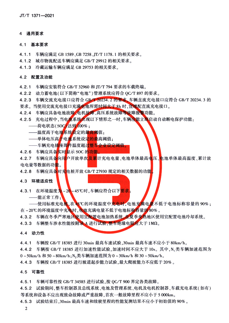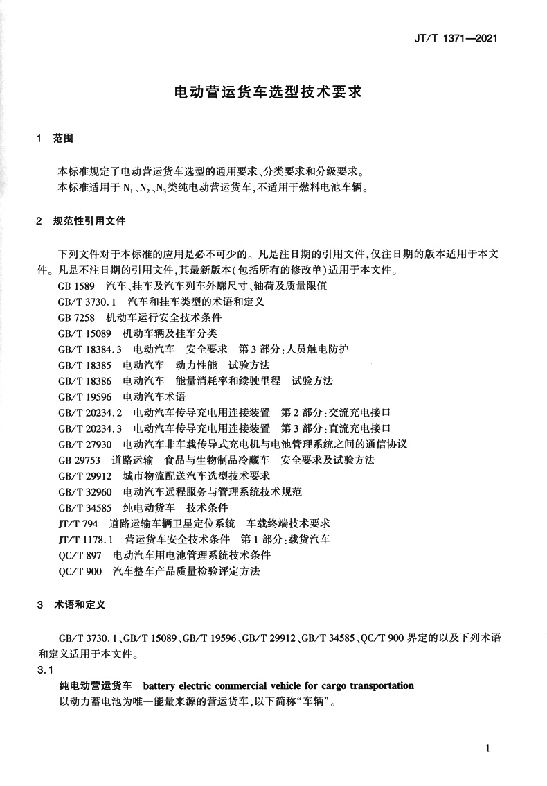 电动营运货车选型技术要求(JT/T 1371—2021)