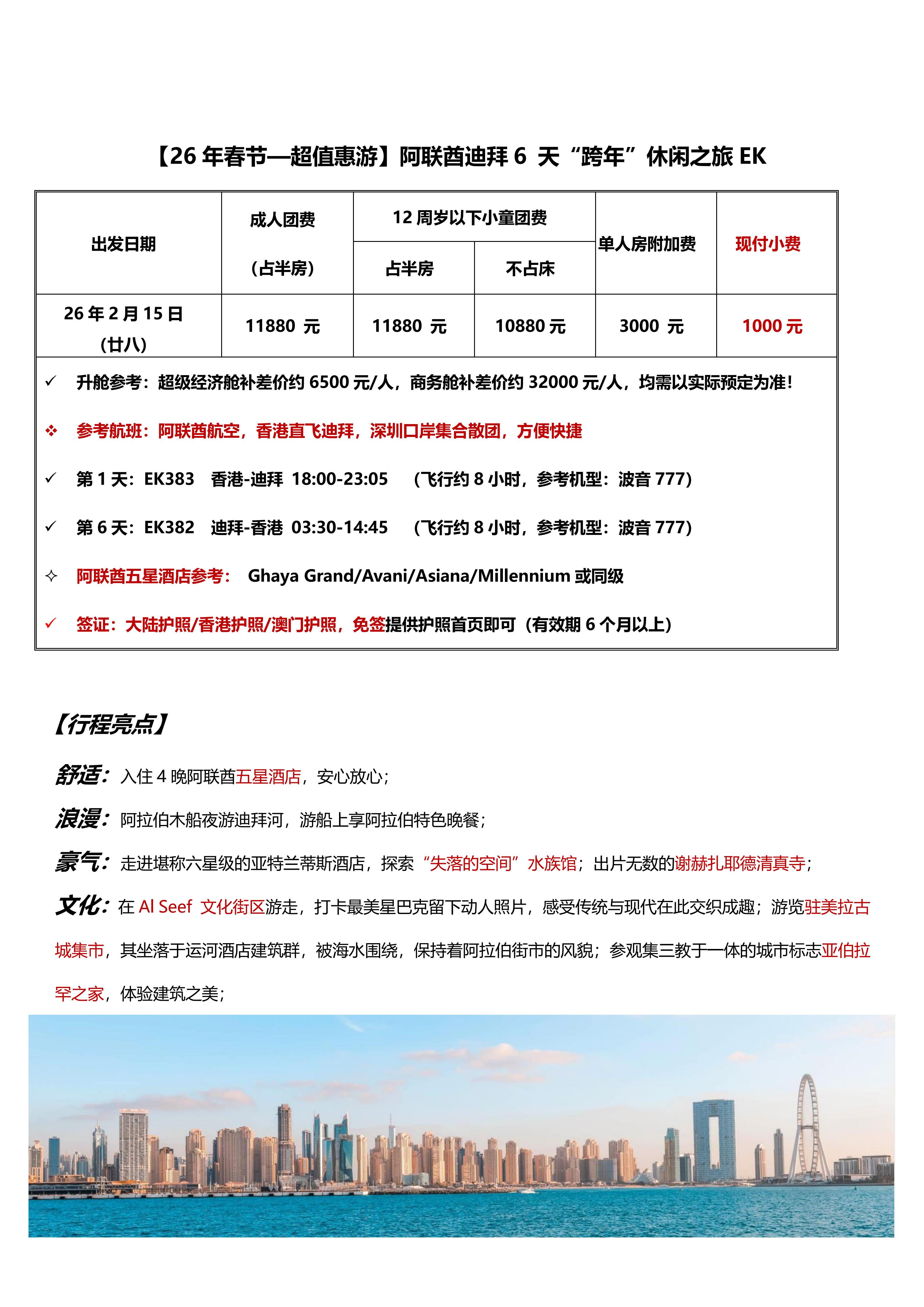 【春节特惠游】<阿联酋迪拜6天休闲之旅-深圳起止>木船徜徉迪拜河、棕榈岛、亚特兰蒂斯“失落的空间”水族馆、