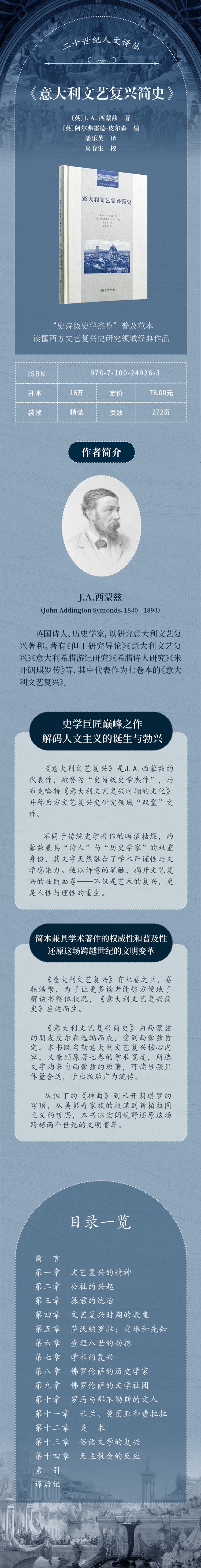 史学巨匠J. A.西蒙兹耗费十年完成的七卷本《意大利文艺复兴》被誉为“史诗级史学杰作”,与布克哈特的《意大利文艺复兴时期的文化》并称“双璧”。本书为其简本,既保留原著的学术深度与文采,又以流畅叙事聚焦核心:人文主义摆脱中世纪枷锁,在文学、艺术与科学领域迸发惊人的创造力。