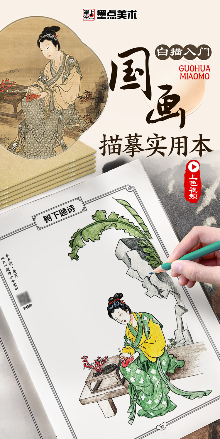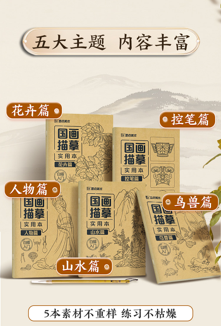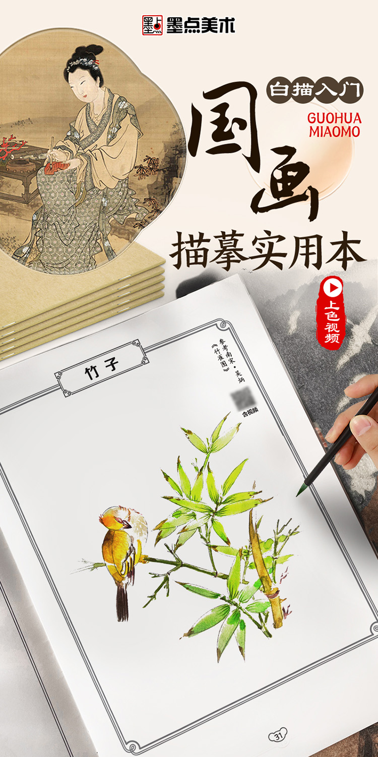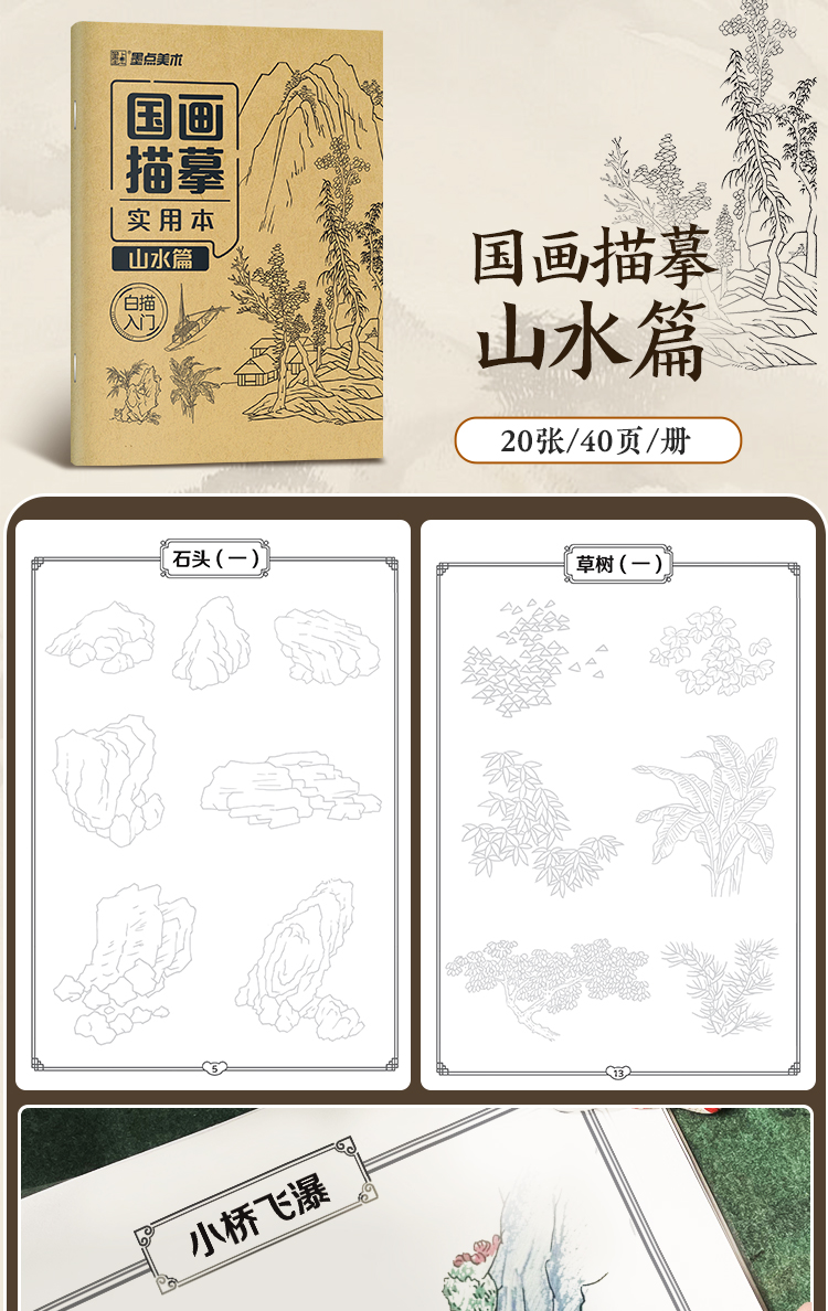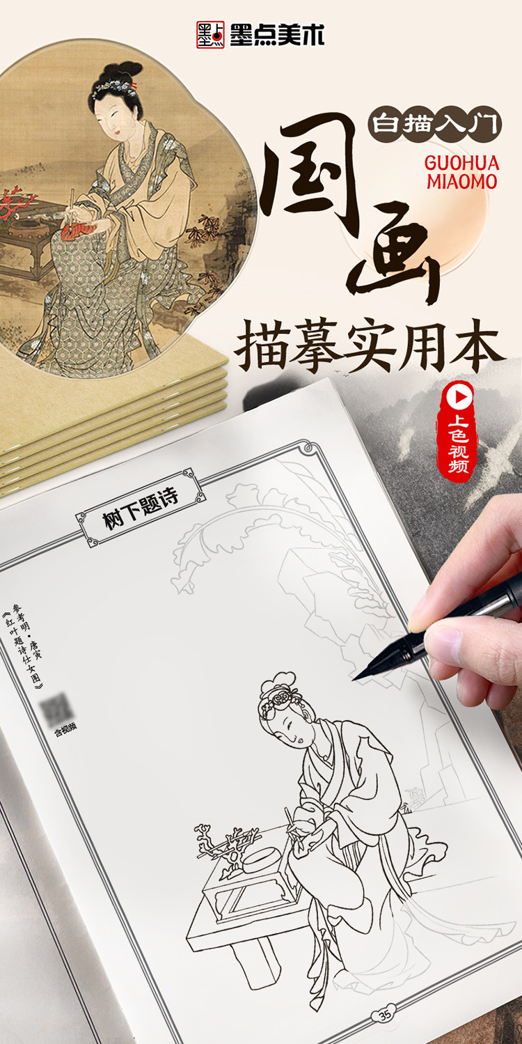 墨点美术 国画描摹实用本 白描入门描摹本国画工笔国风山水花卉鸟人物美术套装画本描红书初学者画画临摹画册毛笔绘画练习