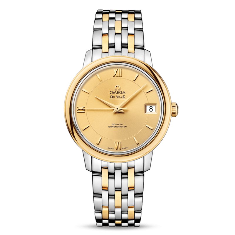 镜面材质 | 蓝宝石水晶玻璃 | 表盘 | 精钢-黄色18K金表壳 香槟色同心圆表盘,6、9及12时位置饰有金质罗马数字小时刻度。 表盘的3时位置设有日历窗口 |