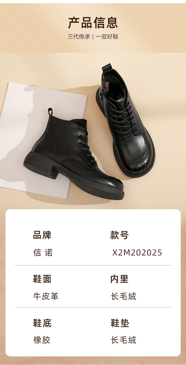 信诺棕色短靴女士2022新款冬季加绒保暖复古舒适真皮软底棉鞋皮鞋X2M202025