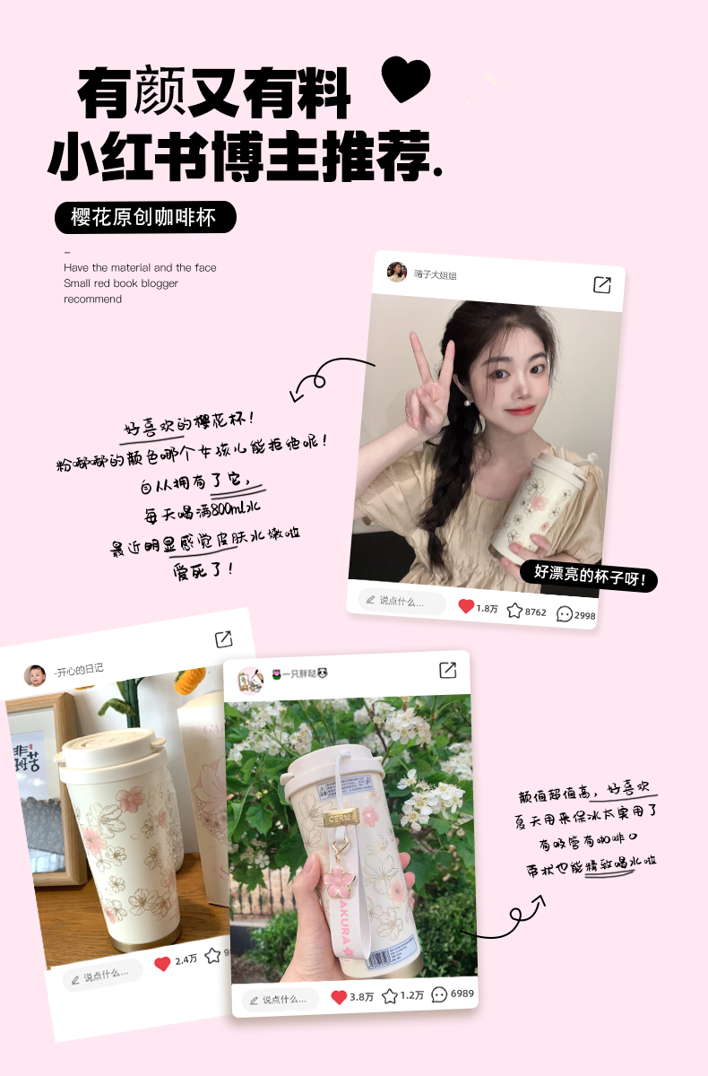 GERM/格沵 花语系列闪耀咖啡杯500ml 樱花 新款咖啡杯不锈钢吸管杯女生生日礼物实用轻奢感