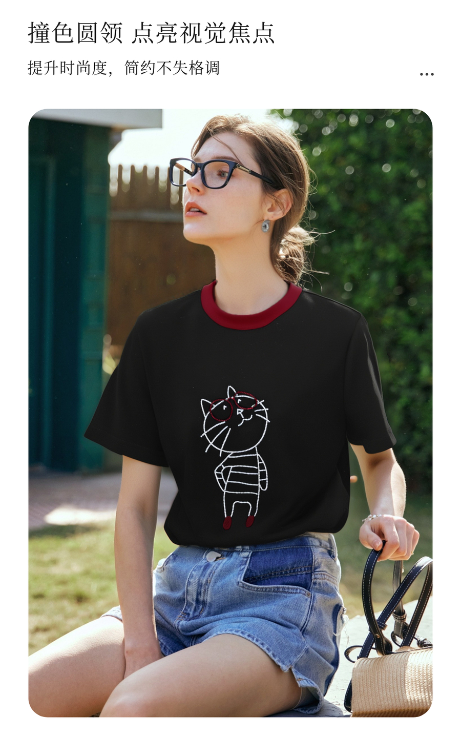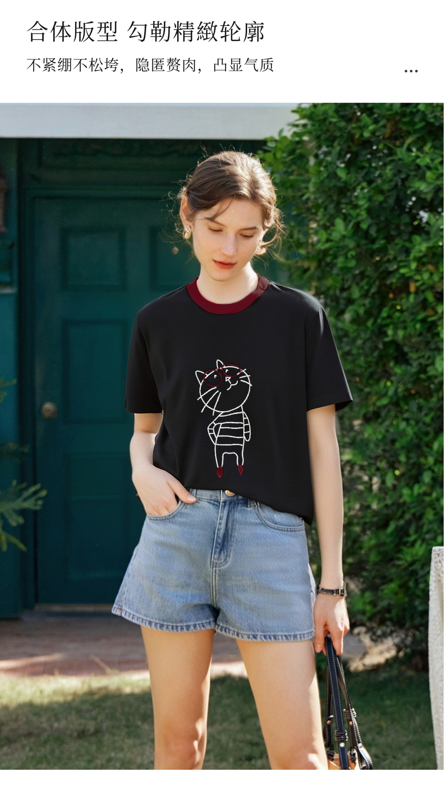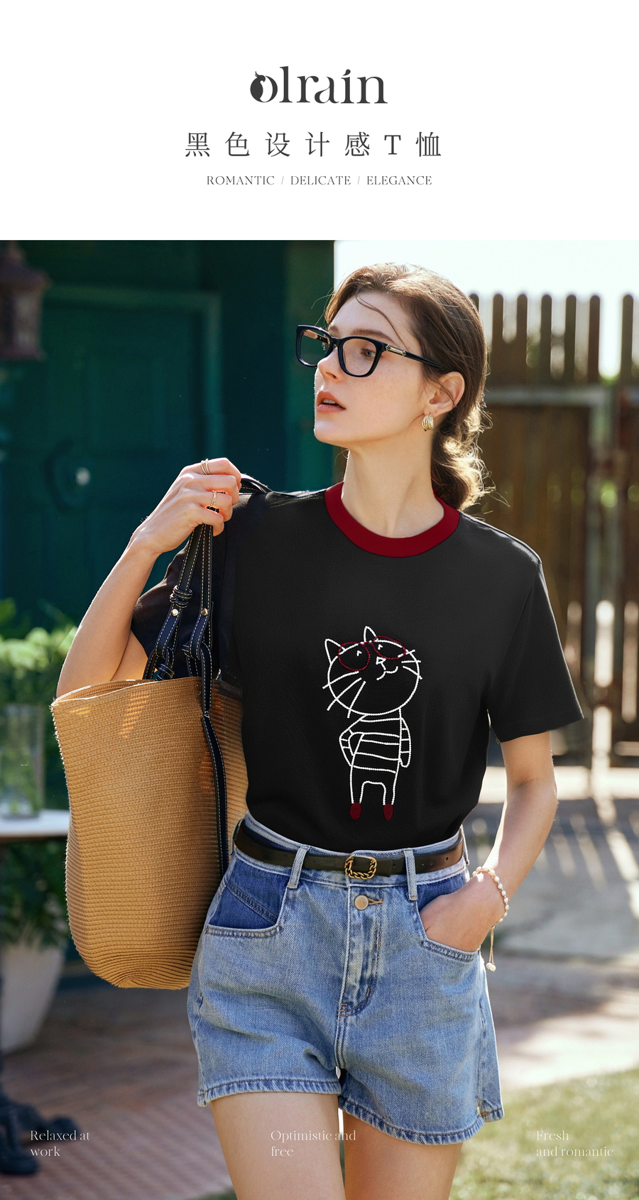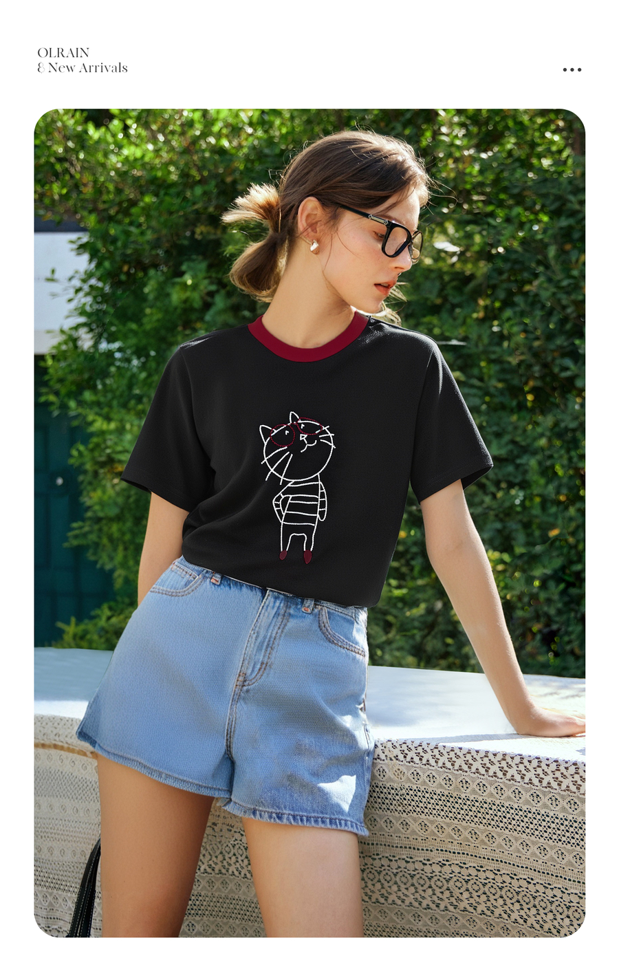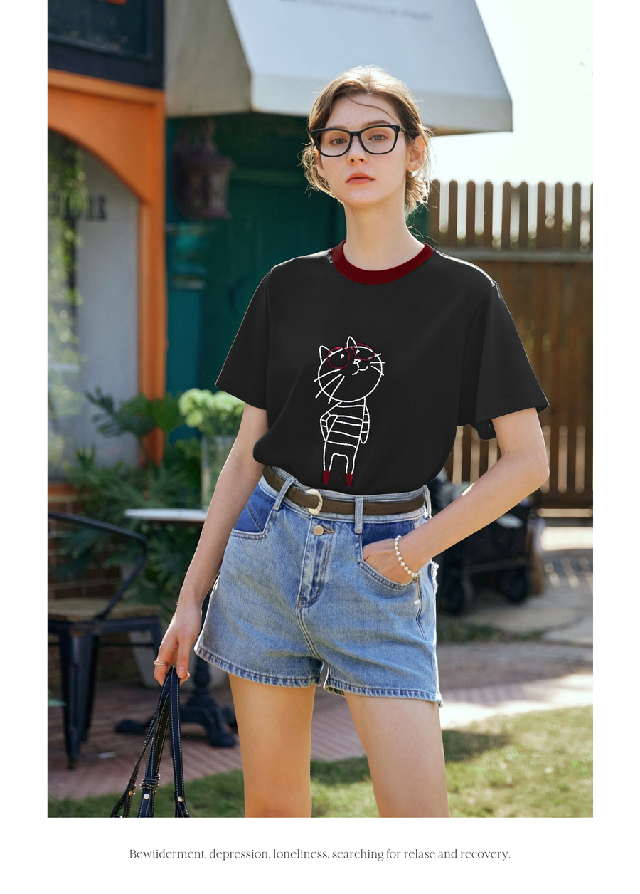 OLrain欧芮儿黑色设计感T恤女夏季2025新款卡通猫咪减龄撞色上衣
