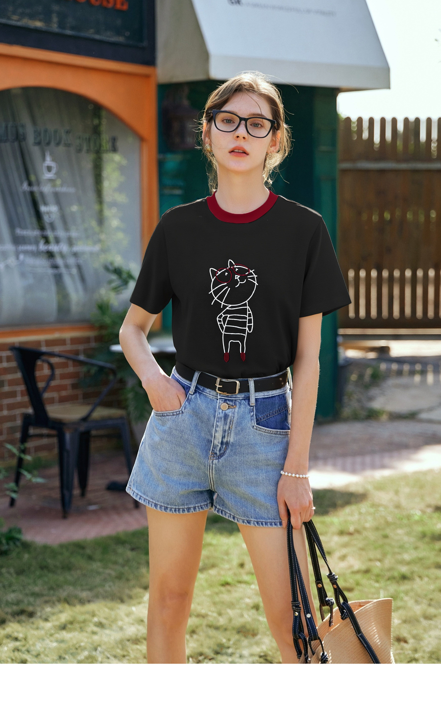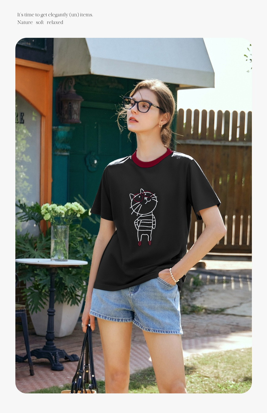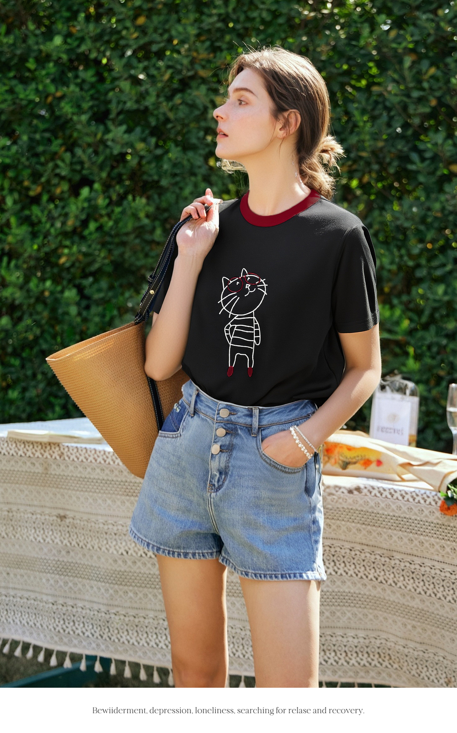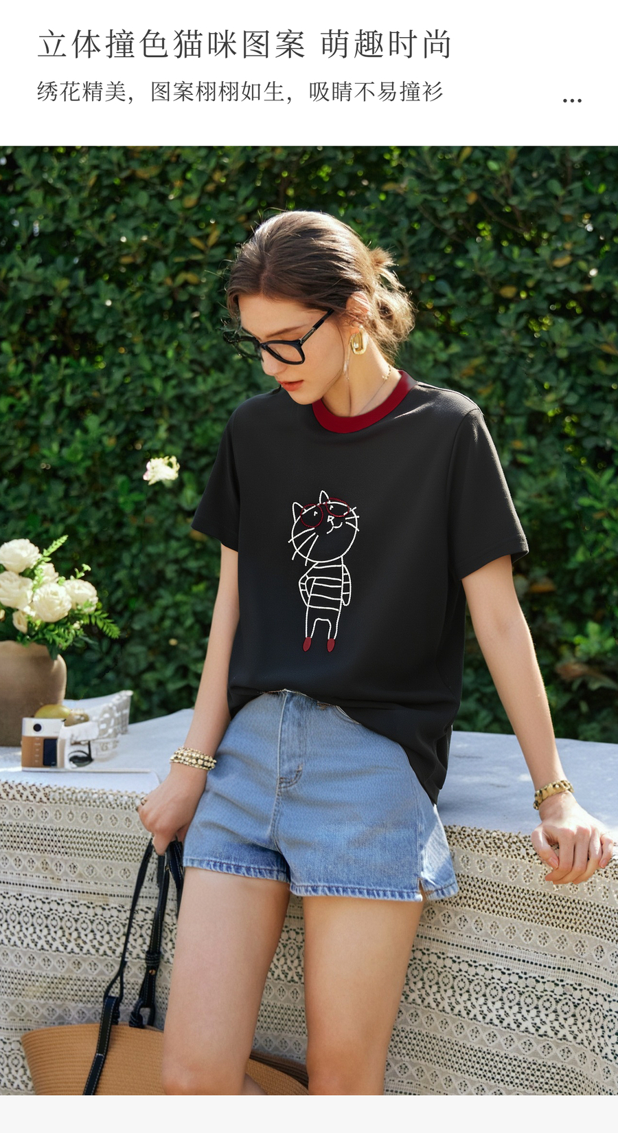 OLrain欧芮儿黑色设计感T恤女夏季2025新款卡通猫咪减龄撞色上衣