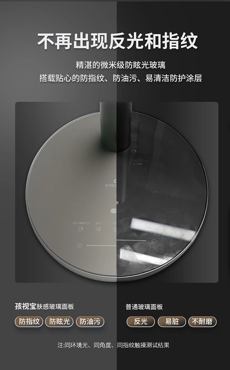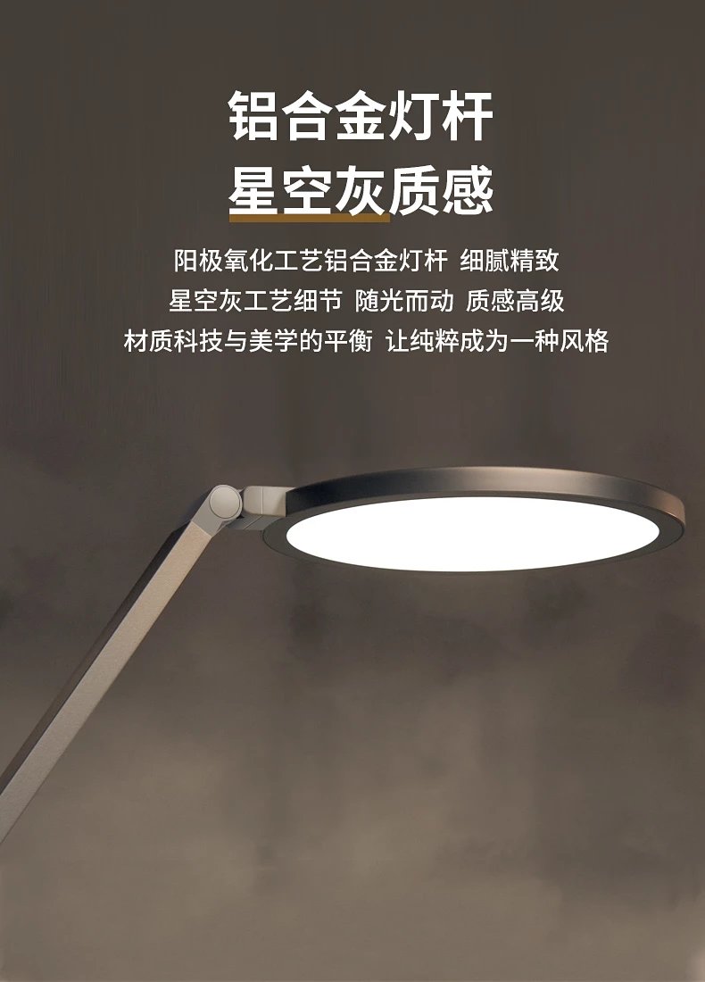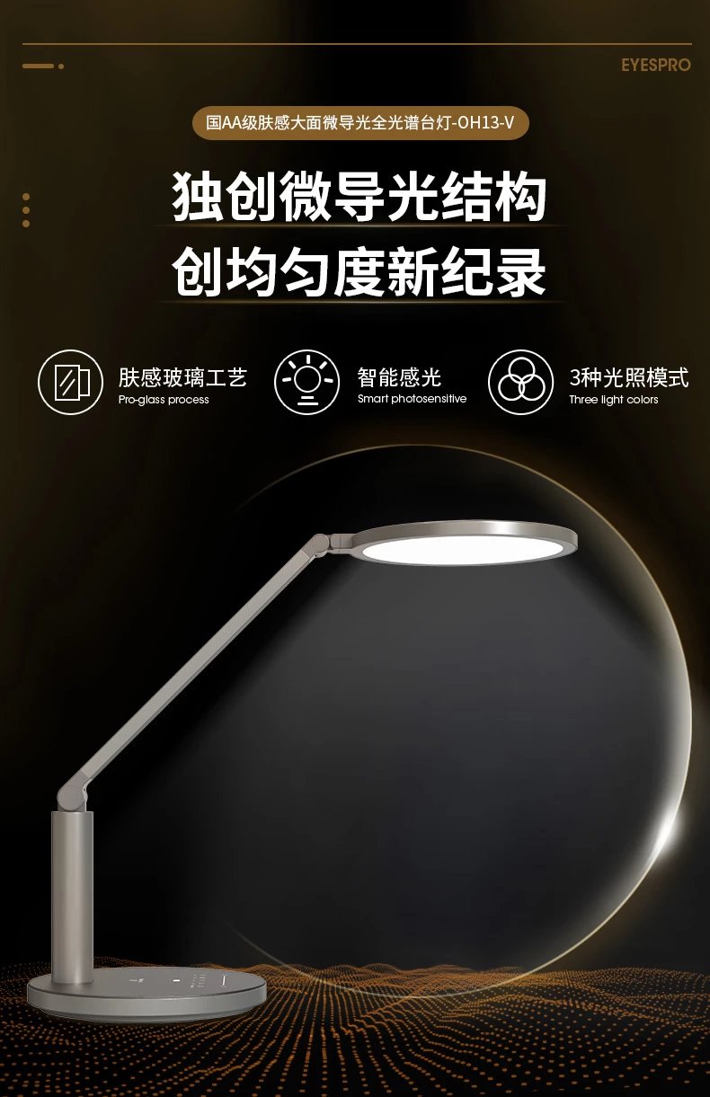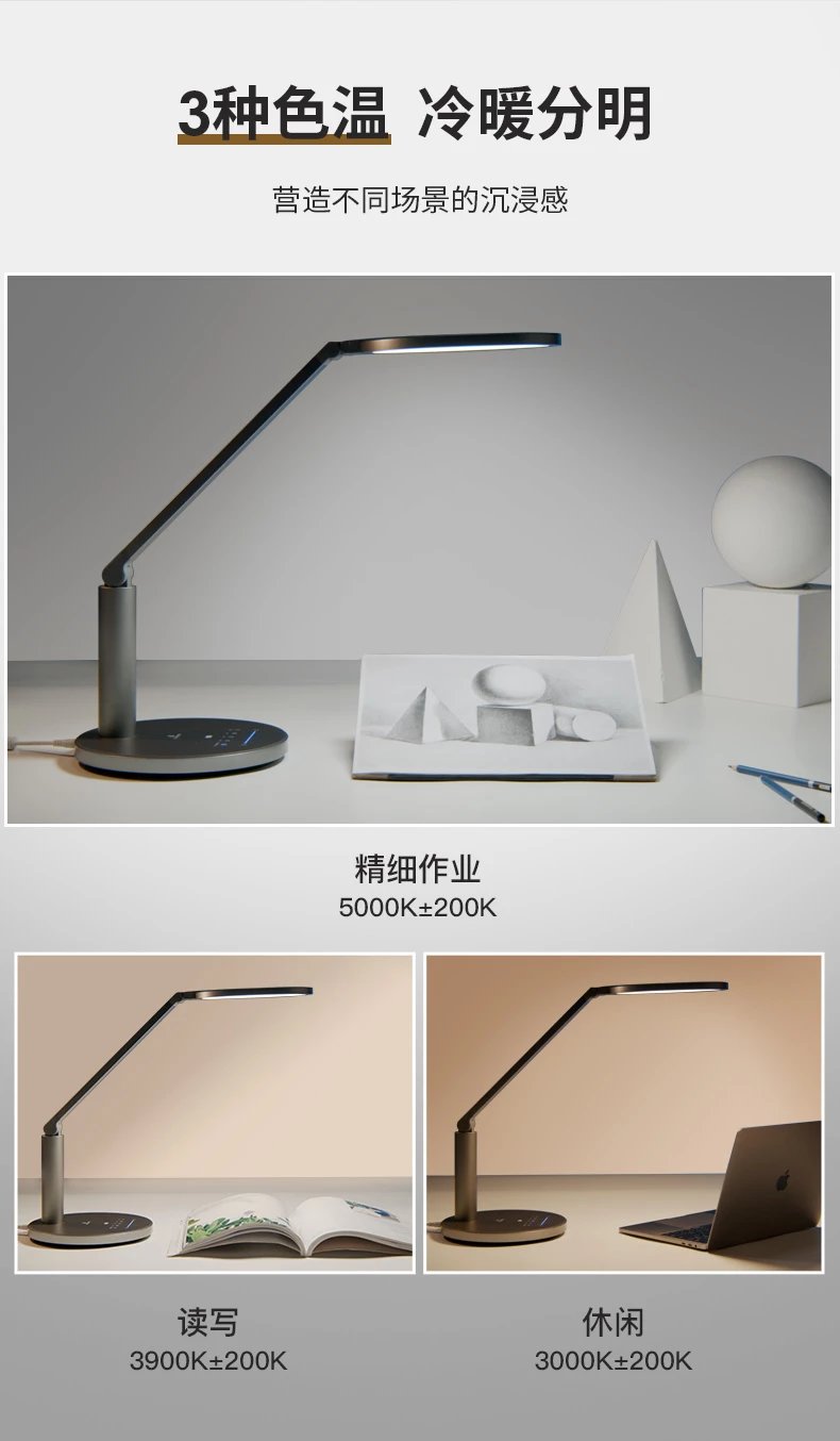 【产品介绍】 1. 1.95国AA级均匀度 2. 18.15CM微导光结构光源 3. “瞳”感应智能调光 4. 3档色温,适应不同场景 5. 学习补光+夜间照明两用小夜灯 6. 肤感玻璃操作面板,防眩防纹