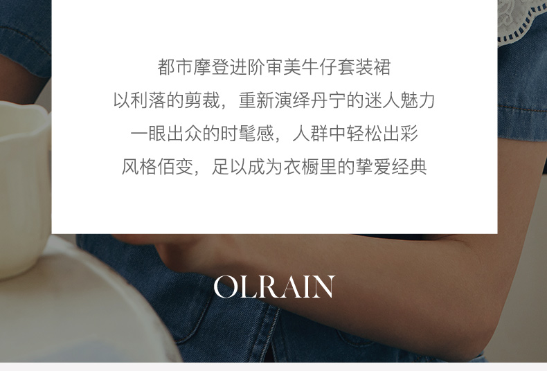 - “精致”是欧芮儿olrain品牌文化的核心,欧芮儿认为,精致的女人,不但要外在动人,更要内在迷人,内外兼修,有魅力、有气质、有内涵,自信而不自傲,优雅而不矫揉,自有万种风情而不轻浮,更不故作矜持。