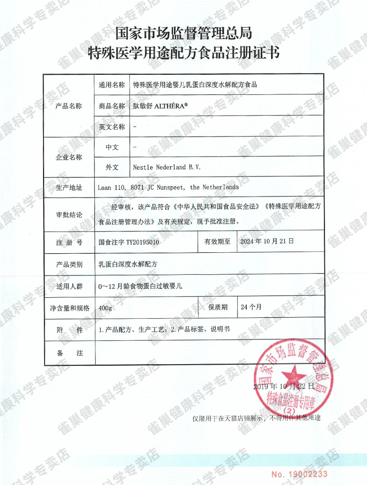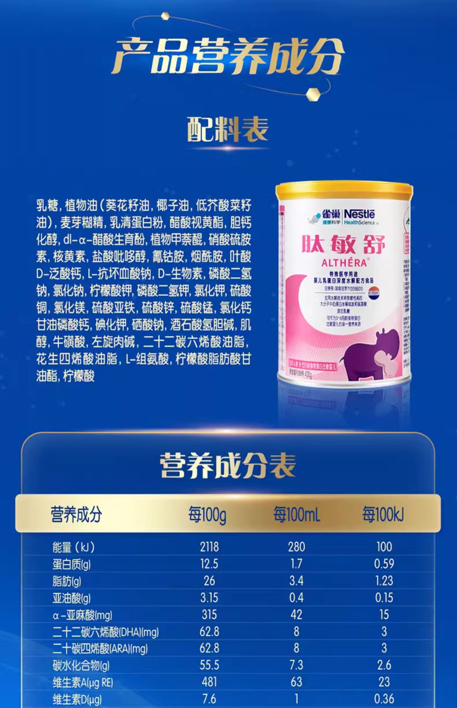 雀巢(特配)肽敏舒营养配方粉(含乳糖深度水解配方/QUC-40807